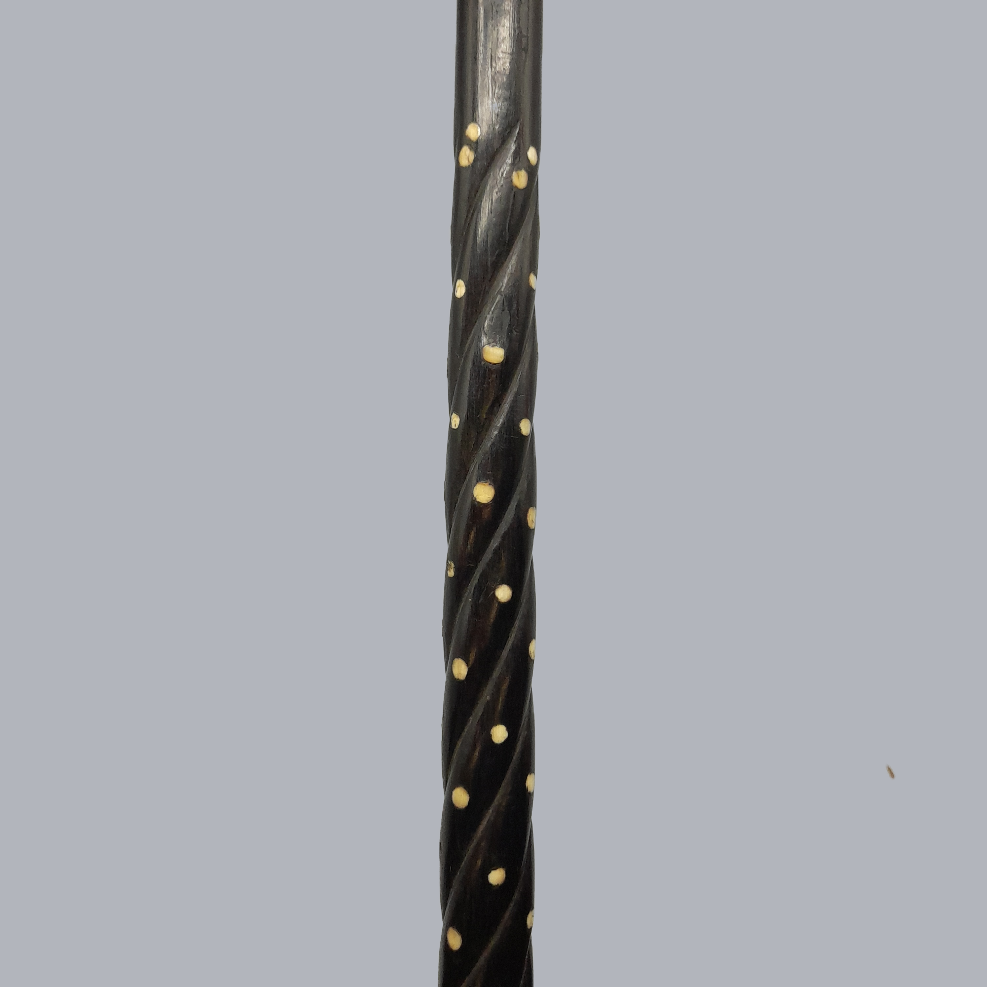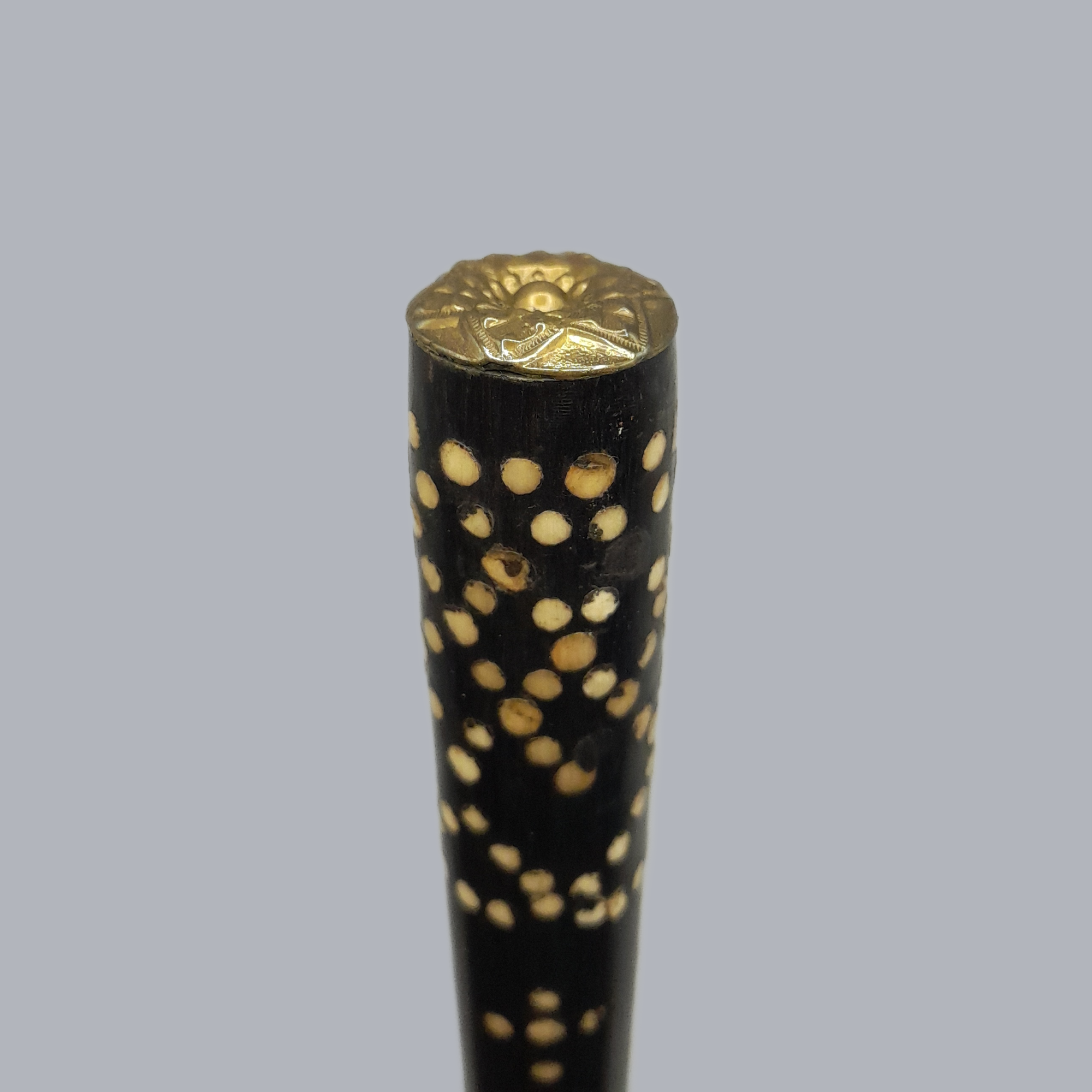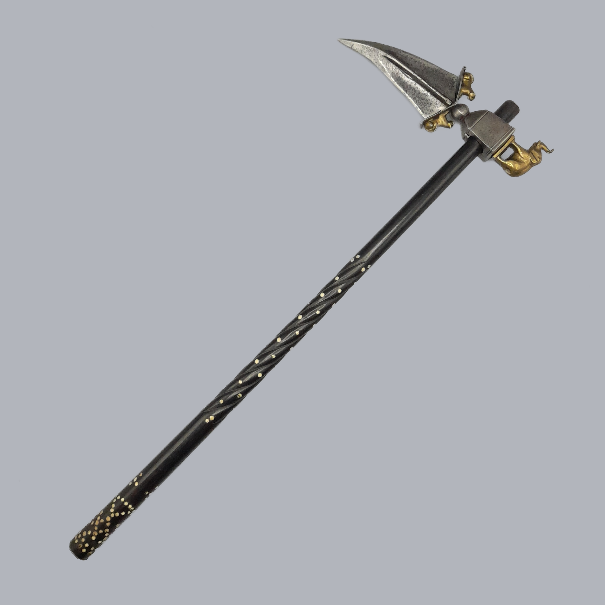 A 19th Century Indian Zaghnal Warhammer/War axe originating from India. A strong, steel axe head fitted onto a wooden rod. Axe head is decorated with brass lions and an elephant, which works as both counterbalance weight for the head as well as bearing religious and spiritual symbolism, relating to the Hindu deity Ganesh. Handle made of painted and carved wood with bone inlays in the form of little dots running down the rod.