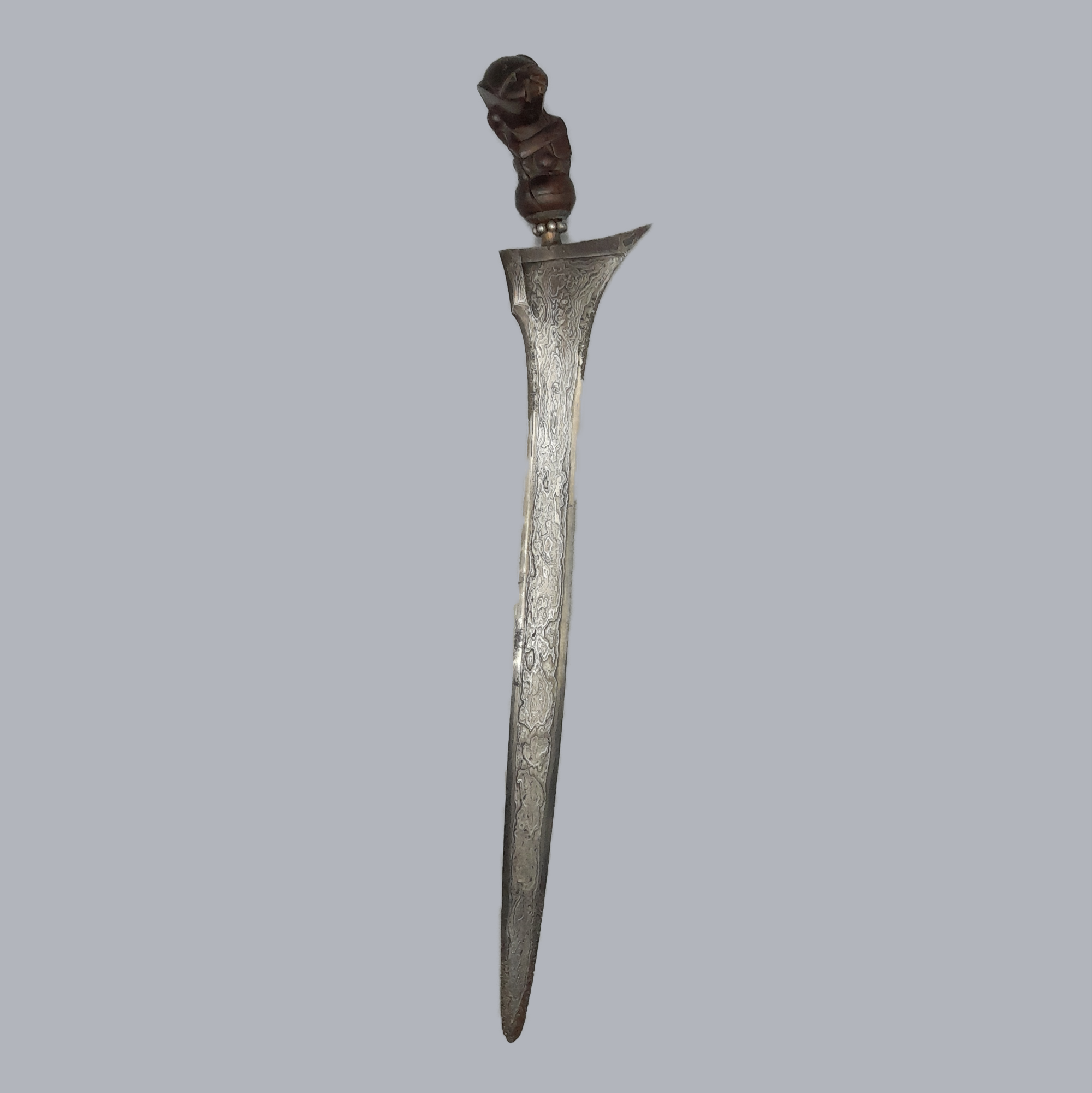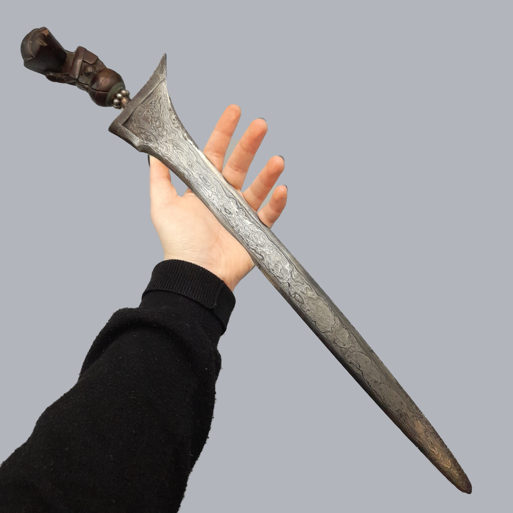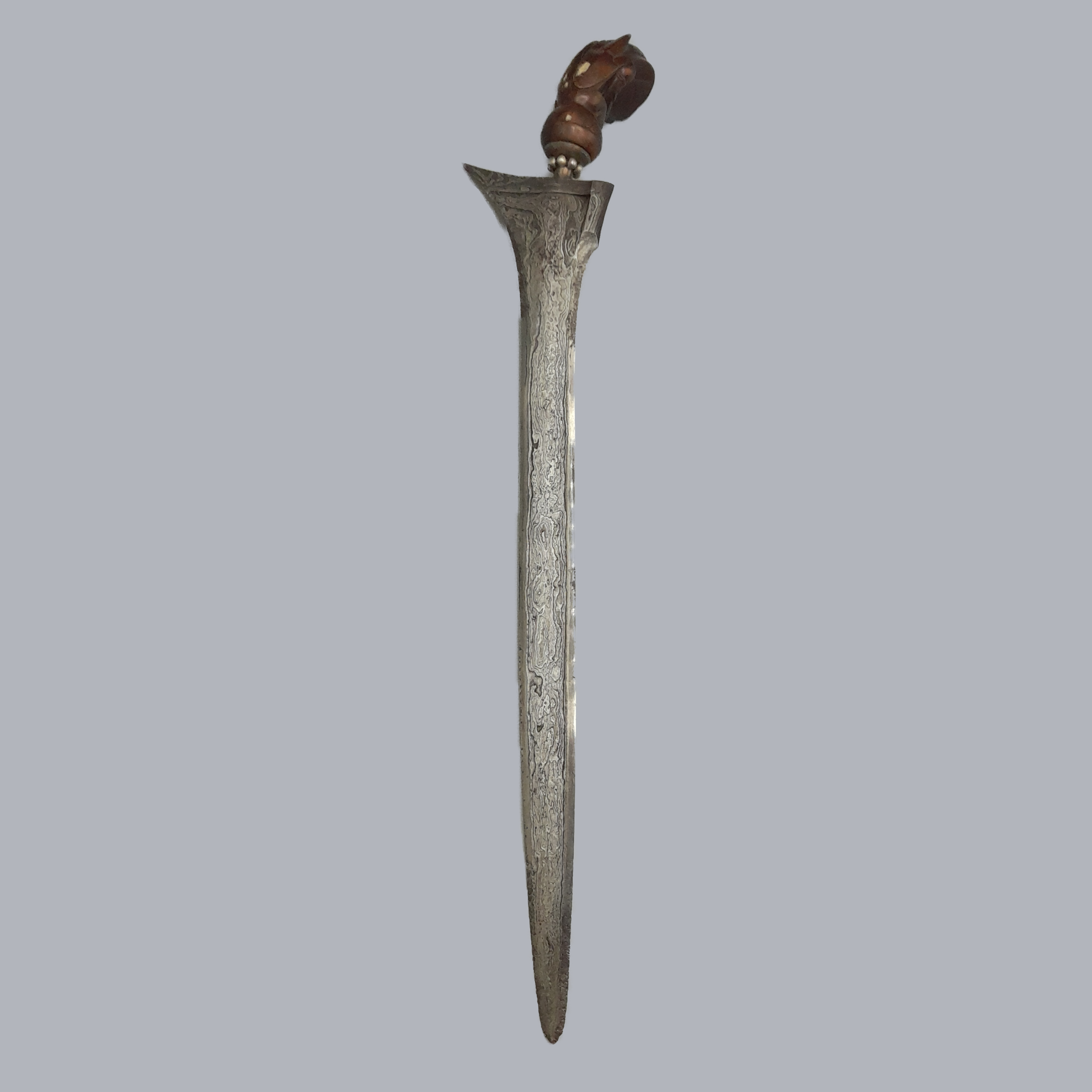 A Sumatran Kris knife, also called a Keris Bahari, from approx. mid 18th century to early 19th century. A beautiful pattern-welded straight iron blade with a well-carved wooden pommel fitted to a brass handle. This Kris does not come with a scabbard.
