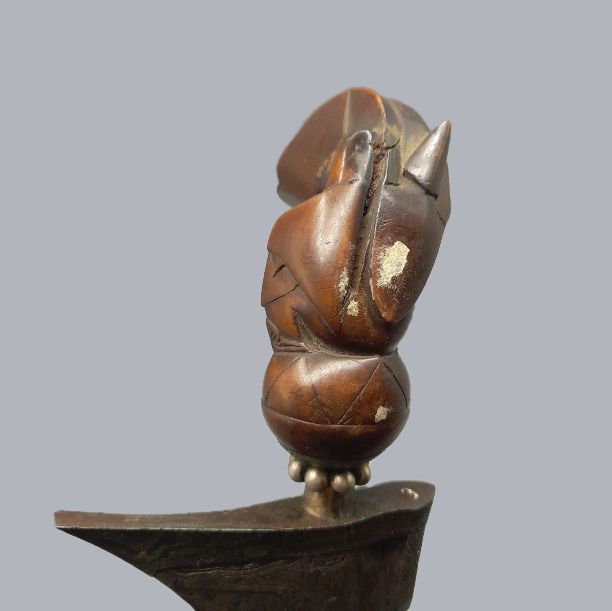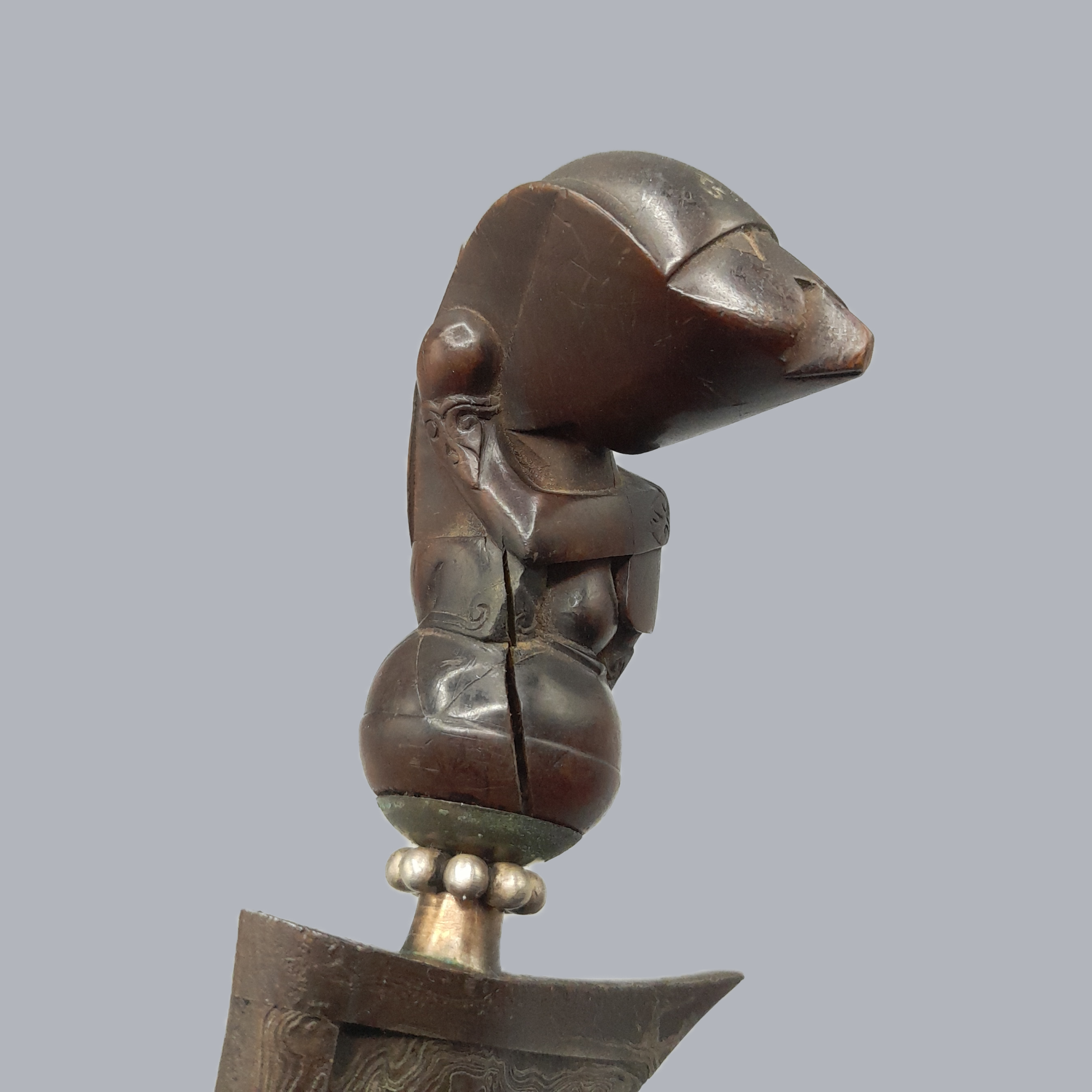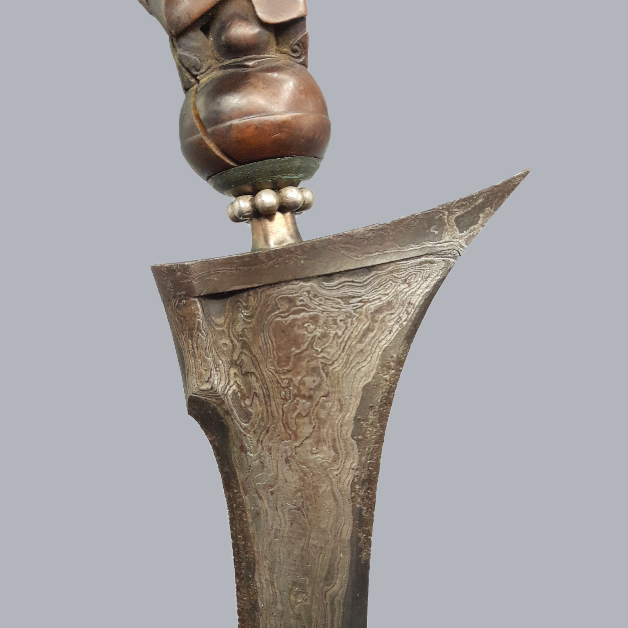 A Sumatran Kris knife, also called a Keris Bahari, from approx. mid 18th century to early 19th century. A beautiful pattern-welded straight iron blade with a well-carved wooden pommel fitted to a brass handle. This Kris does not come with a scabbard.