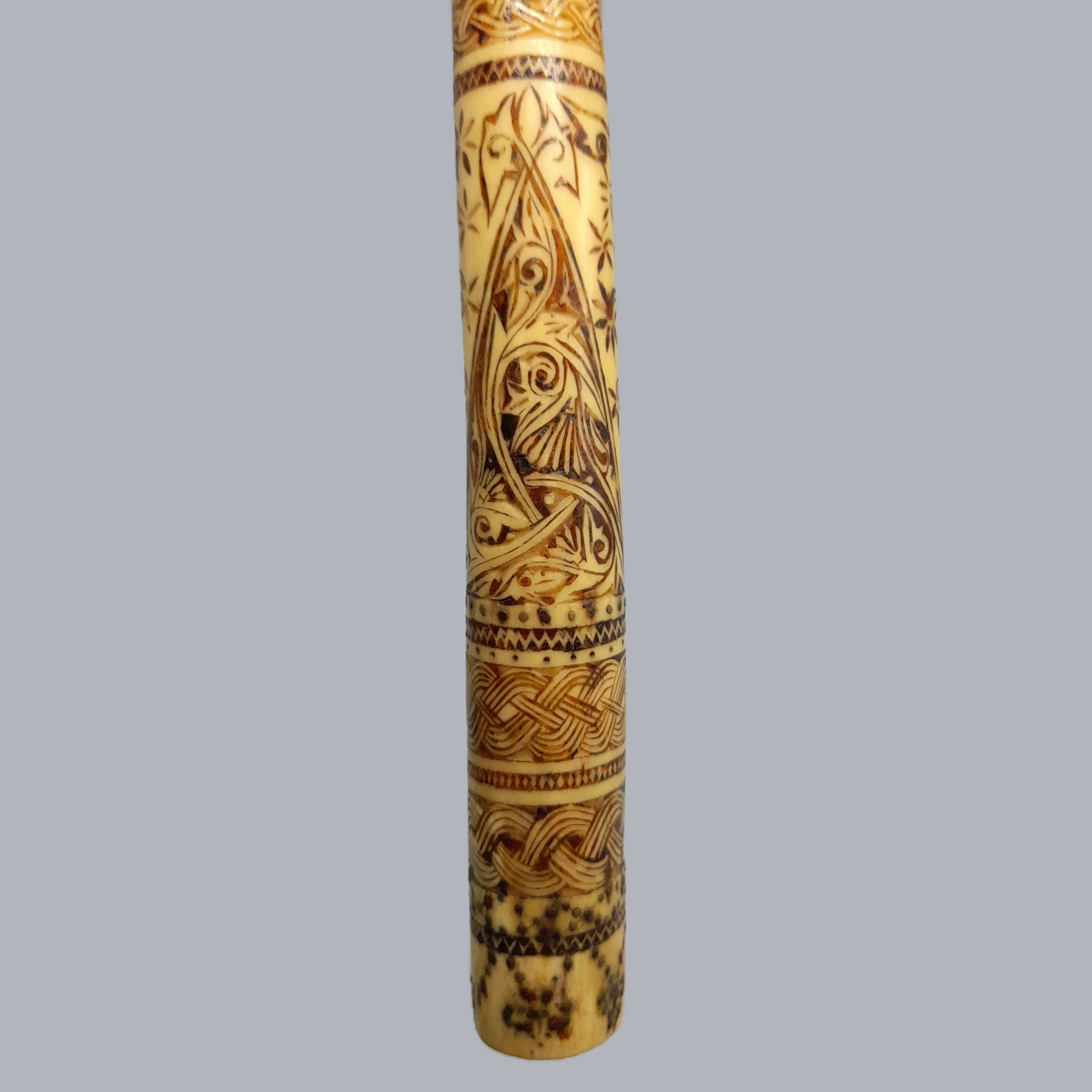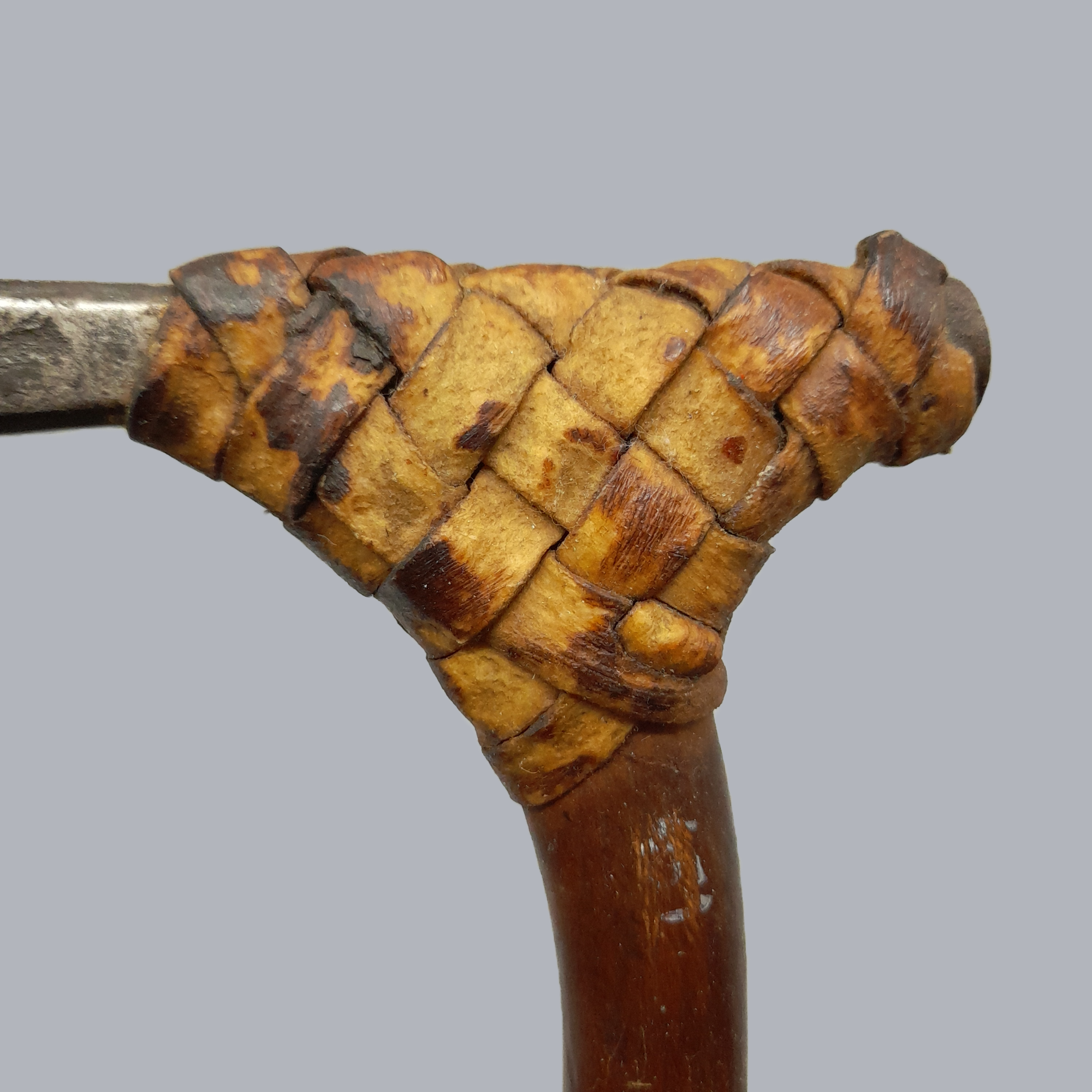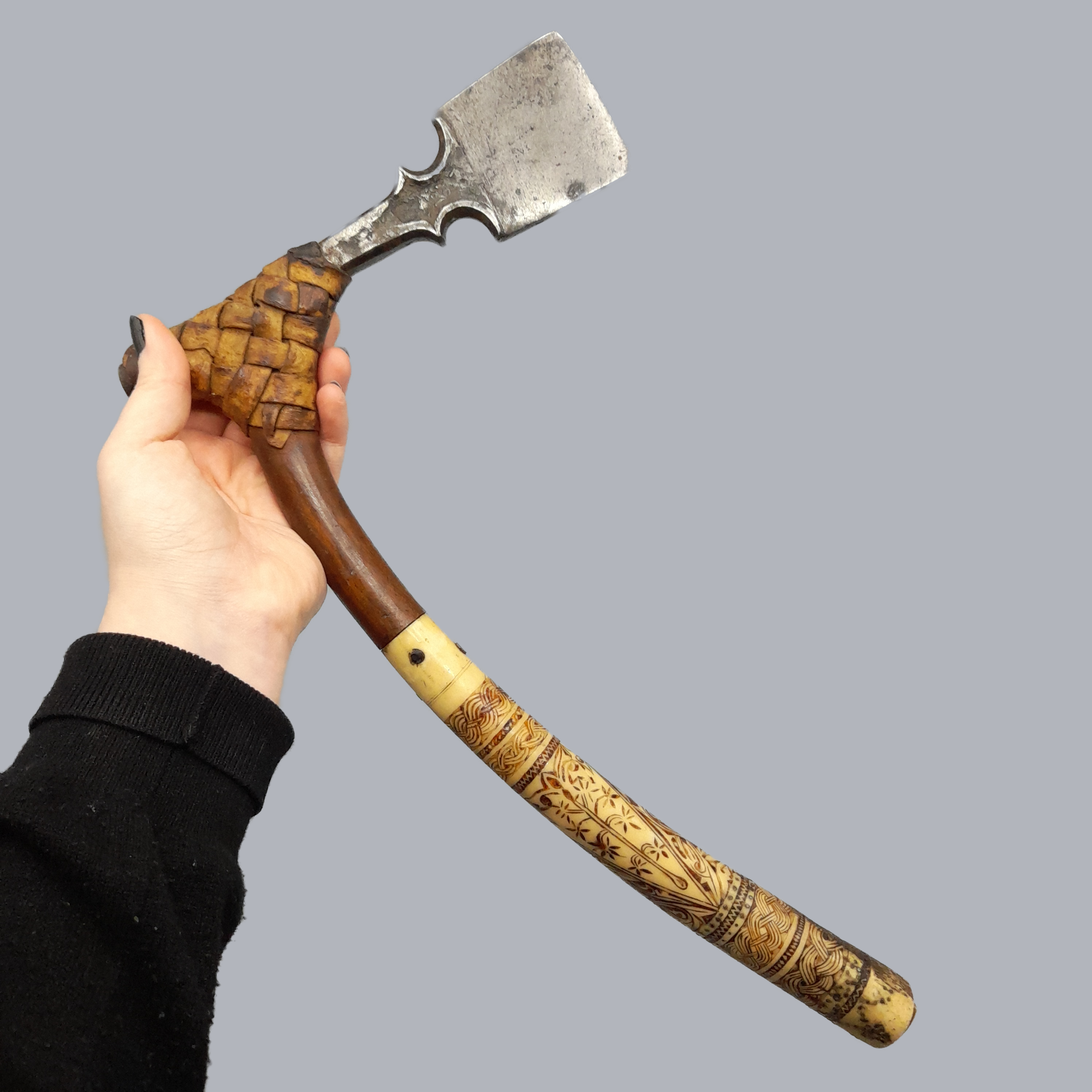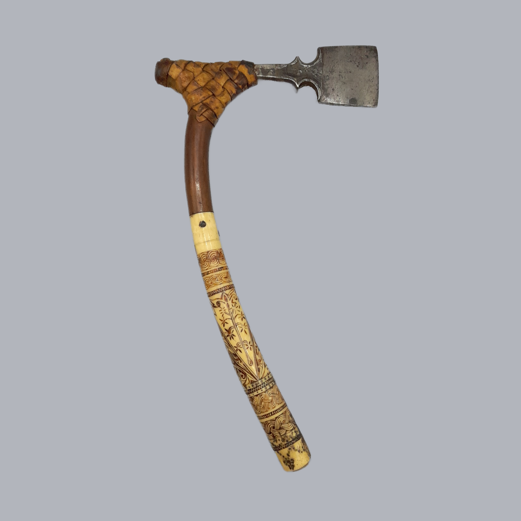 A small metal blade attached with split cane lashing to the curved handle. Handle is made of both wood and bone, with the bone part of the handle being beautifully carved with floral and weaving patterns. This adze seems to differ from its other counterparts by having its blade be parallel to the handle, rather than perpendicular.