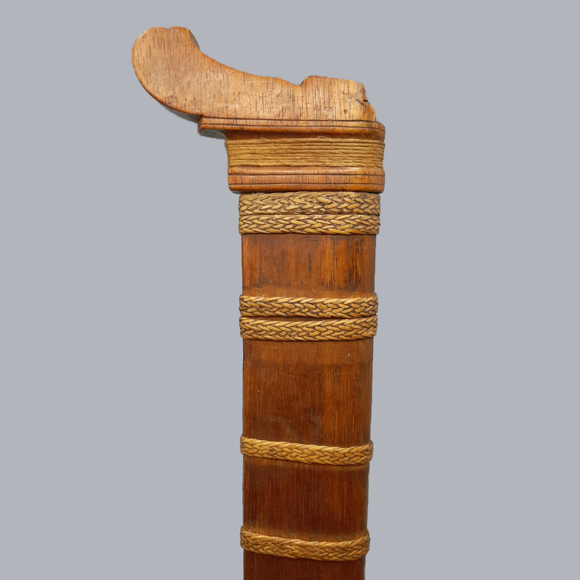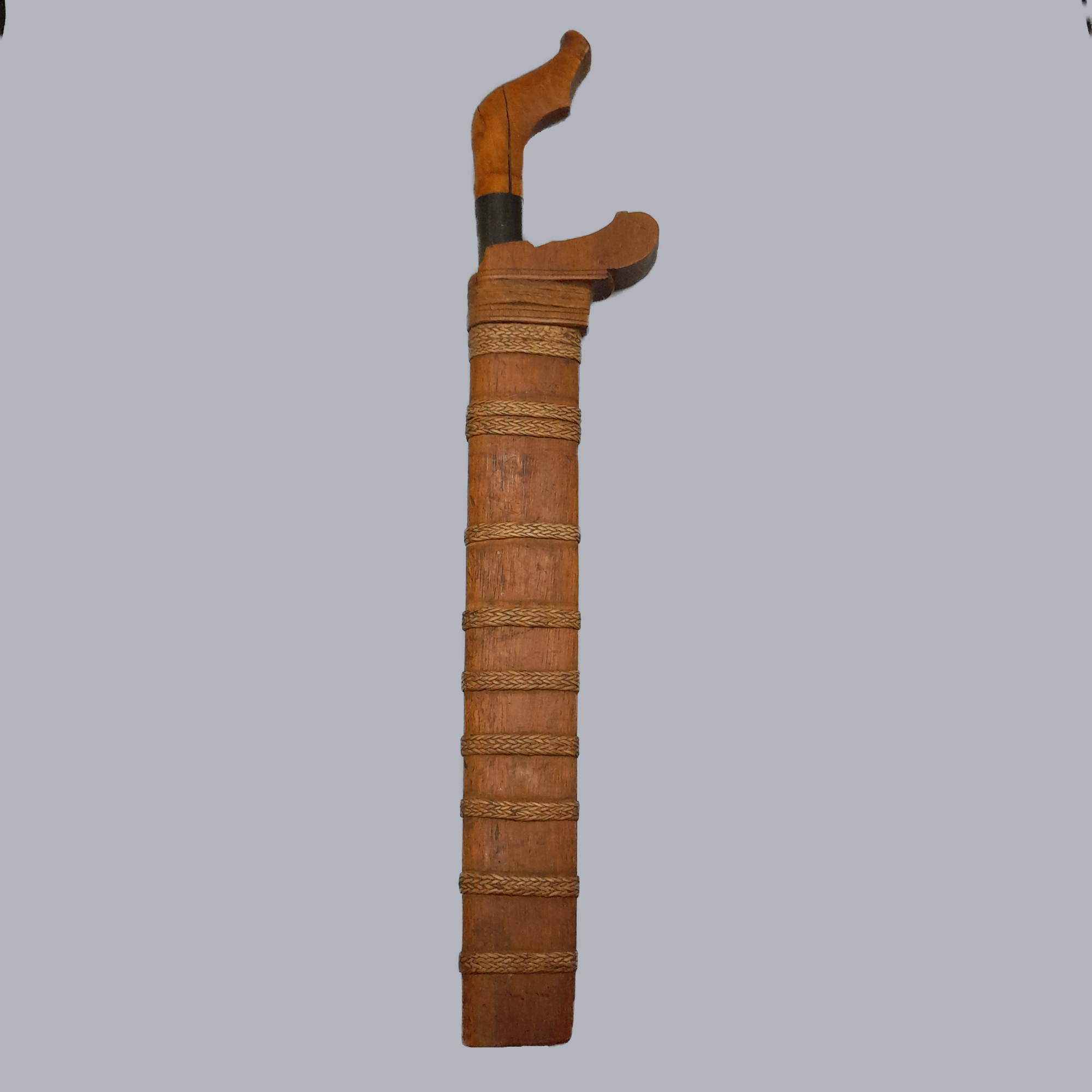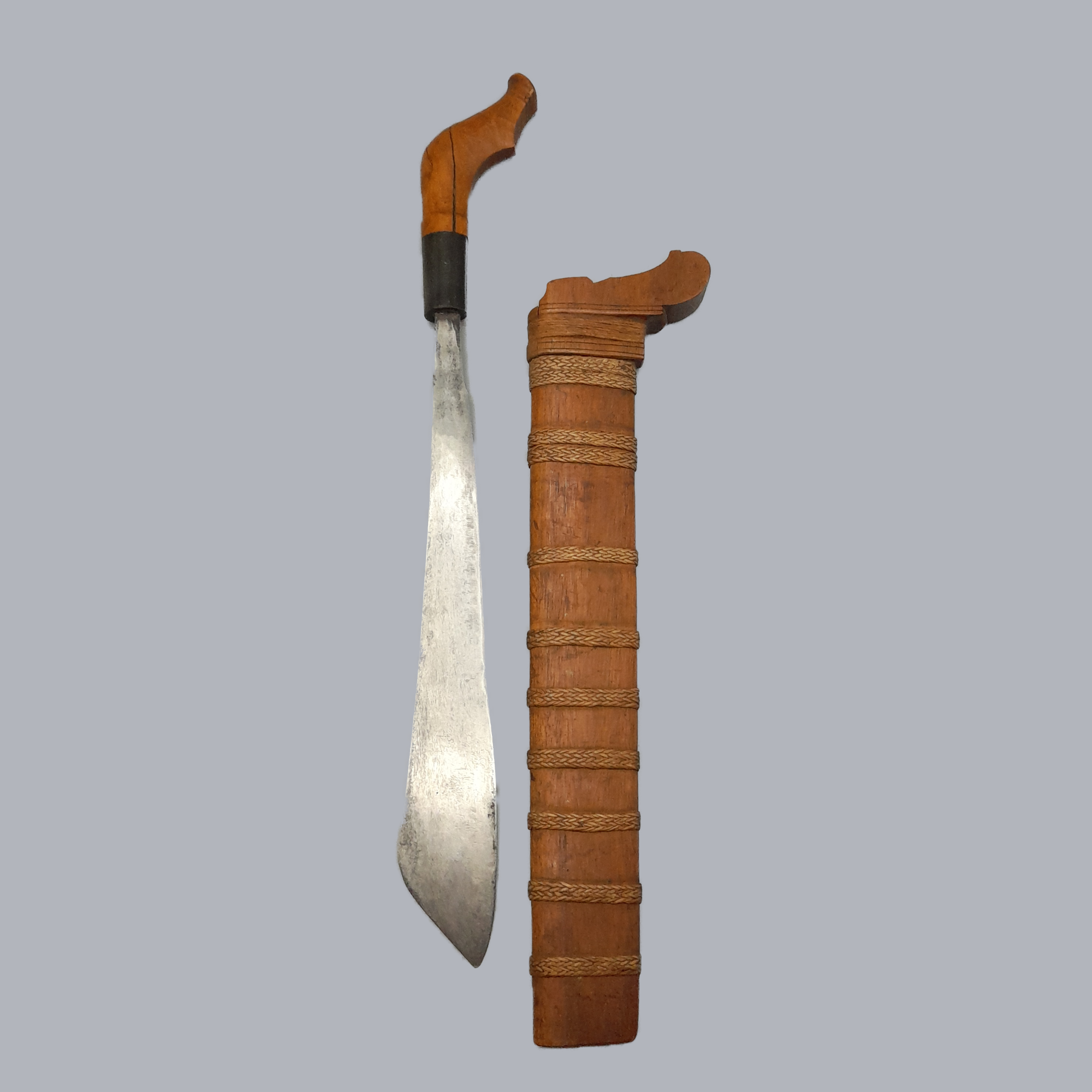 A sumatran pedang dagger originating from Indonesia, c. 19th century. A wide, unfullered and single-edged steel blade. A hardwood scabbard with woven reed decorations around it. Handle is made of carved hardwood as well.
