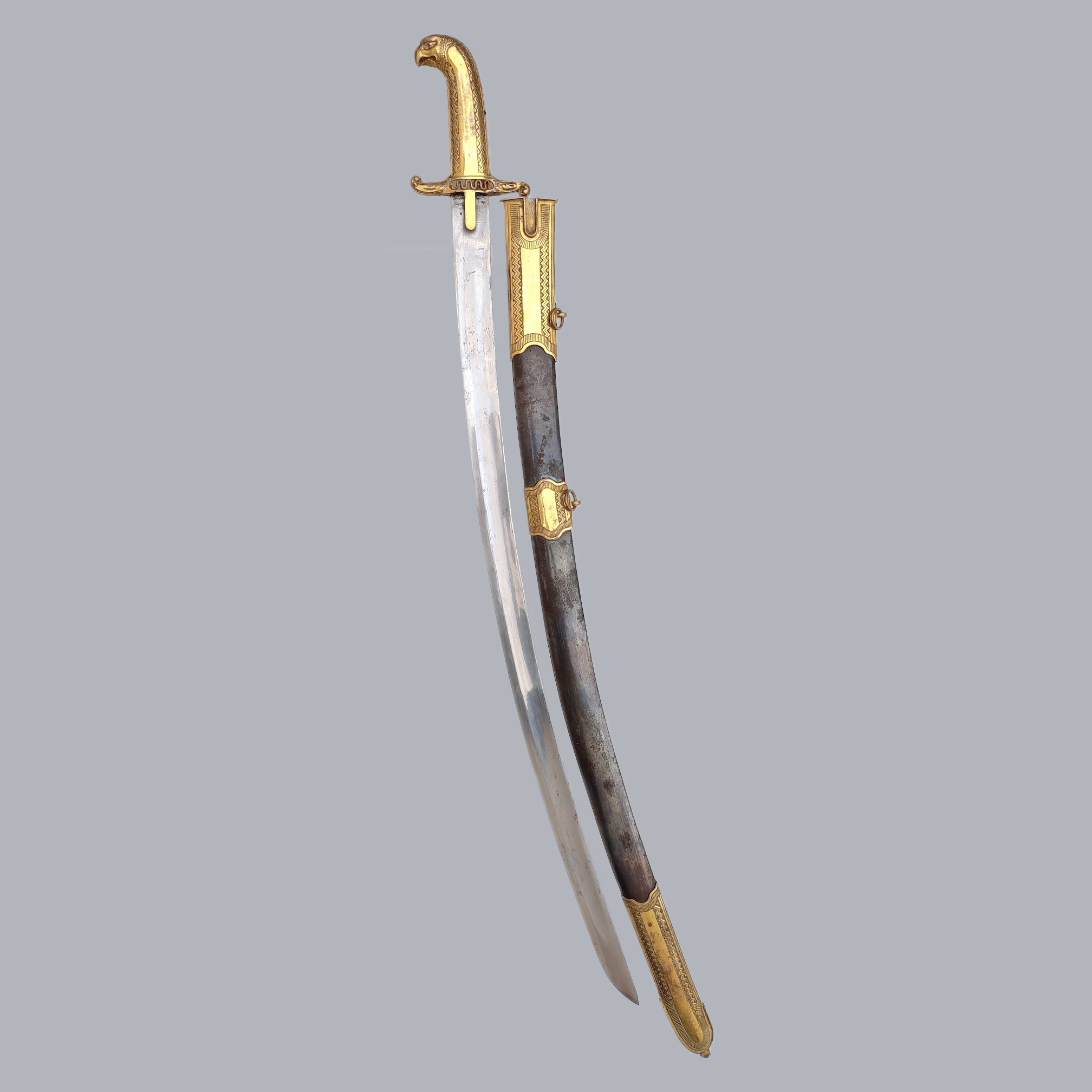 A very fine officer sabre with a gilded bronze eagle-headed hilt. The crossguard has small langets fitting to its blued scabbard with gilt bronze mounts. All gilded parts are decorated with geometrical patterns and a snake is depicted in the middle of the crossguard. The higly polished steel blade has a wide fuller. No markings visible.