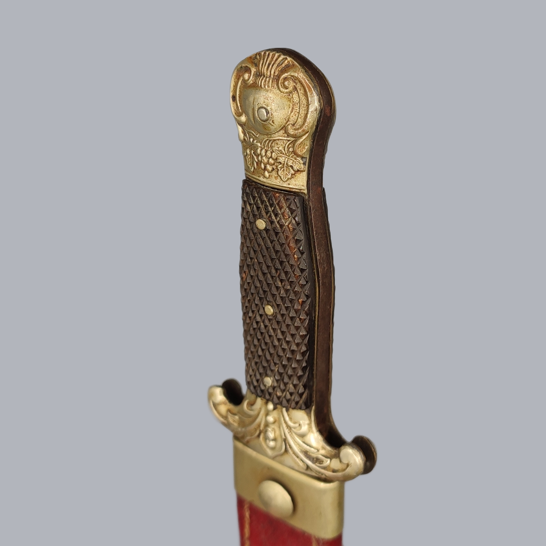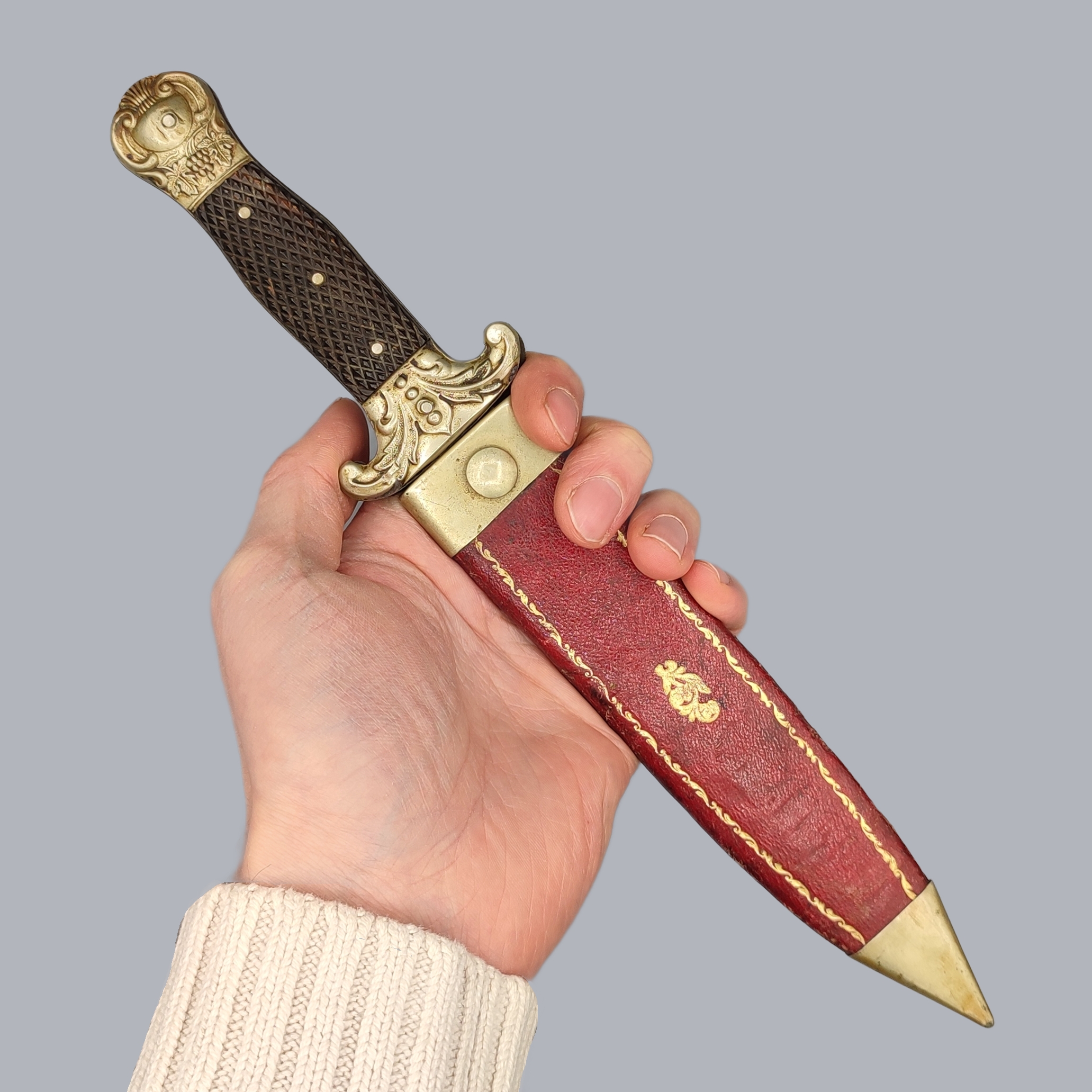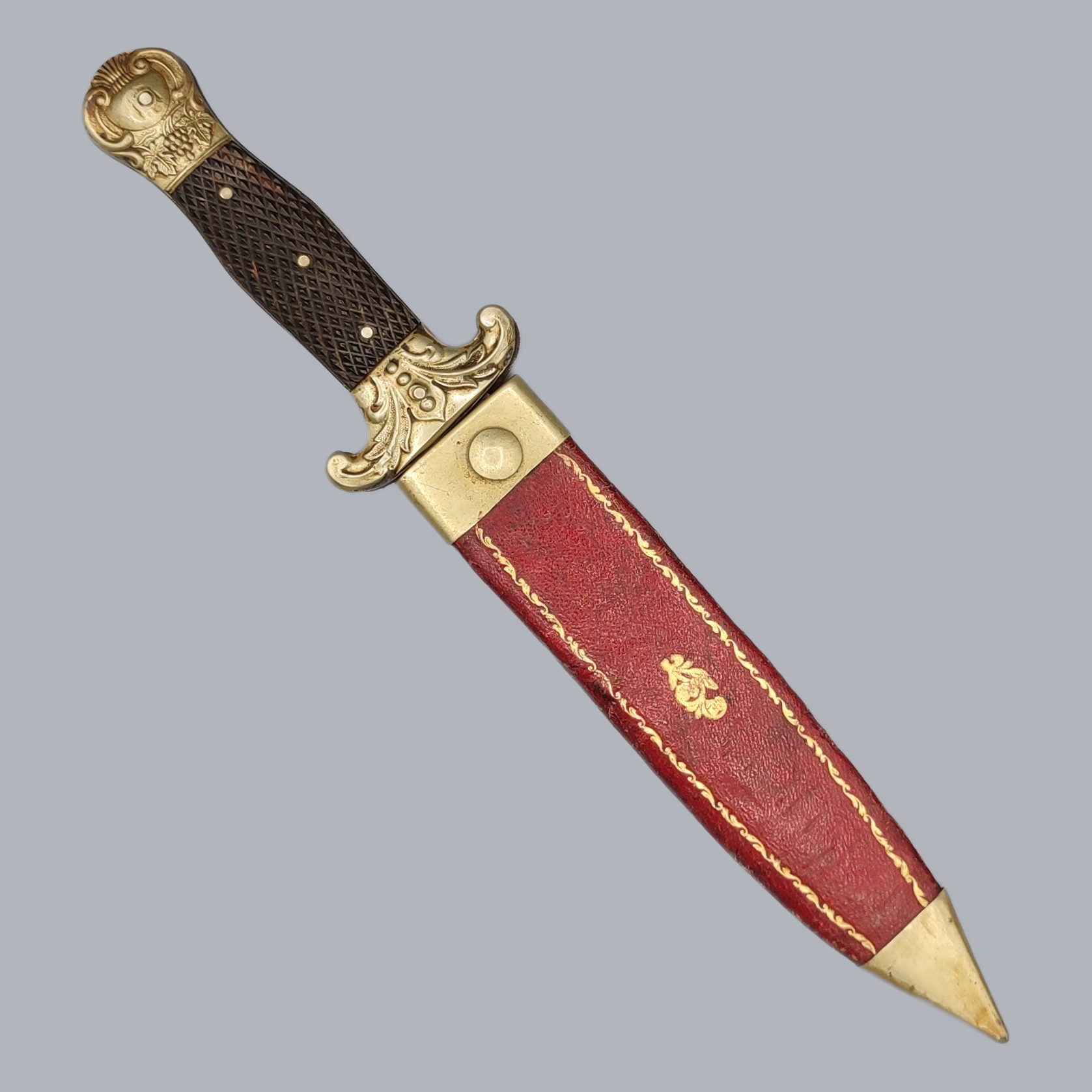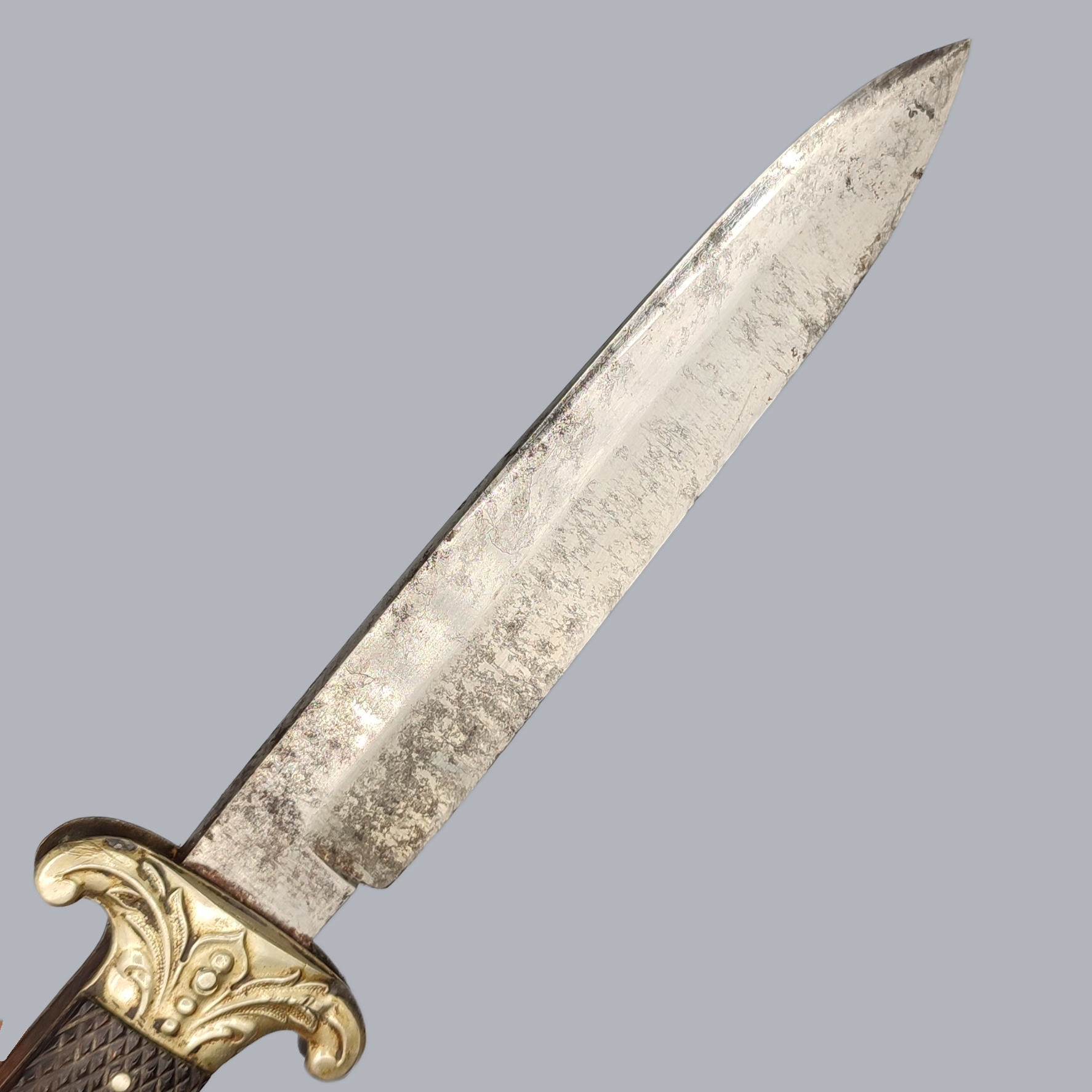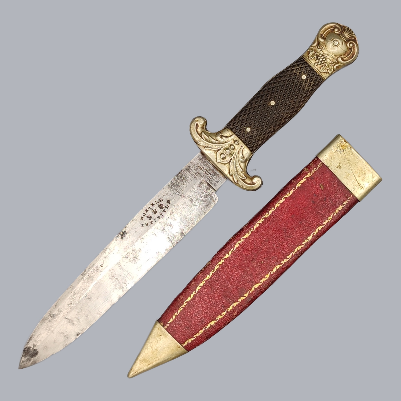 An antique English bowie knife manufactured by O’Neill & Thompson workshop in Sheffield, England, approximately in the 1850s. The nickelsilver handle is finished with a chequered horn grip scales. The steel blade is marked by the manufacturer: NON XXL SHEFFIELD O’NEILL & THOMPSON NASSAU ST”. The nickelsilver-mounted leather sheath is decorated with golden floral patterns.