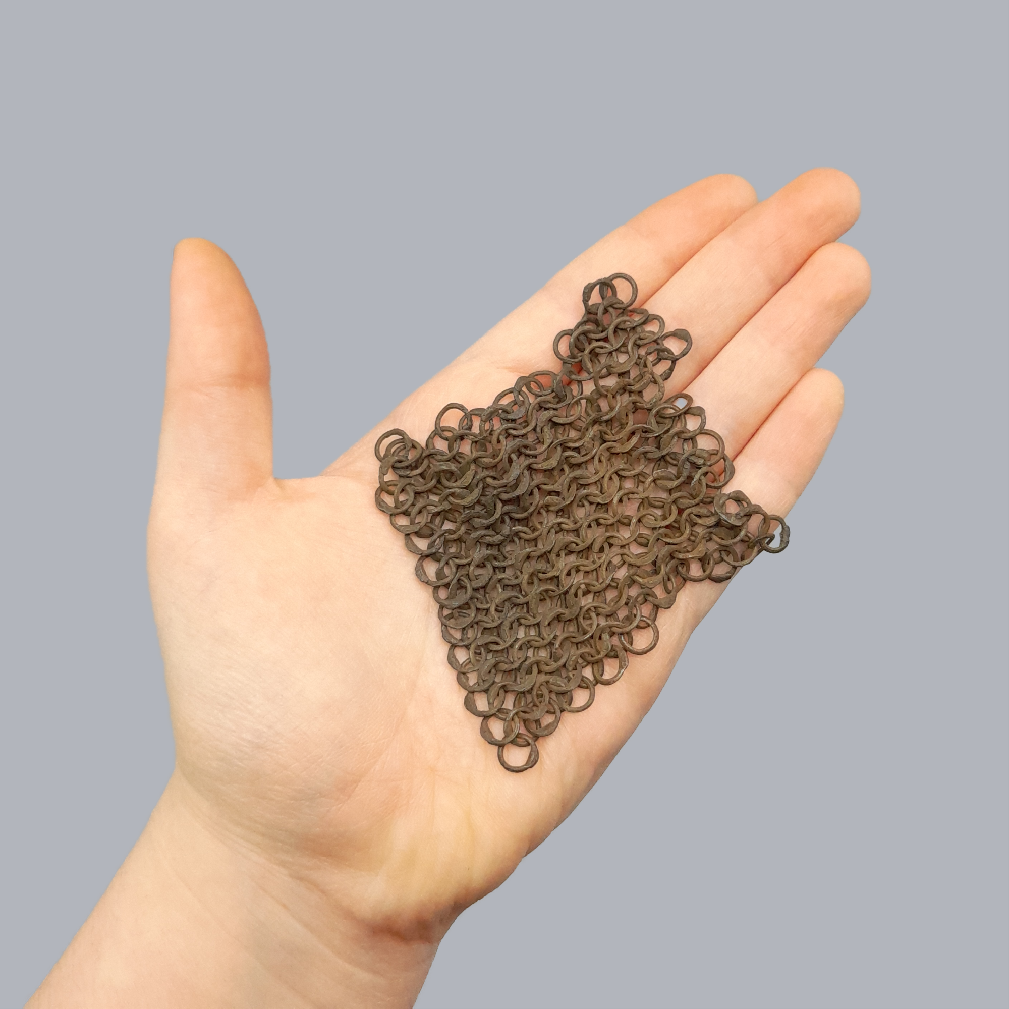An original European mail patch made of small-sized riveted rings of 5-7 mm in diameter. The patch originates from a part of a mail sleeve.