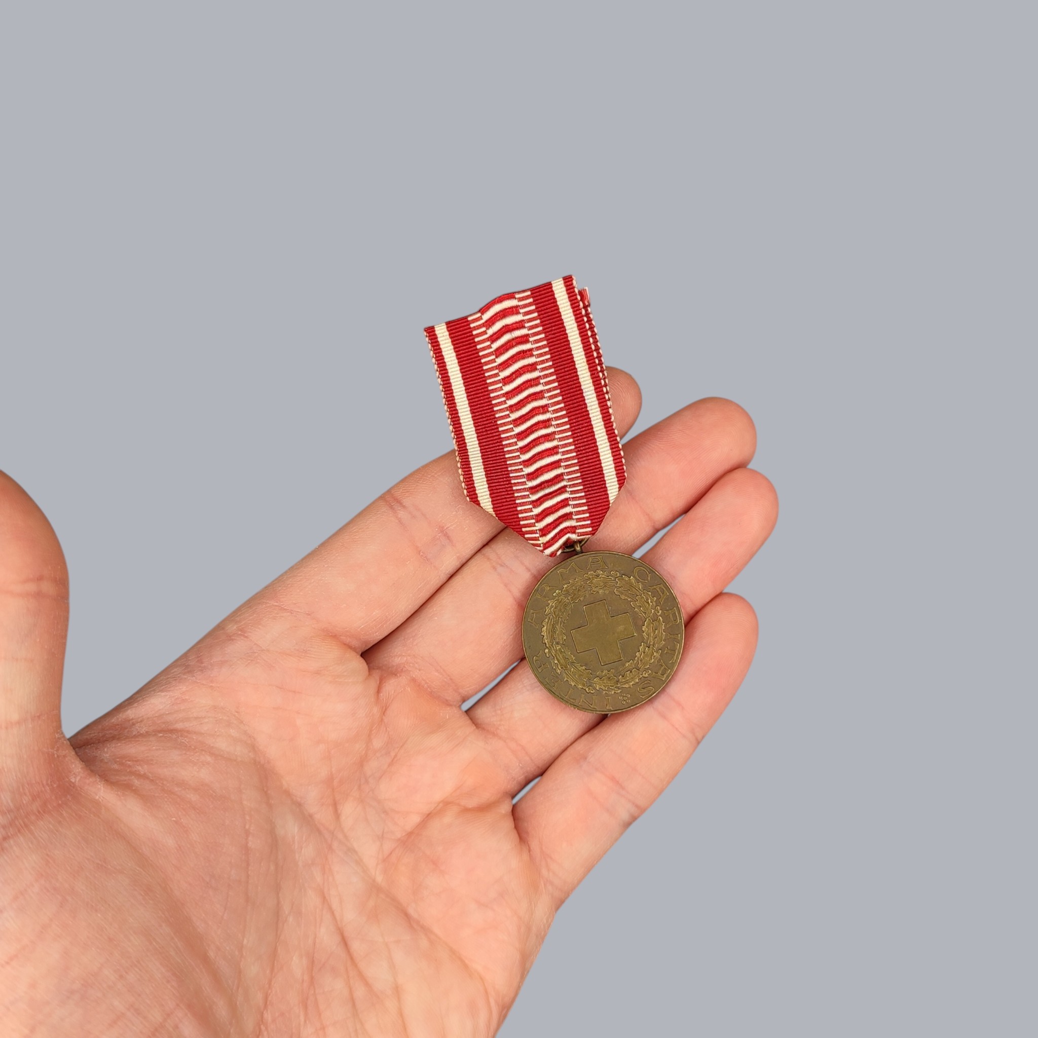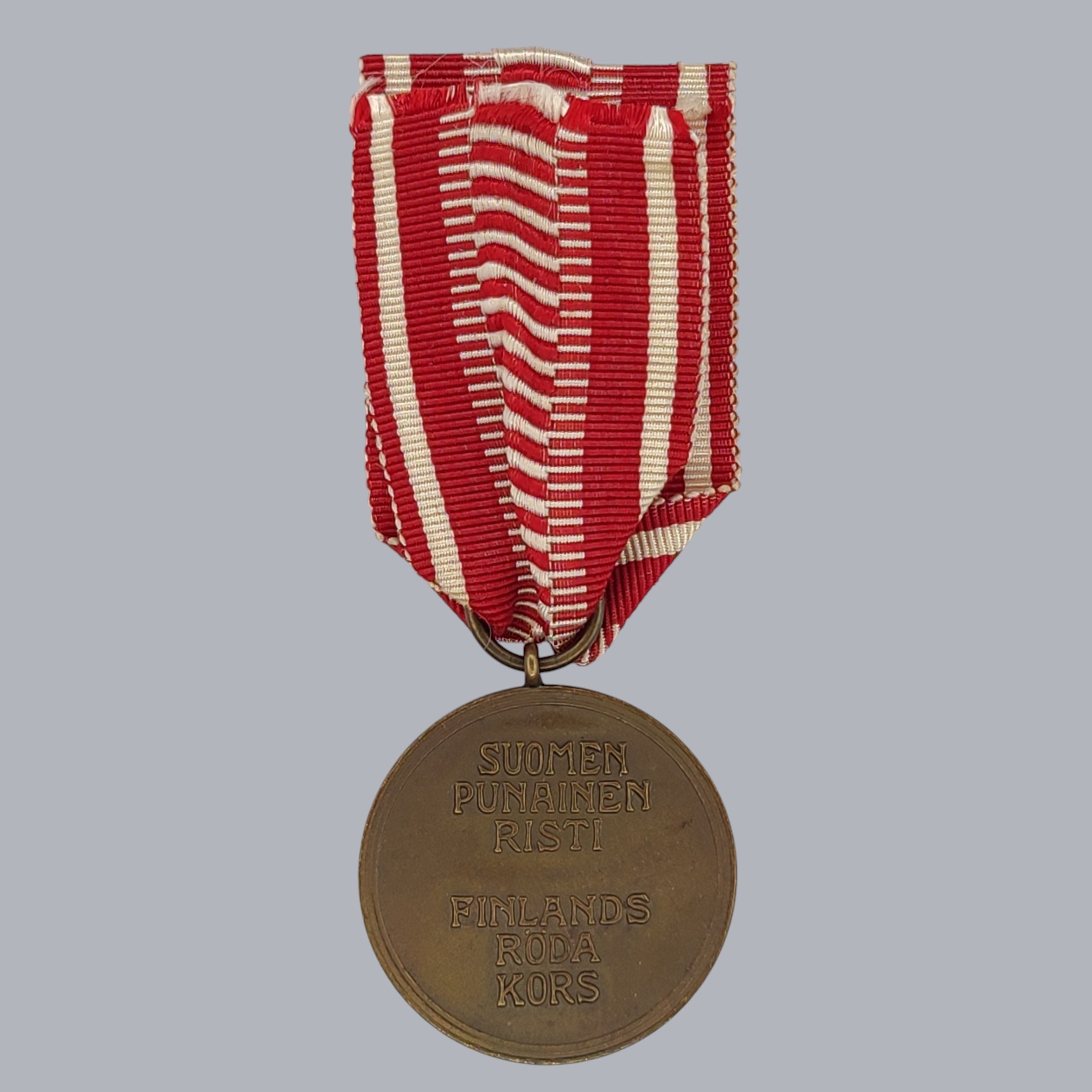An original Finnish bronze medal of the Finnish Red Cross (Punaisen Ristin Pronssinen Ansiomitali) of early production (vertical ribbon loop) manufactured probably in the 1930s Finland. The medal is made of bronze and it comes with the original red-and-white ribbon.