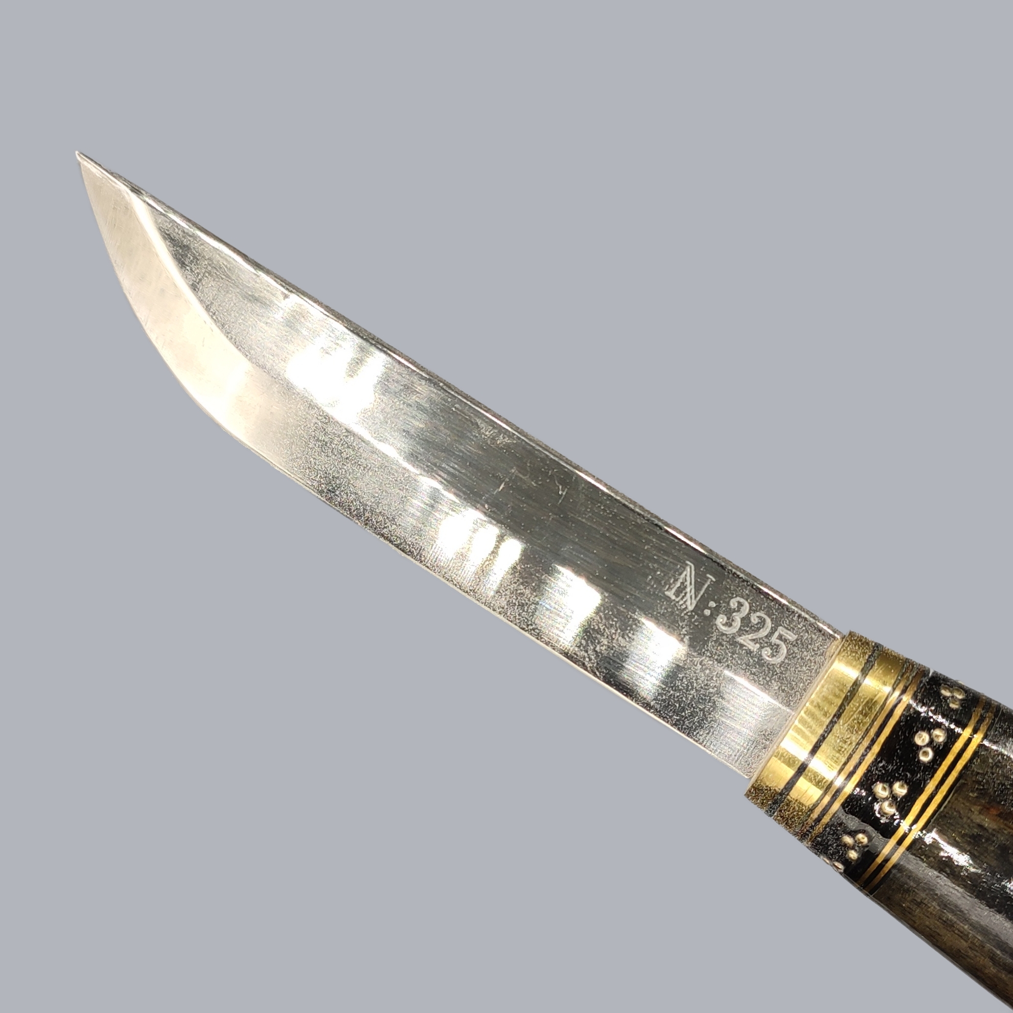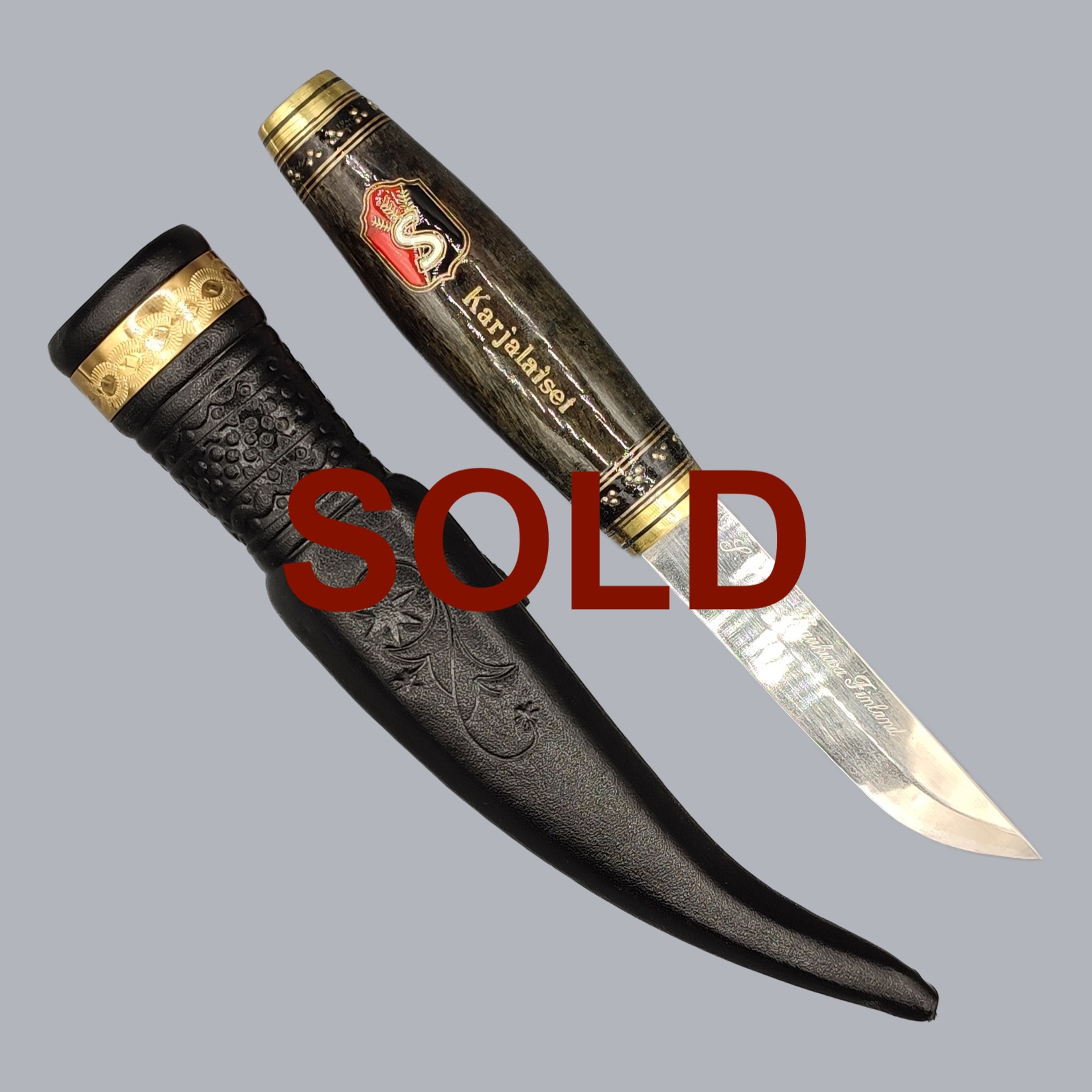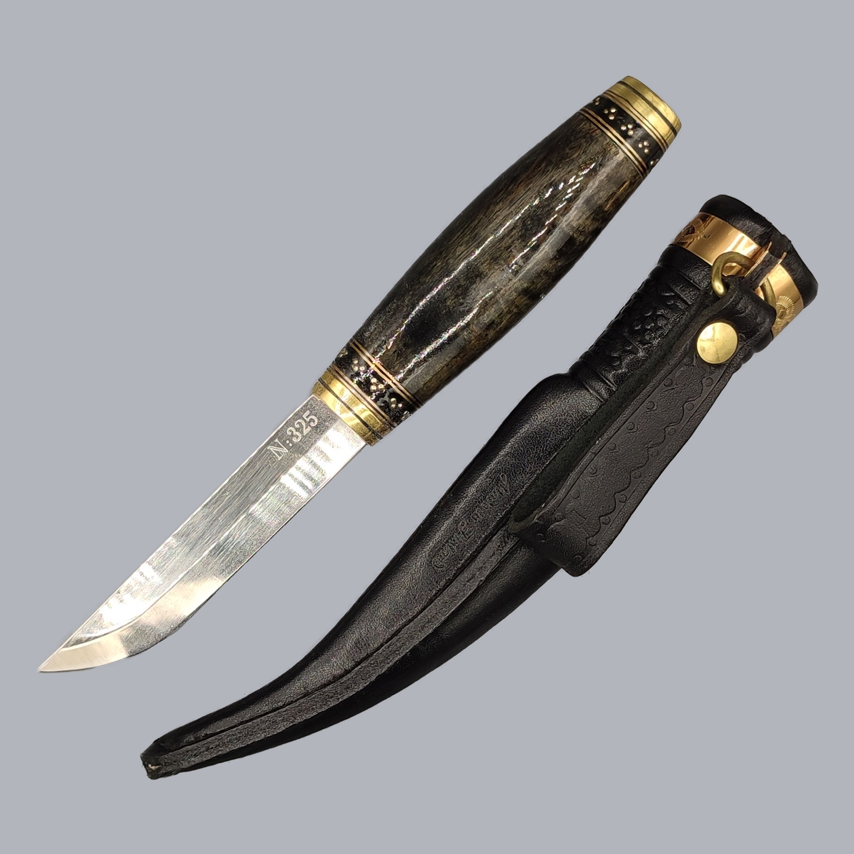 A vintage Finnish ‘Suojeluskunta’ puukko knife commemorating the Finnish wartime Civil Guard, manufactured by the master Simo Passi in Kauhava, Finland, approximately in the 1990s. The brass-mounted wooden handle is decorated with the Karelia Civil Guard emblem. The unfullered steel blade is engraved with the maker’s signature and numbered #325. The back-stitched leather sheath comes with a leather belt strap.