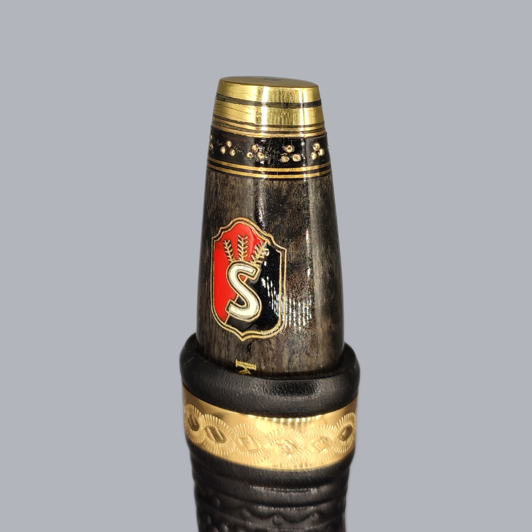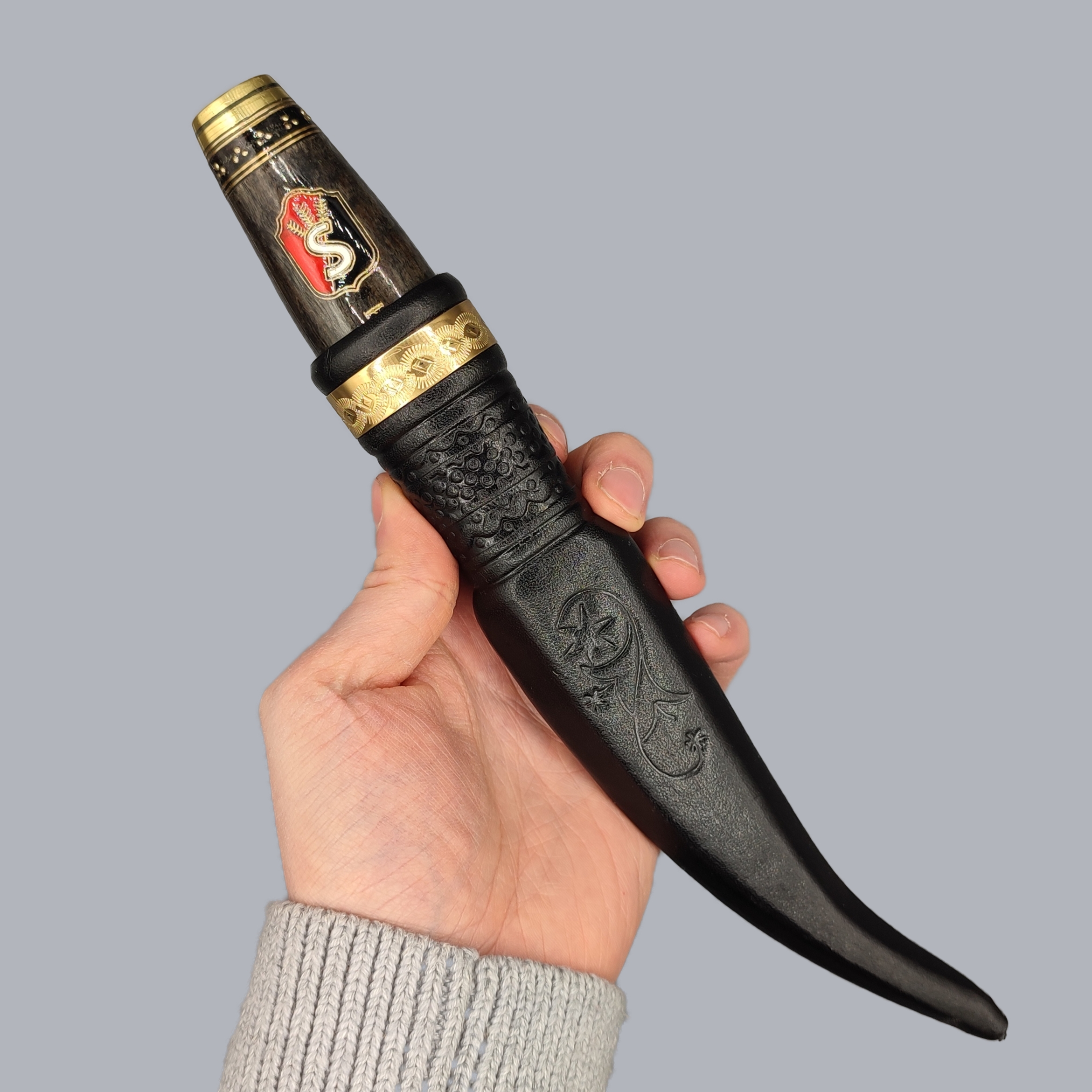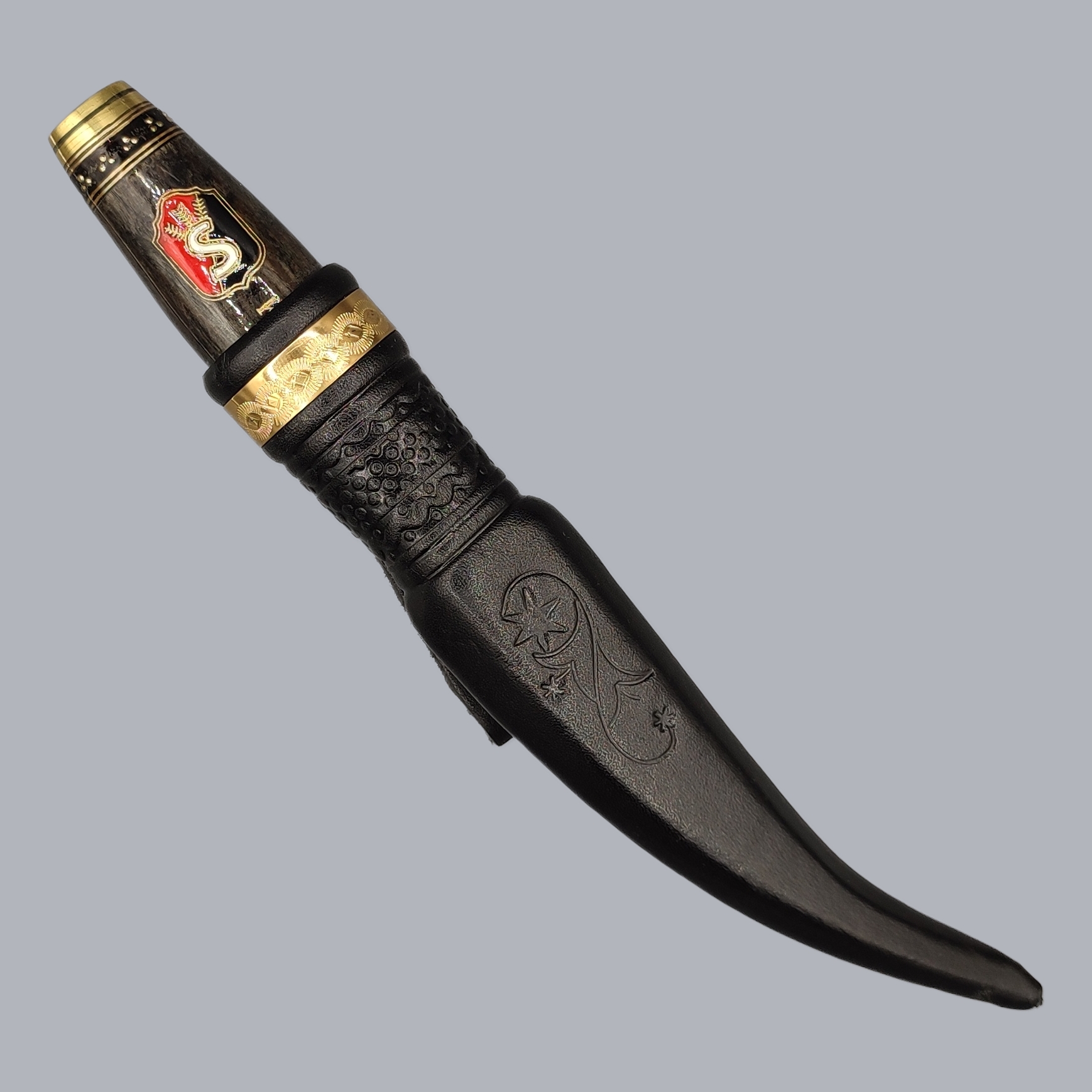 A vintage Finnish ‘Suojeluskunta’ puukko knife commemorating the Finnish wartime Civil Guard, manufactured by the master Simo Passi in Kauhava, Finland, approximately in the 1990s. The brass-mounted wooden handle is decorated with the Karelia Civil Guard emblem. The unfullered steel blade is engraved with the maker’s signature and numbered #325. The back-stitched leather sheath comes with a leather belt strap.