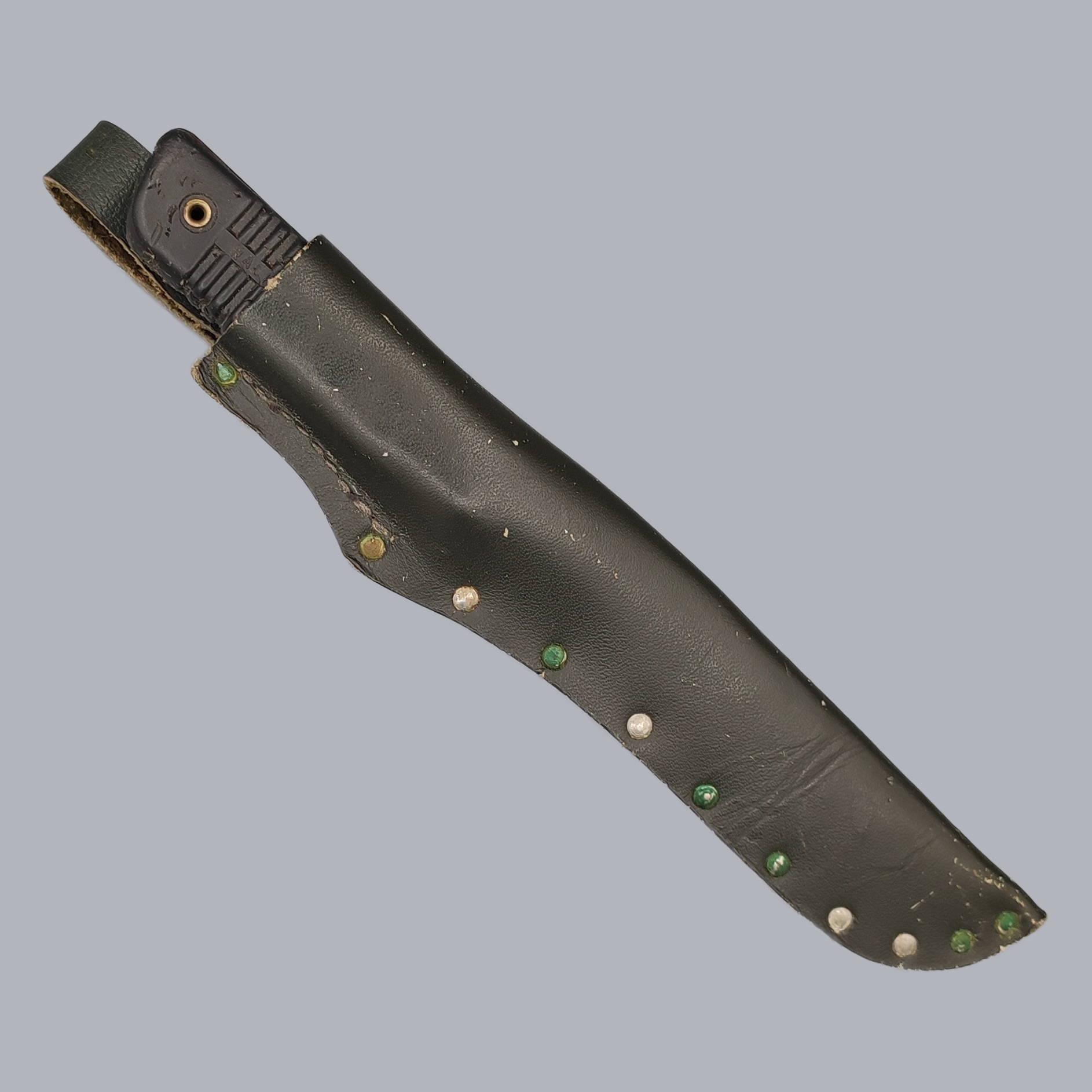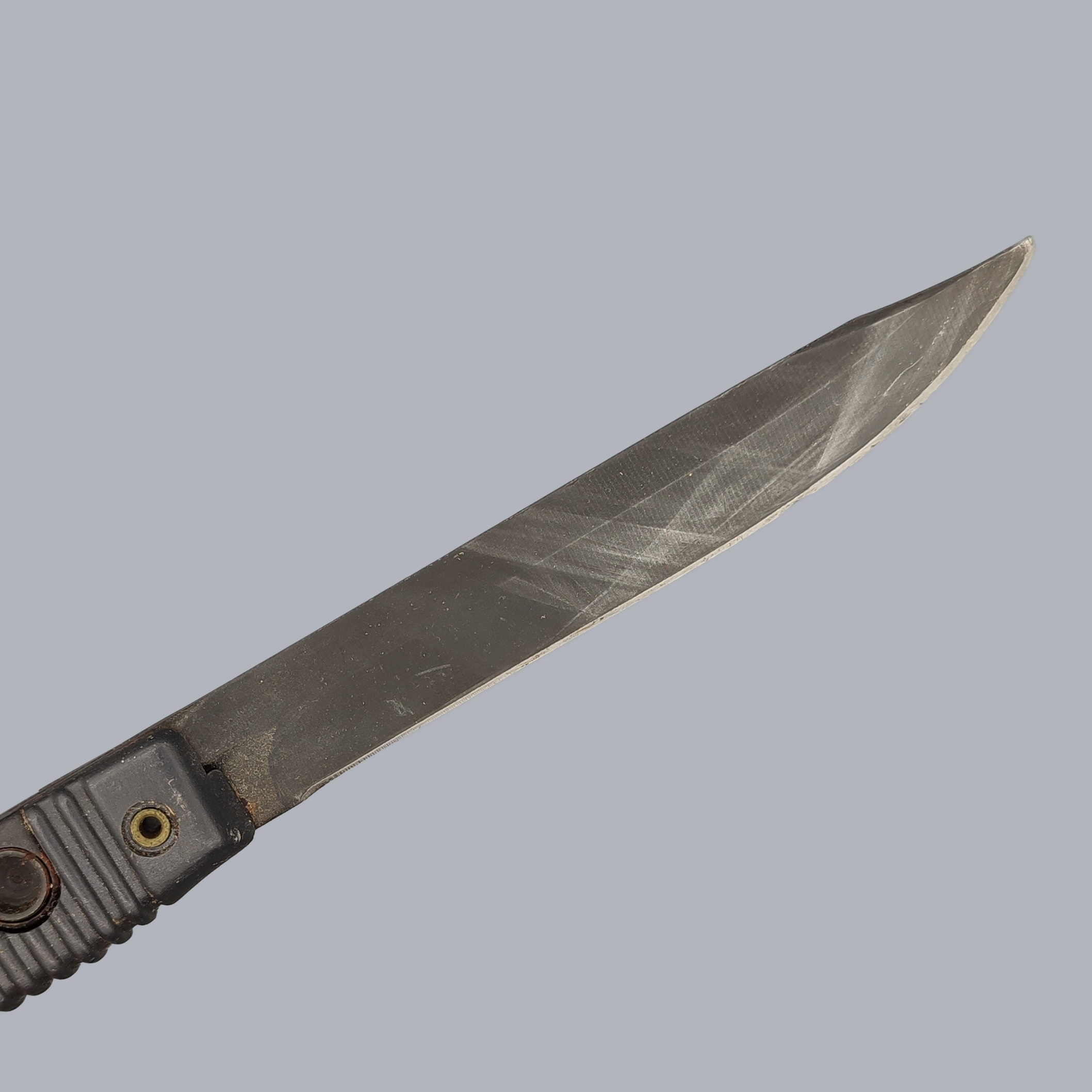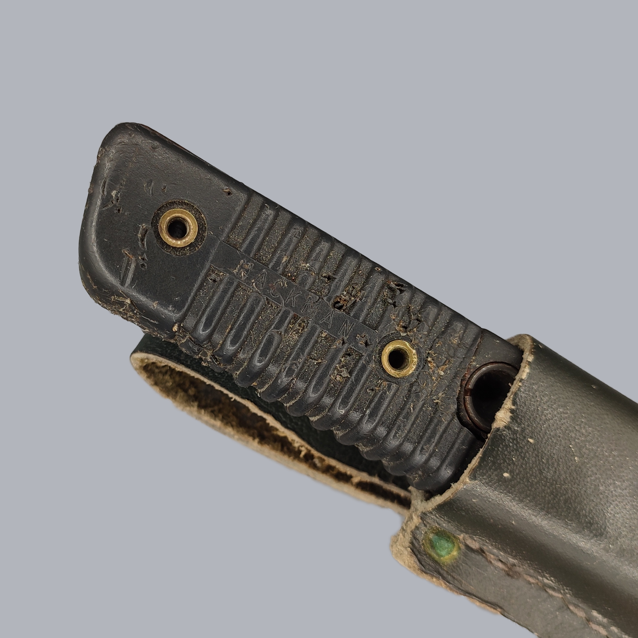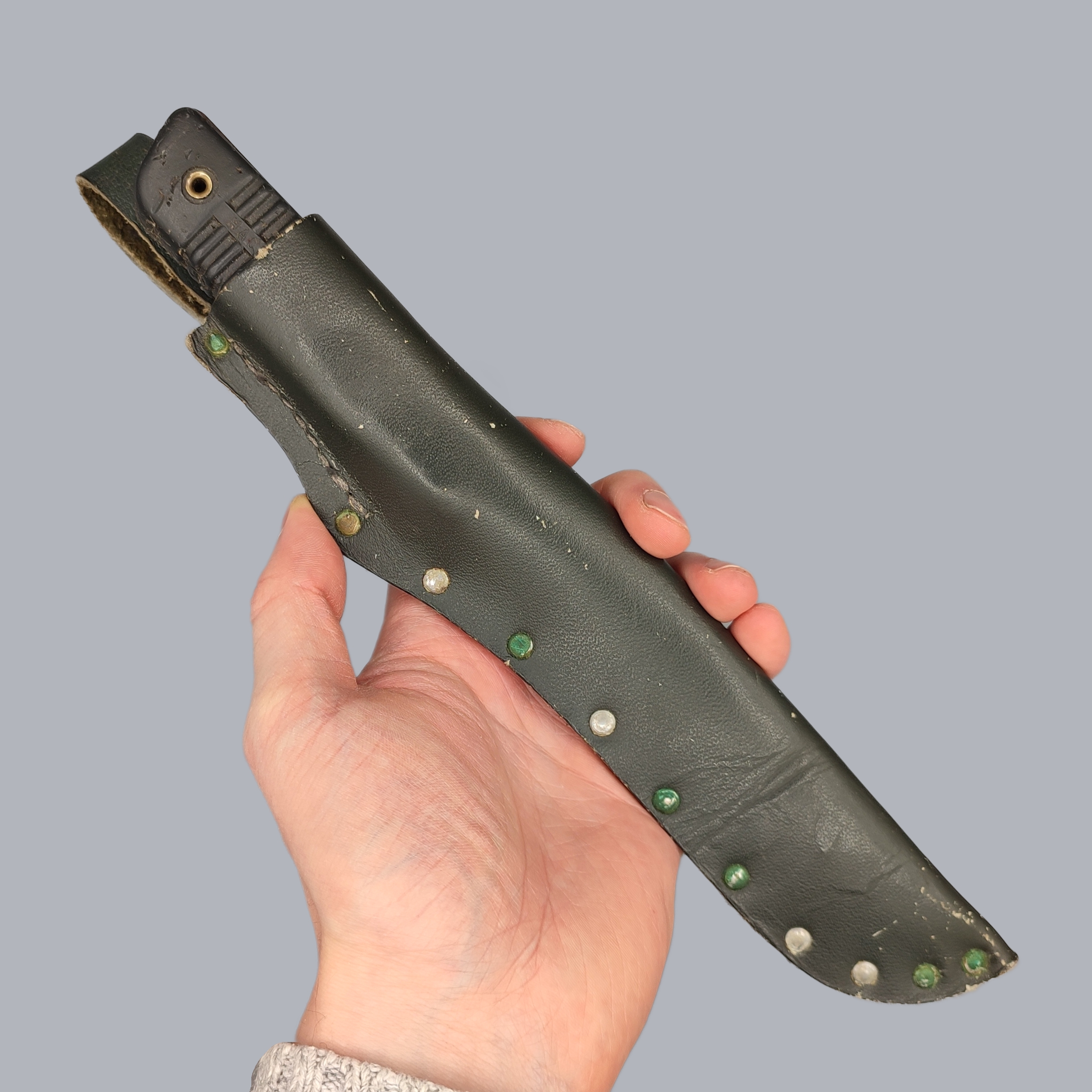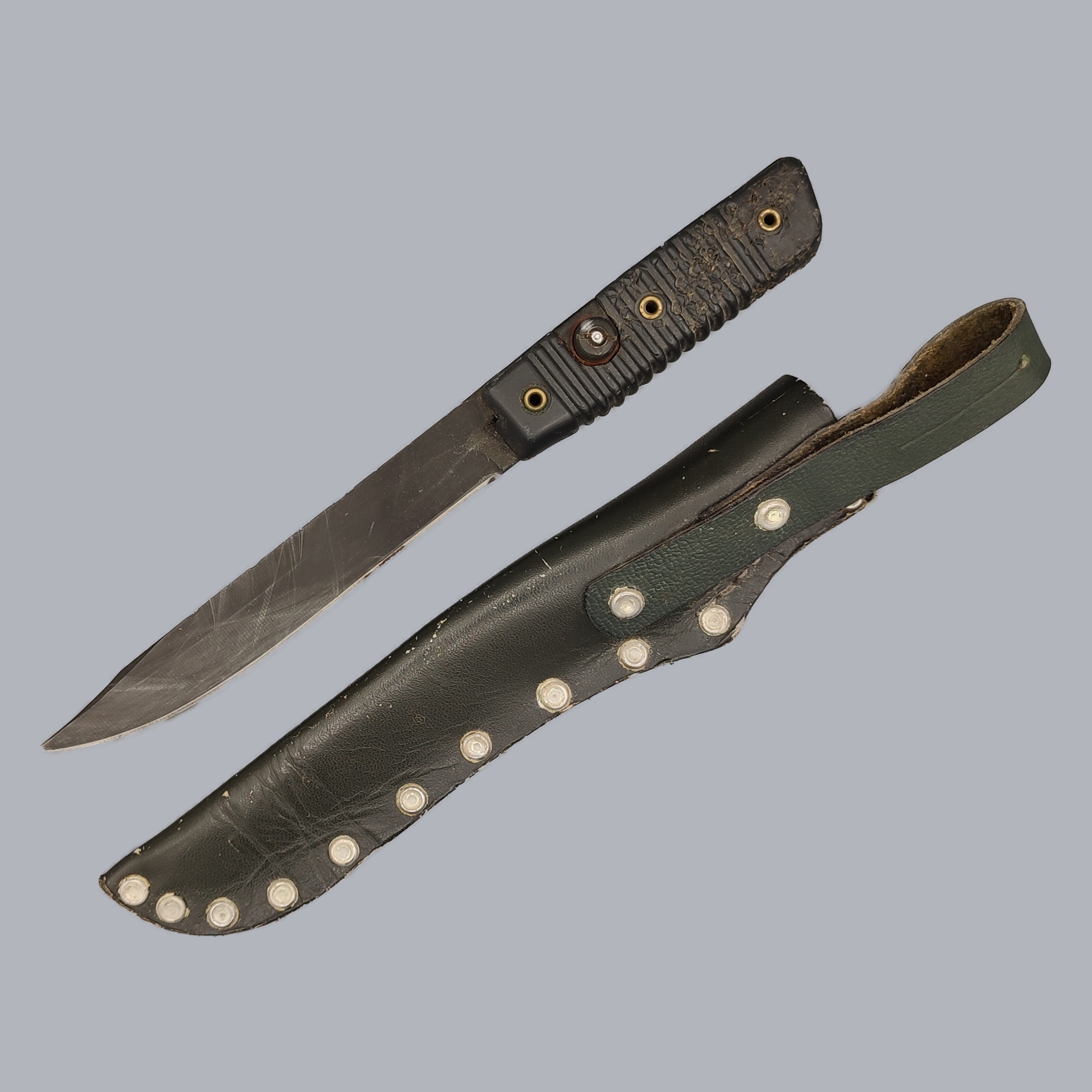 The knife is in good vintage condition with small signs of age and overall wear. The surface of the plastic handle is worn, the blade edge has a nick and the extreme tip of the blade is broken. The knife fits well in its sheath.