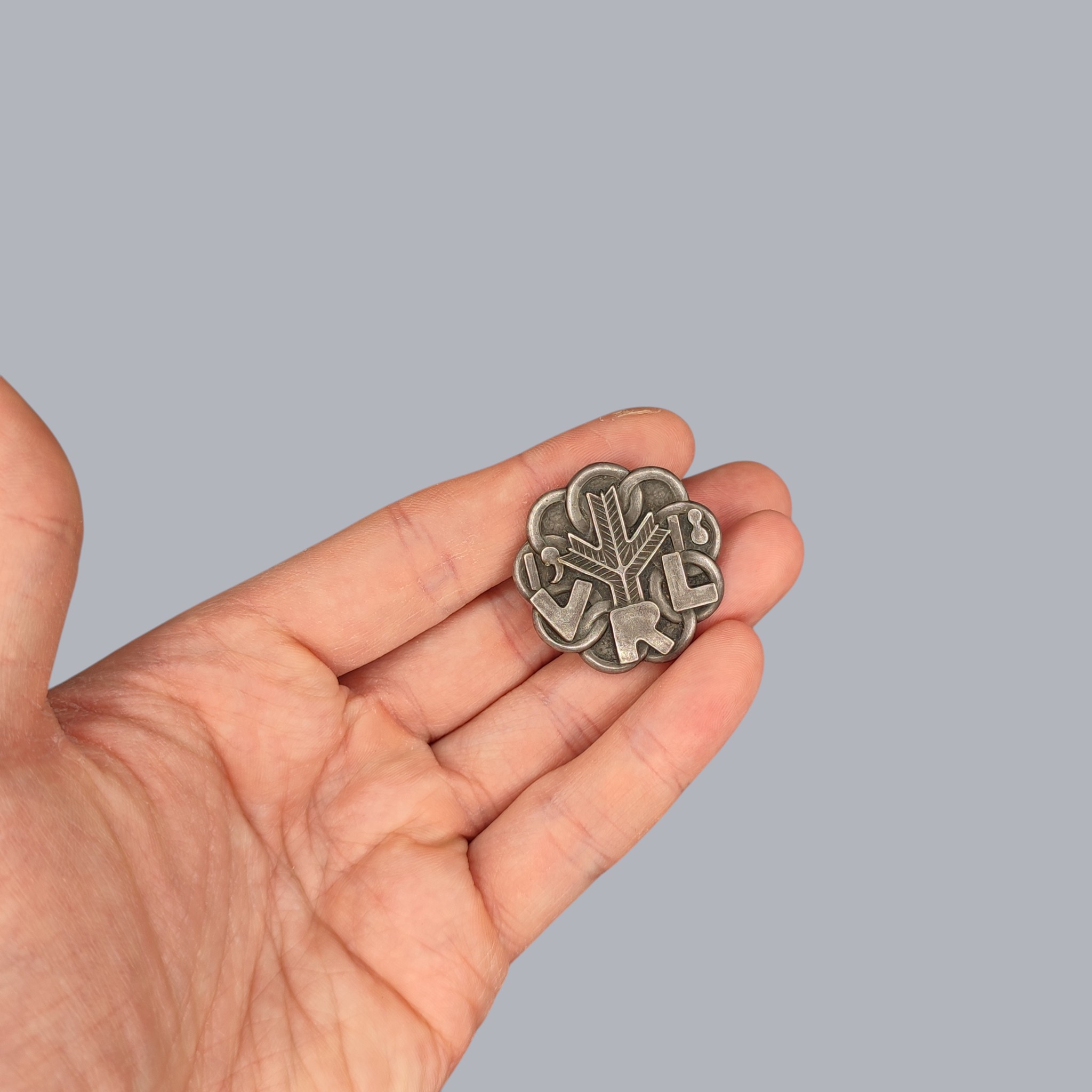 An original Finnish membership badge of the Liberation War (1918) Frontmen’s Union (Vapaussodan Rintamamiesliiton Jäsenmerkki) manufactured by Hopeatehdas Oy in the 1930s Finland. The badge is made of tombac. The reverse side is numbered (889) and marked by the manufacturer.
