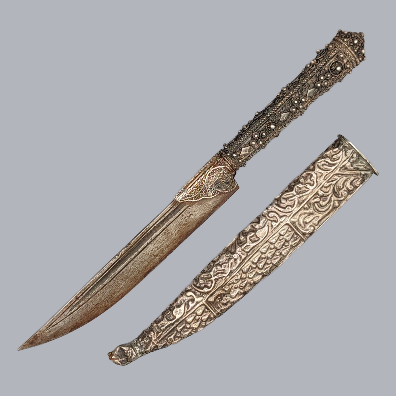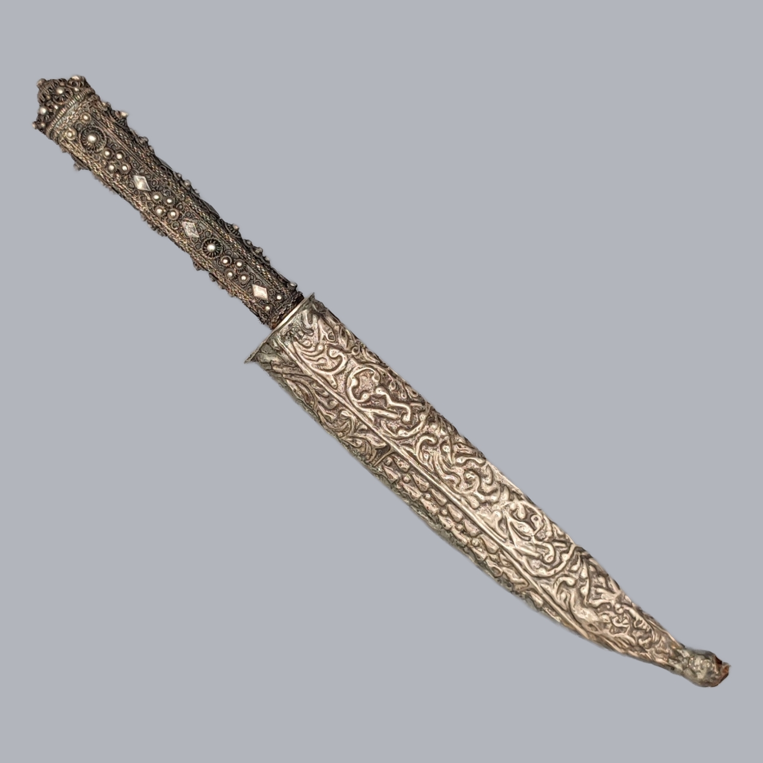 A fine antique bichaq knife manufactured in the 19th century Greece. The silver handle is of a rich and fine filigree work. The fullered single-edged carbon steel blade has no markings. The silver scabbard is decorated with typical Greek vine patterns.