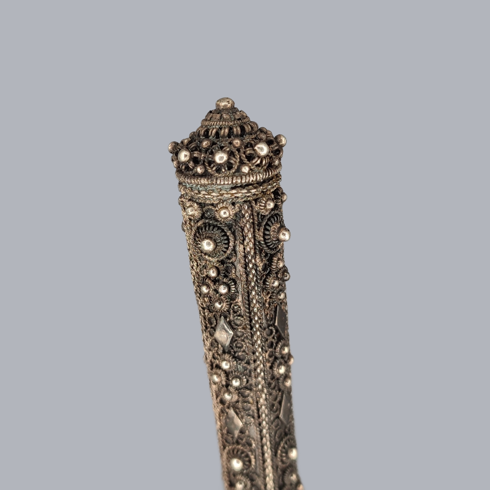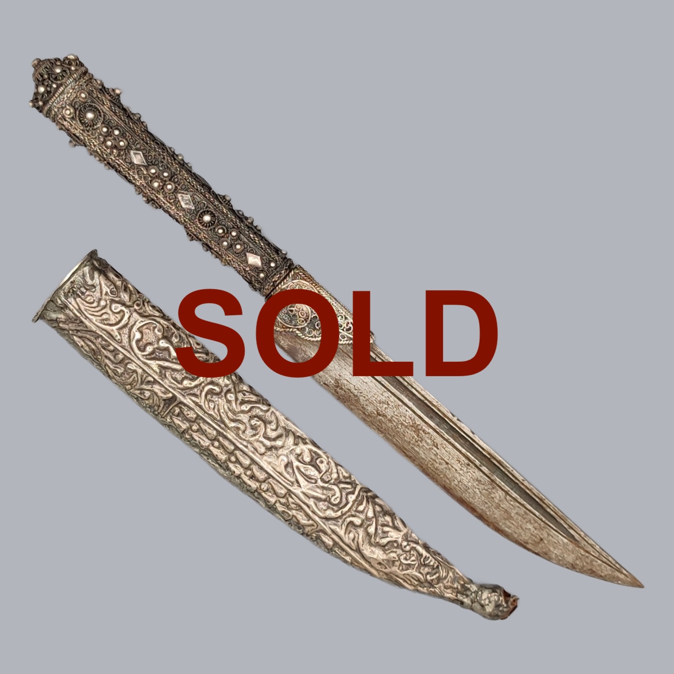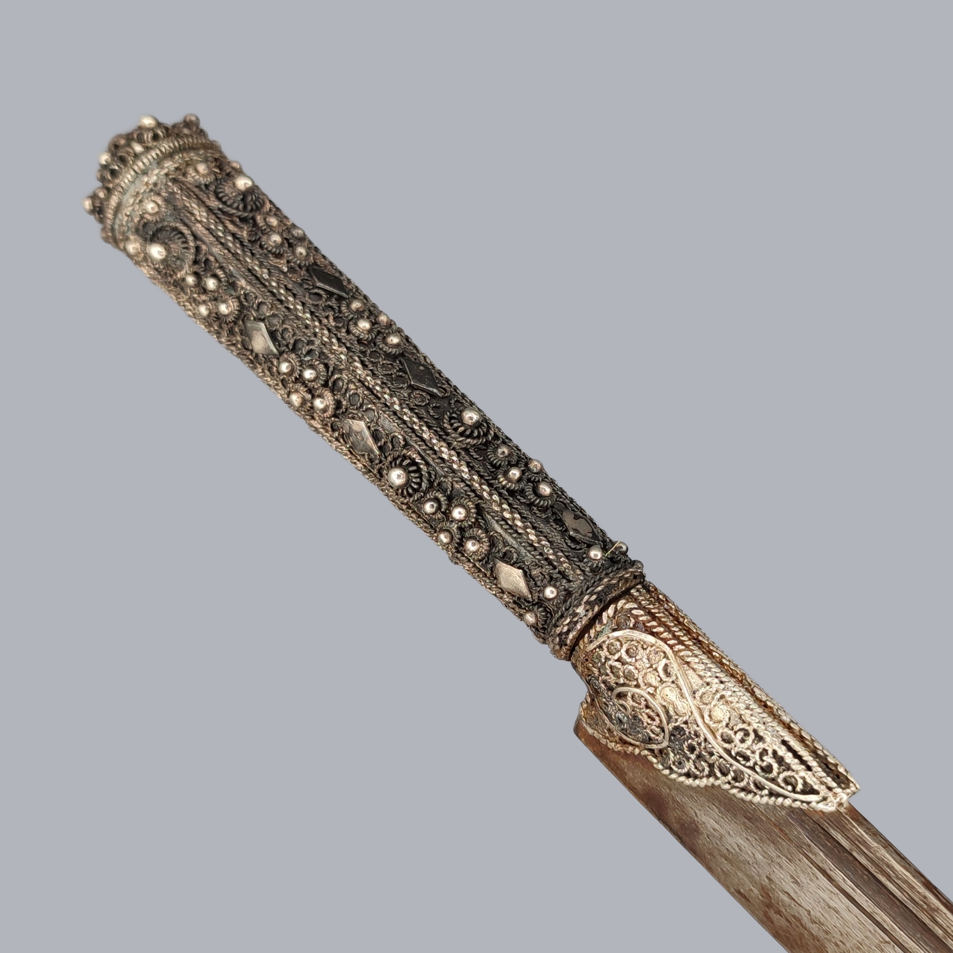 The knife is in good antique condition with minor signs of age and wear. The filigree mount between the handle and the blade is slightly loose. The tip of the scabbard is slightly damaged.