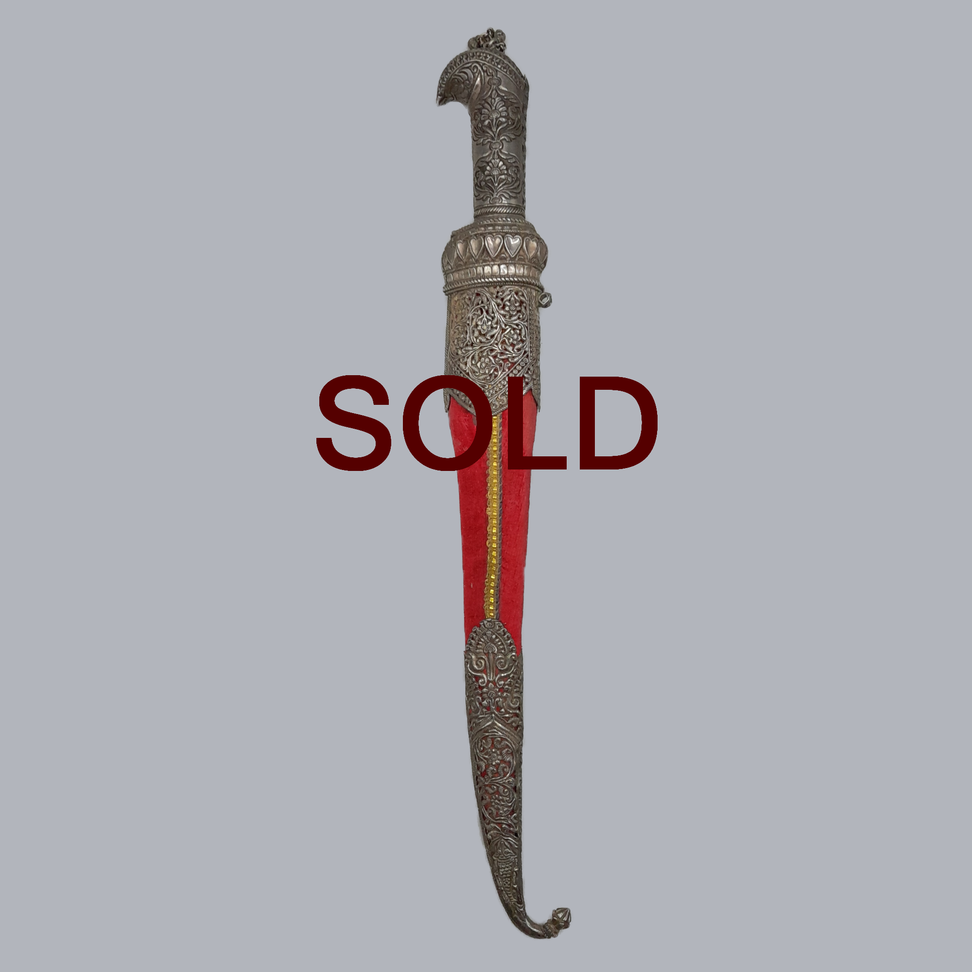A fine, silver-hilted Indian kard-dagger. The steel blade has a tight and intricate damascus pattern and a strong, T-shaped back. The handle and scabbard mounts are decorated with floral patterns and heart-shaped decorations. Original scabbard is made of wood and covered with red cloth. The top scabbard mount is a little loose, but the blade fits well in its scabbard. Group of small chained bells are attached to the top of the handle. This beautiful dagger of big proportions is clearly production of the Mughal region of North India.