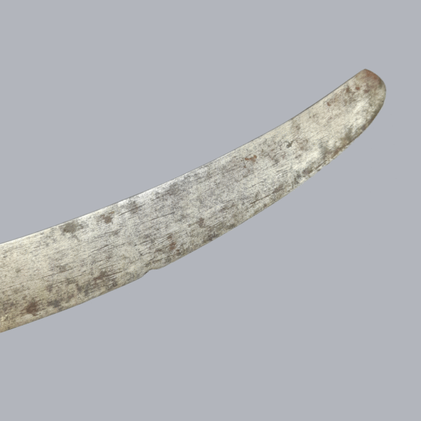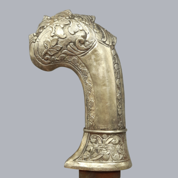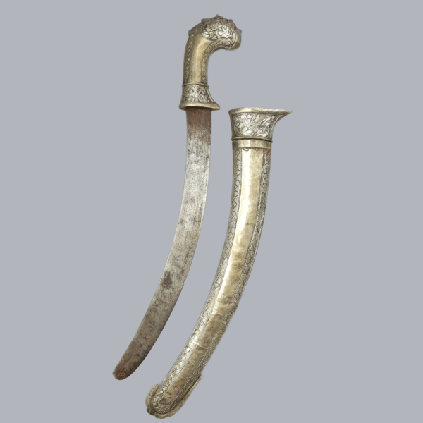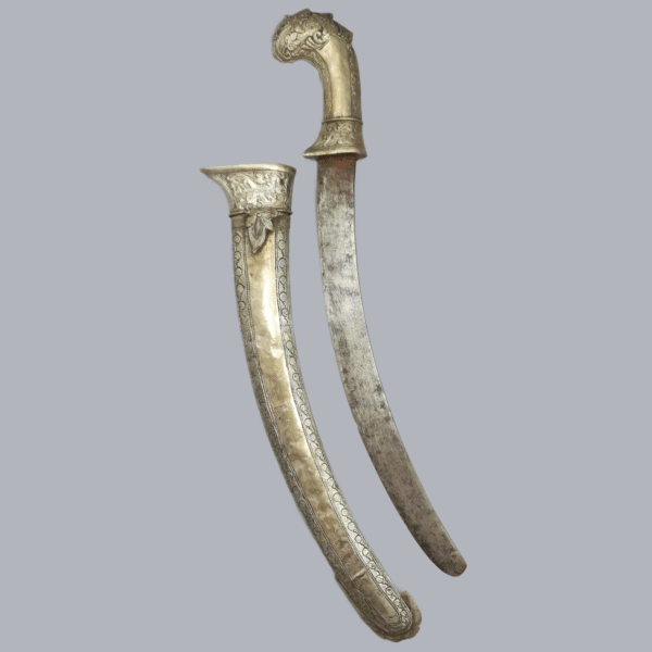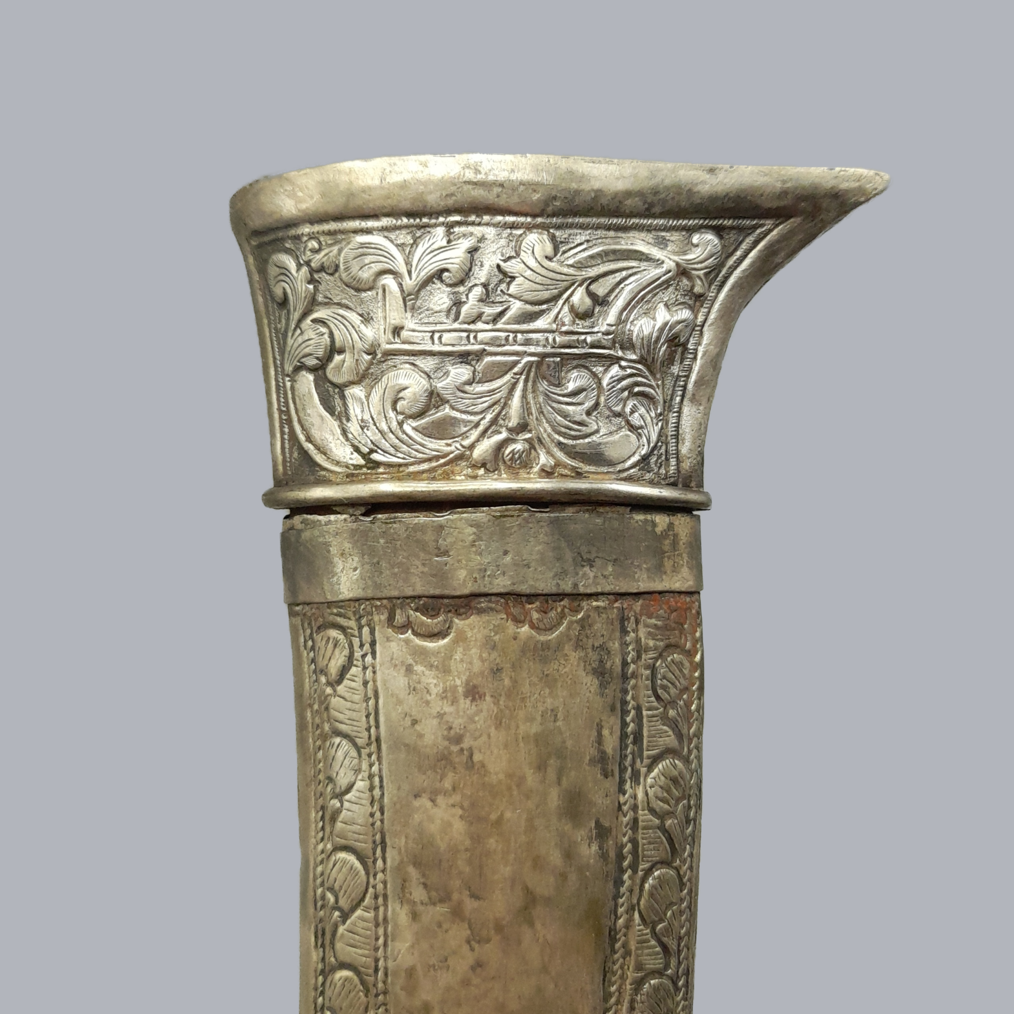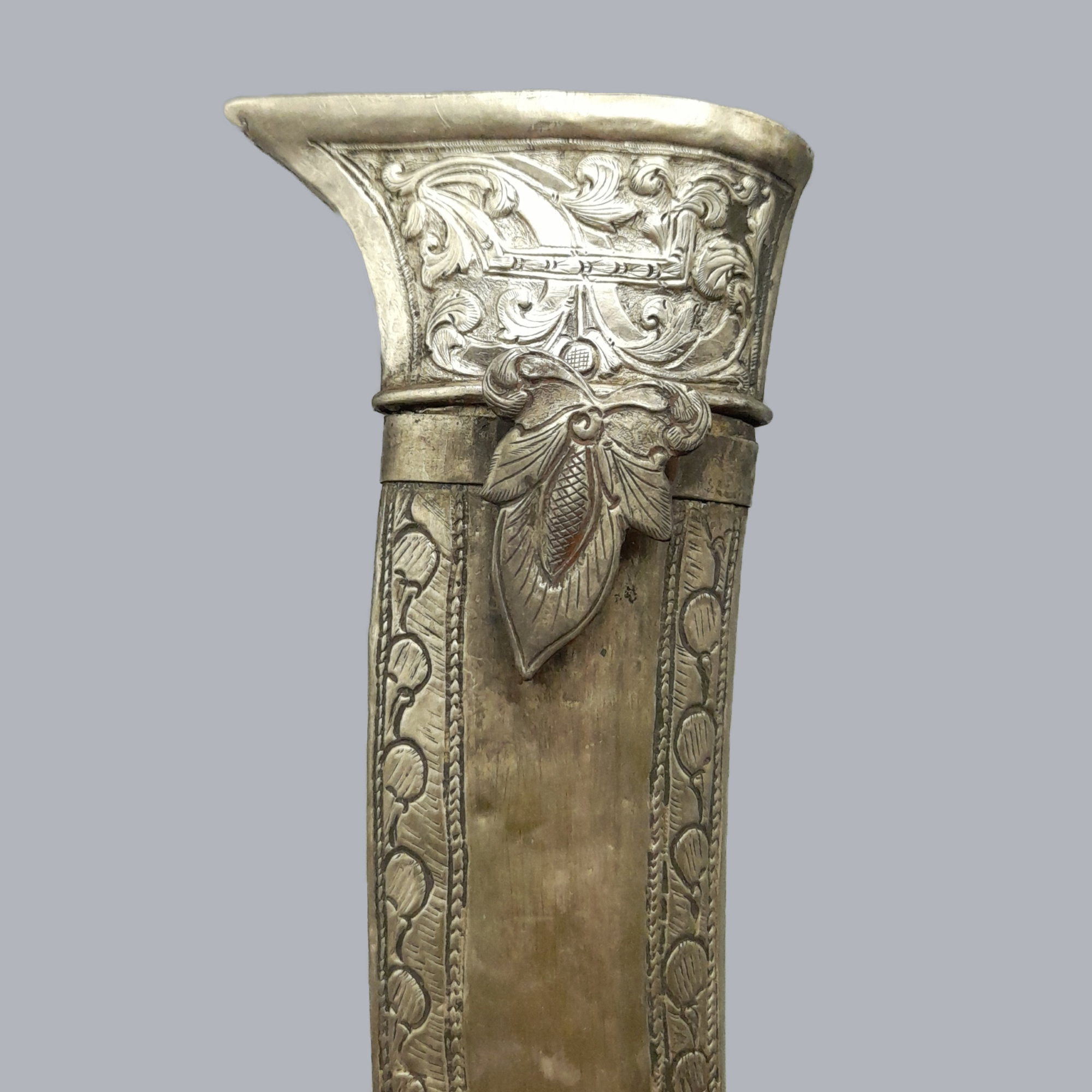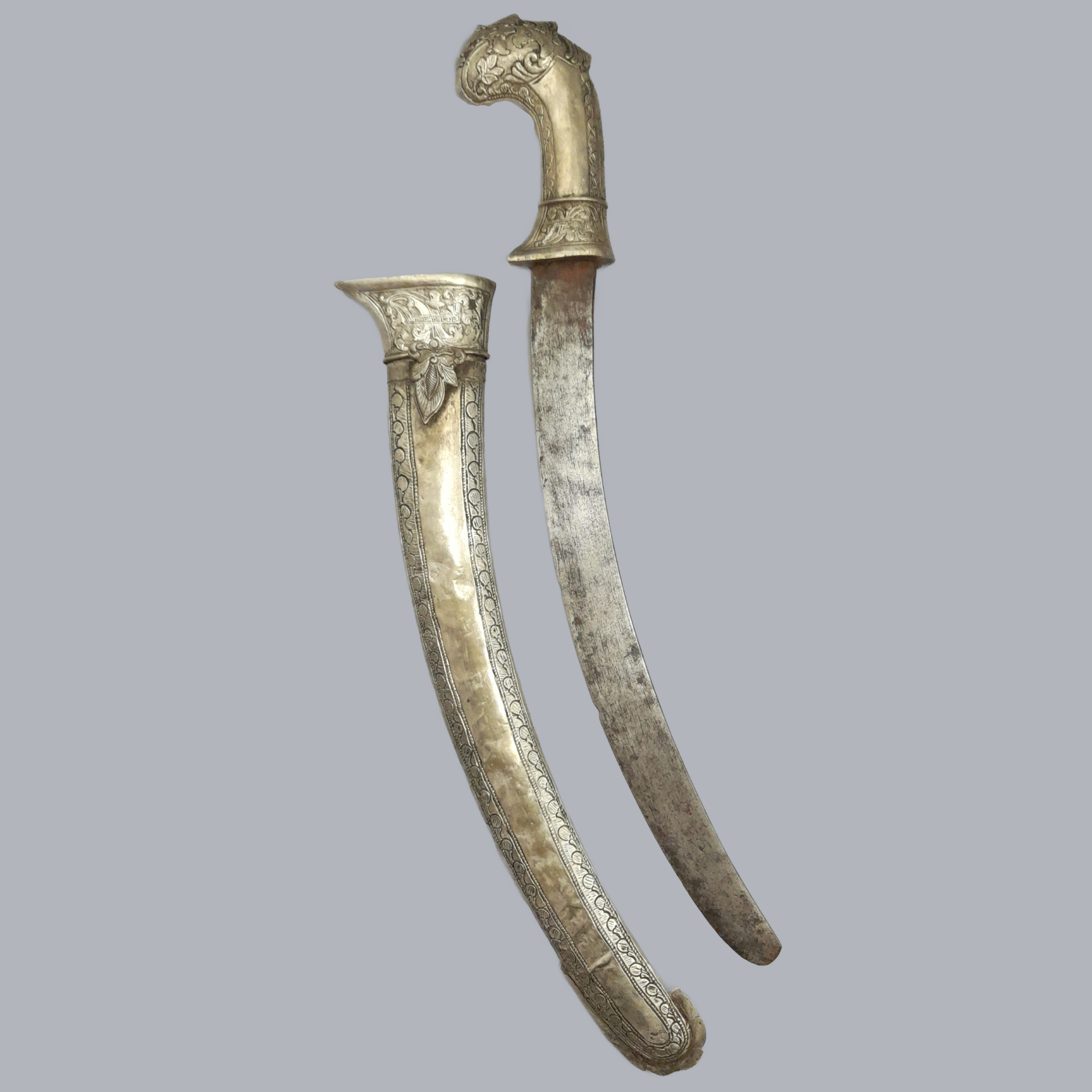 A 19th century javanese golok sword with a silver-plated scabbard and handle. Manufactured in the late 19th century, most likely in Indonesia. The curved blade is made of sturdy steel. It is one-sided, and the sharper side has some dents on it. The scabbard is made of wood and finished with a beautiful silver foil. The thinnest parts of the silver plating, like the tip and the top edge of the scabbard has been slightly bent and cracked. The sword’s leaf-motif continues onto the handle, which has similar carved silver plating to the scabbard. The sword fits well in its scabbard, although it is a little loose. It is in untouched antique condition.