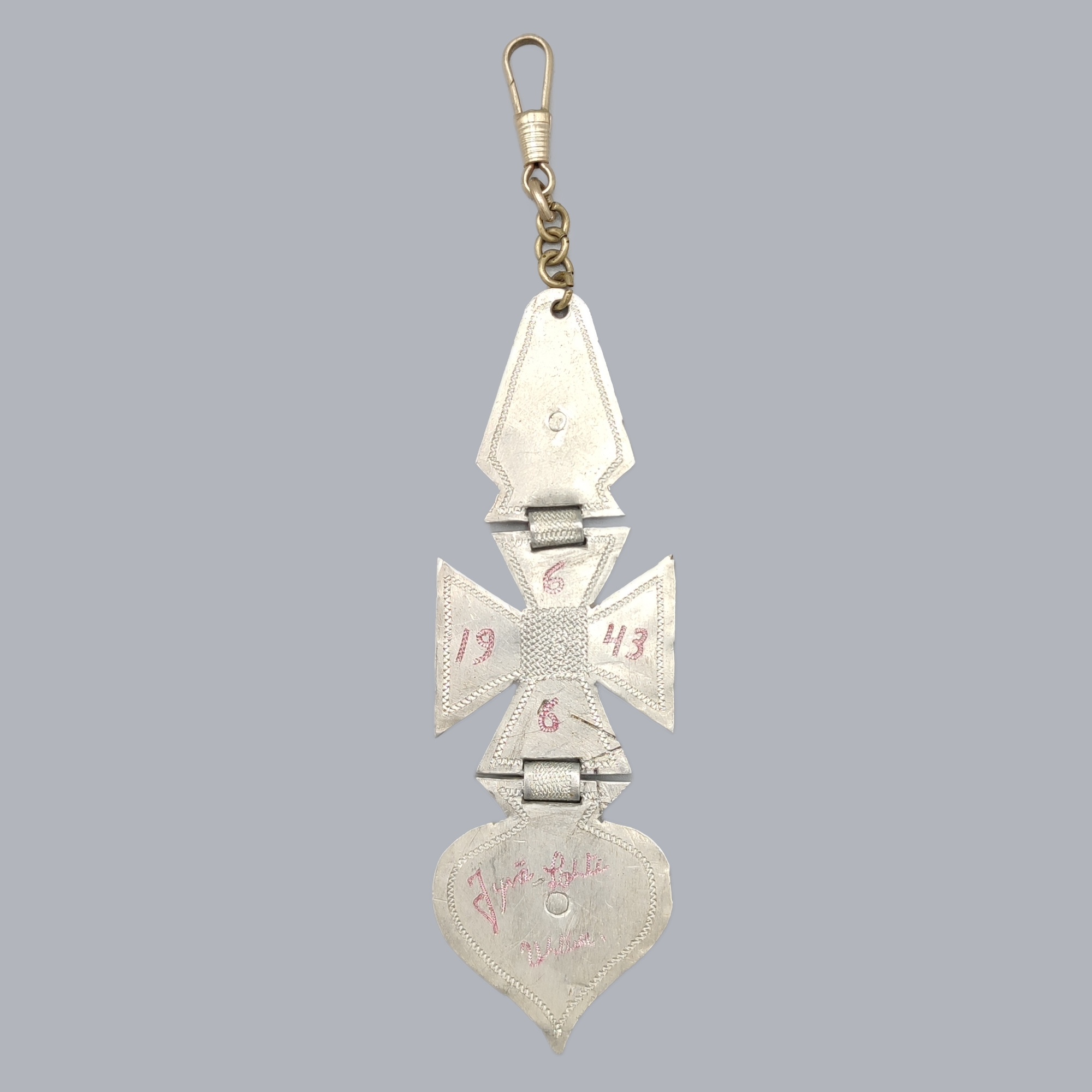 An untypical trench art pocket watch ferrule made of aluminium and galalite by a Finnish soldier during the Finnish Continuation War (1941-1945). The reverse side is engraved with date and place (6.8.1943 Jyvälahti Uhtua). Plastic was rarely seen in Finnish trench art. Normally only aluminium was used. The ferrule is in good vintage condition.