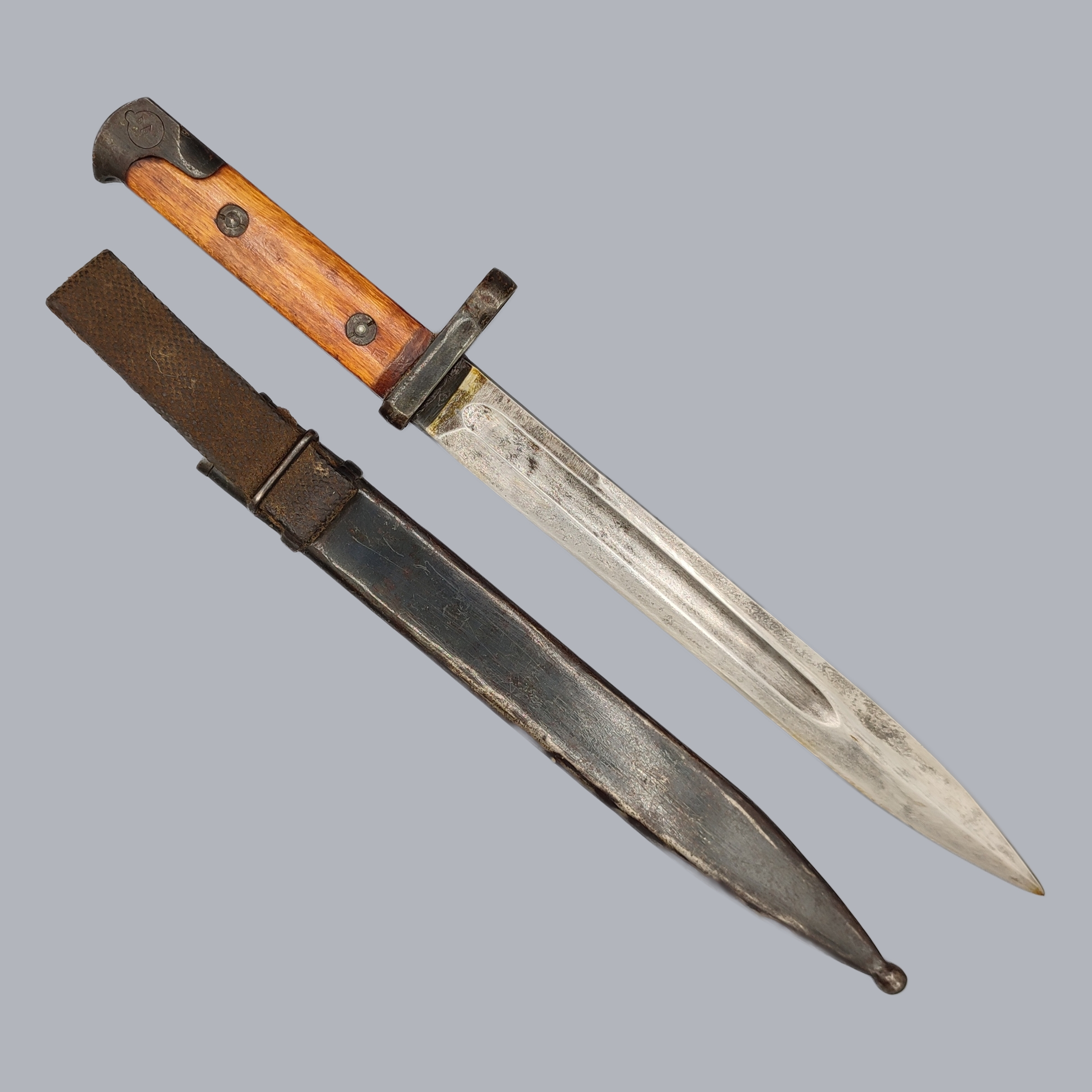 An original Soviet Russian WWII military combat knife for the SVT-40 Tokarev. The blued steel handle has wooden grip scales. The ricasso of the steel blade is marked by the manufacturer. The steel scabbard has a cloth belt strap.