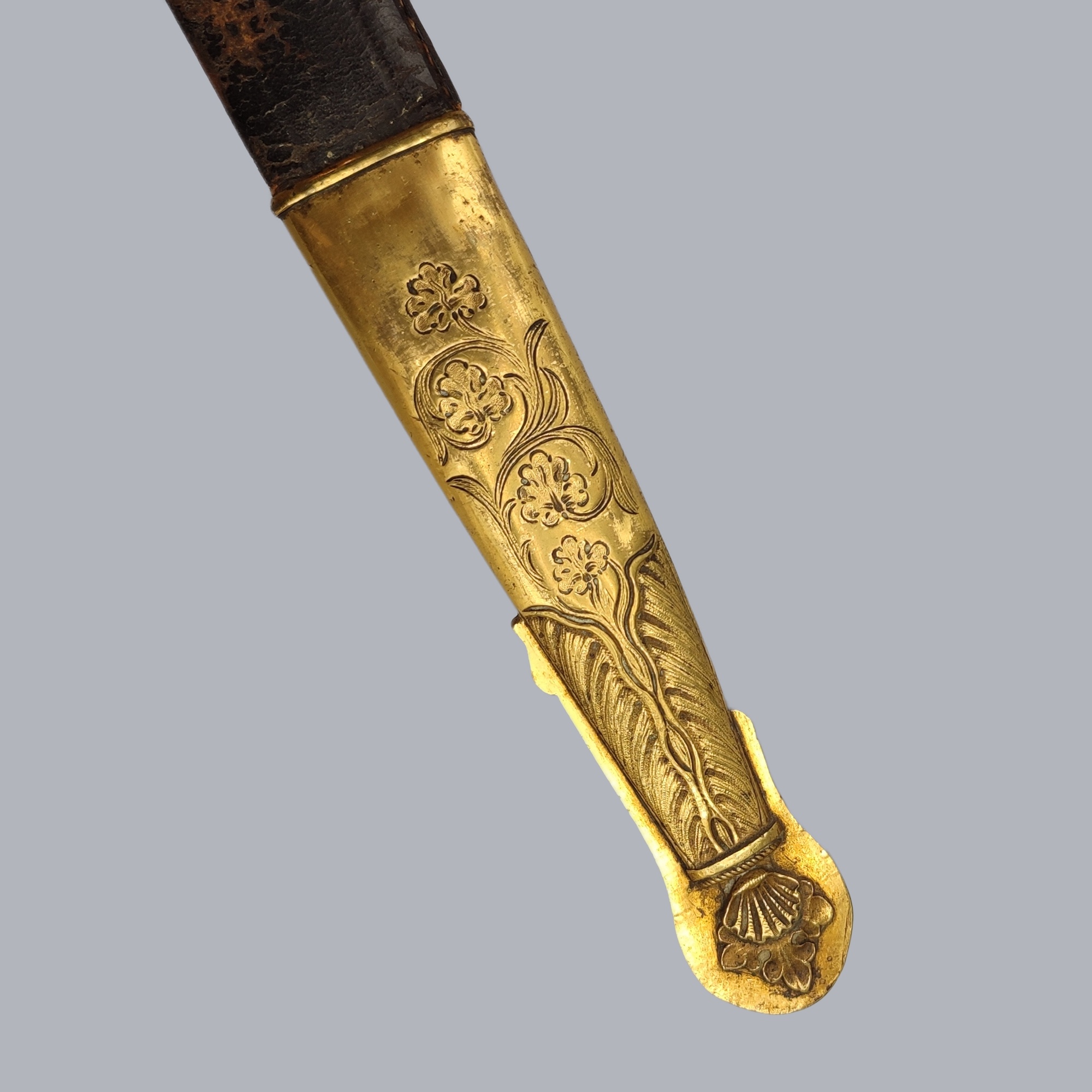A fine French navy officer sabre, pattern M/1853 used during the reign of Napoleon III. The handle and the scabbard mounts are beautifully gilt, the upper scabbard mount with an anchor and crown. Typical French military markings on the blade. The sabre is an original untouched example in a very nice condition.