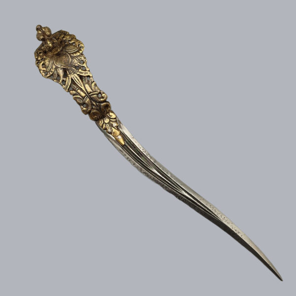 Probably Thanjavur-made chiselled brass-hilted bichwa dagger with a protruding Yali head and recurved double-edged blade.