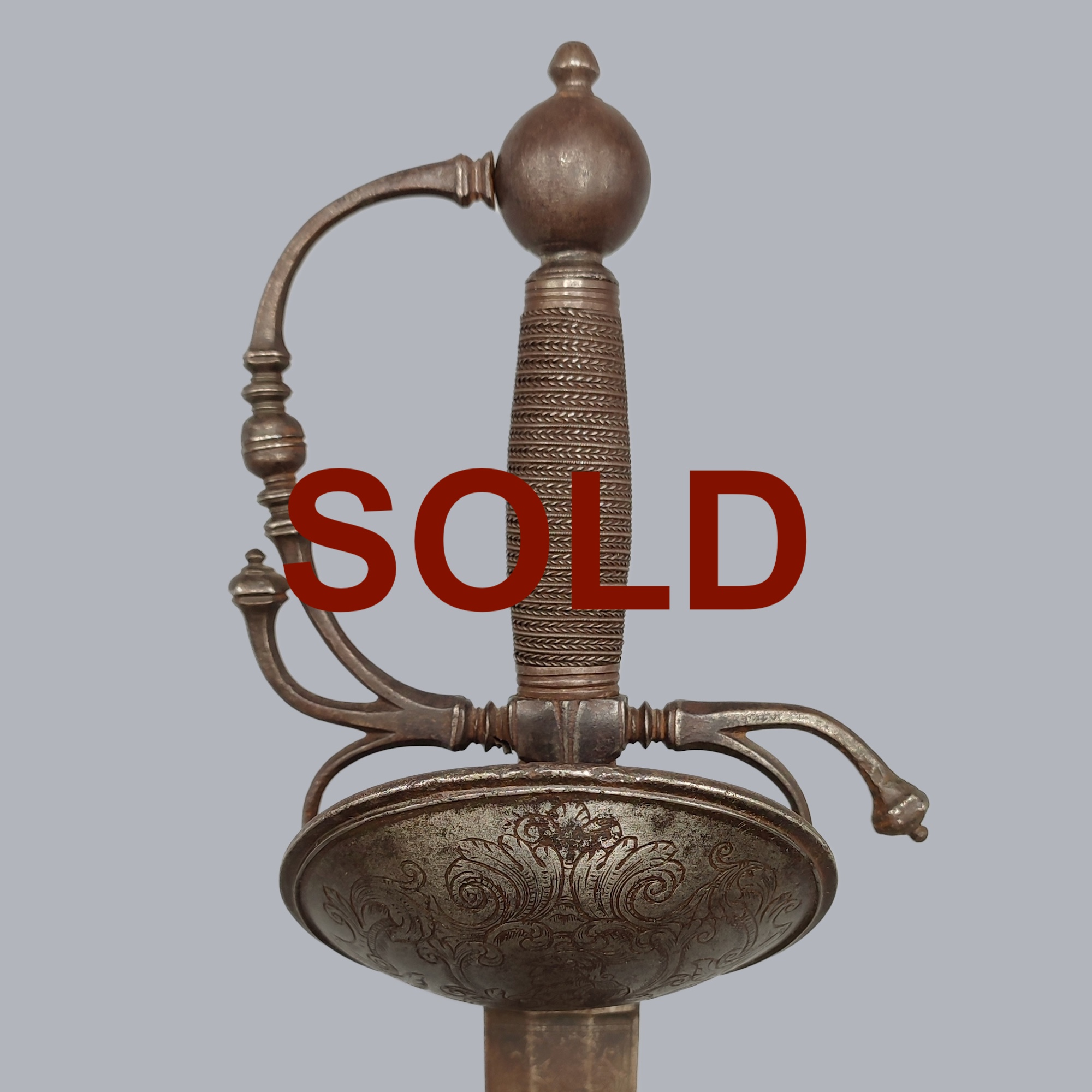 An antique Spanish cavalry sword of a so-called ‘bilbo’ style with a gilded and engraved Spanish or Italian cavalry blade. The shellguard is depicted with a Roman warrior á la antique surrounded with floral patterns. The ricasso is stamped with a king’s head. The sword is in beautiful antique condition.