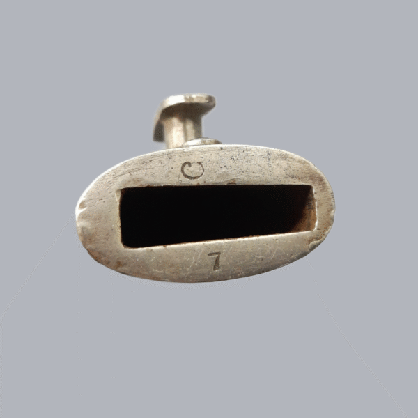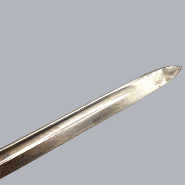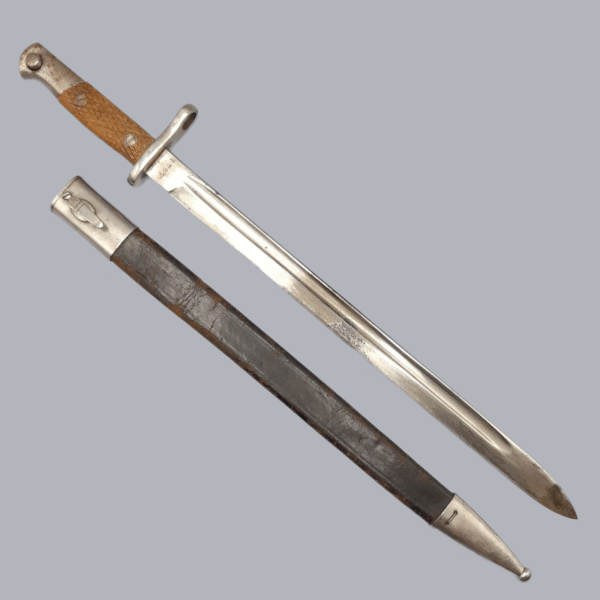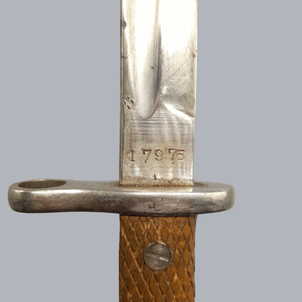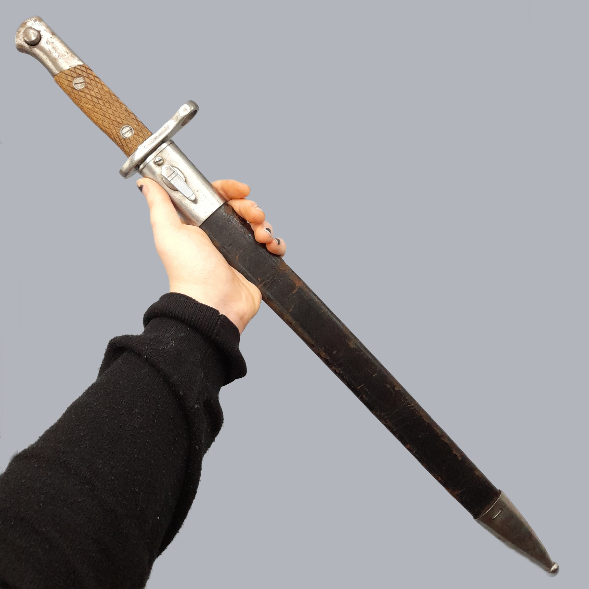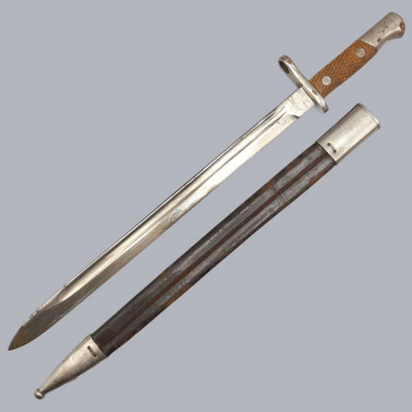 An antique mauser knife bayonet with its original leather scabbard, manufactured in Spain, Toledo. It has the manufacturer’s stamp on the bottom of the blade and the serial number on the other side. The steel blade is in nice condition with some dark spots on it. The handle is partially made from steel and wood, and the wood has the original cross-hatch finish. The handle’s locking mechanism works. The leather of the scabbard is a little worn and the topmount locket is a little loose. The blade fits well in it’s scabbard. The bayonet is in untouched antique condition.