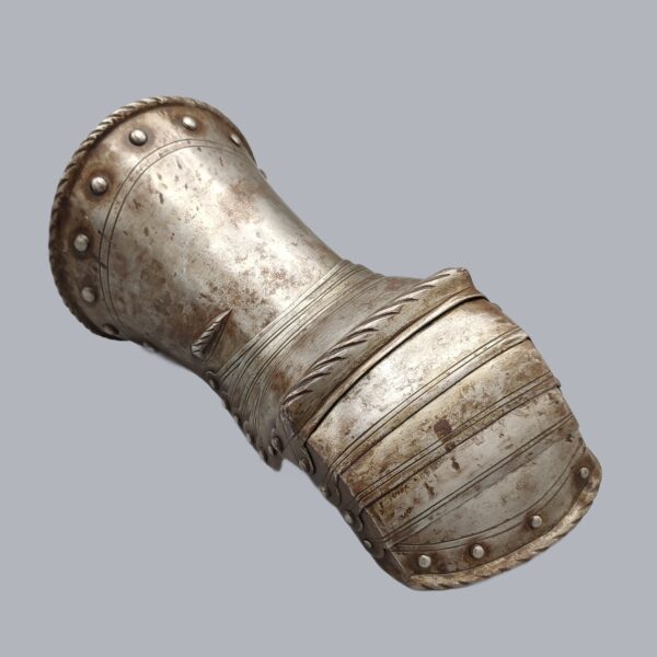 A German right-handed mitten gauntlet with finely roped edges and an original thumb. The thumb leather has been restored at some point. Few plates are somewhat loosely attached.