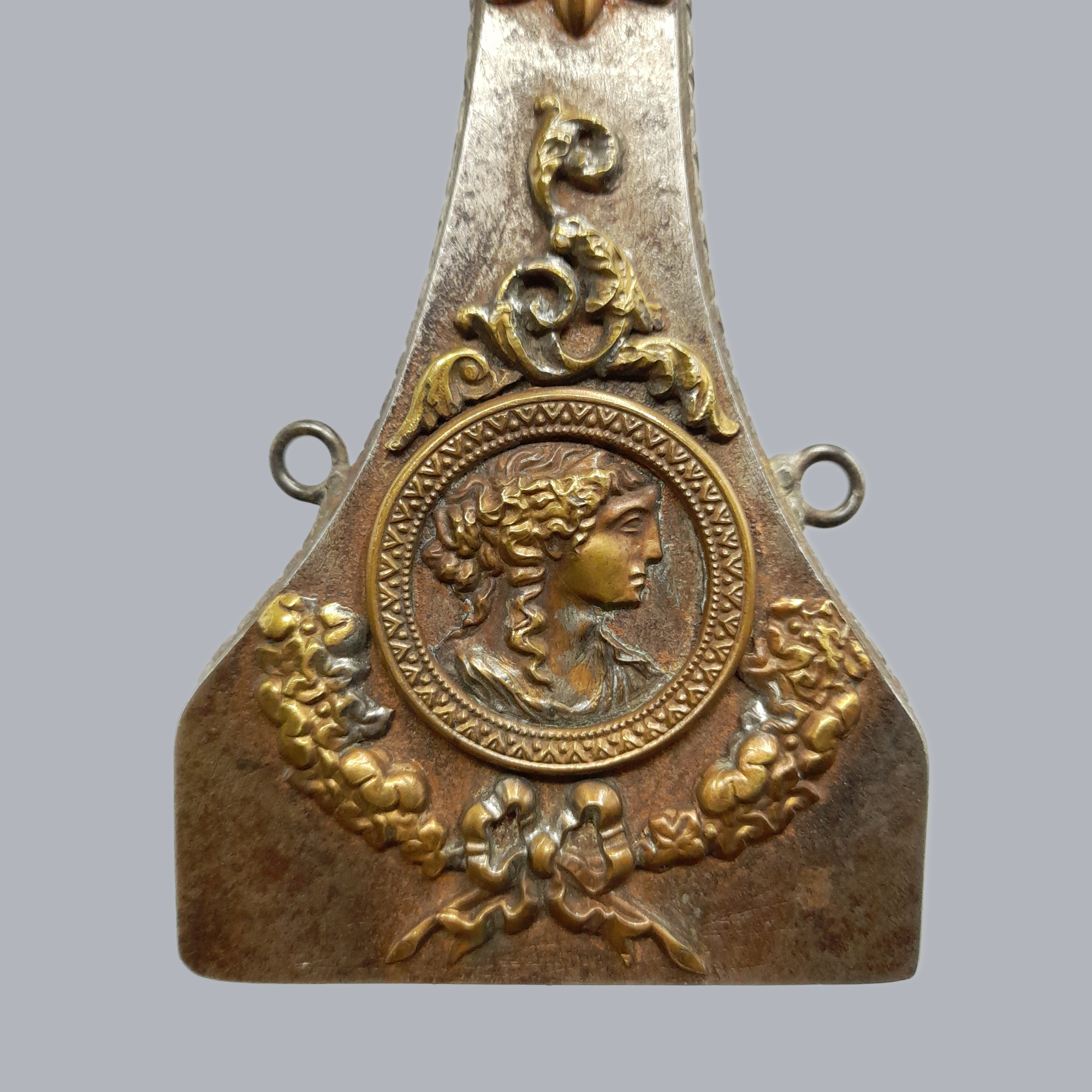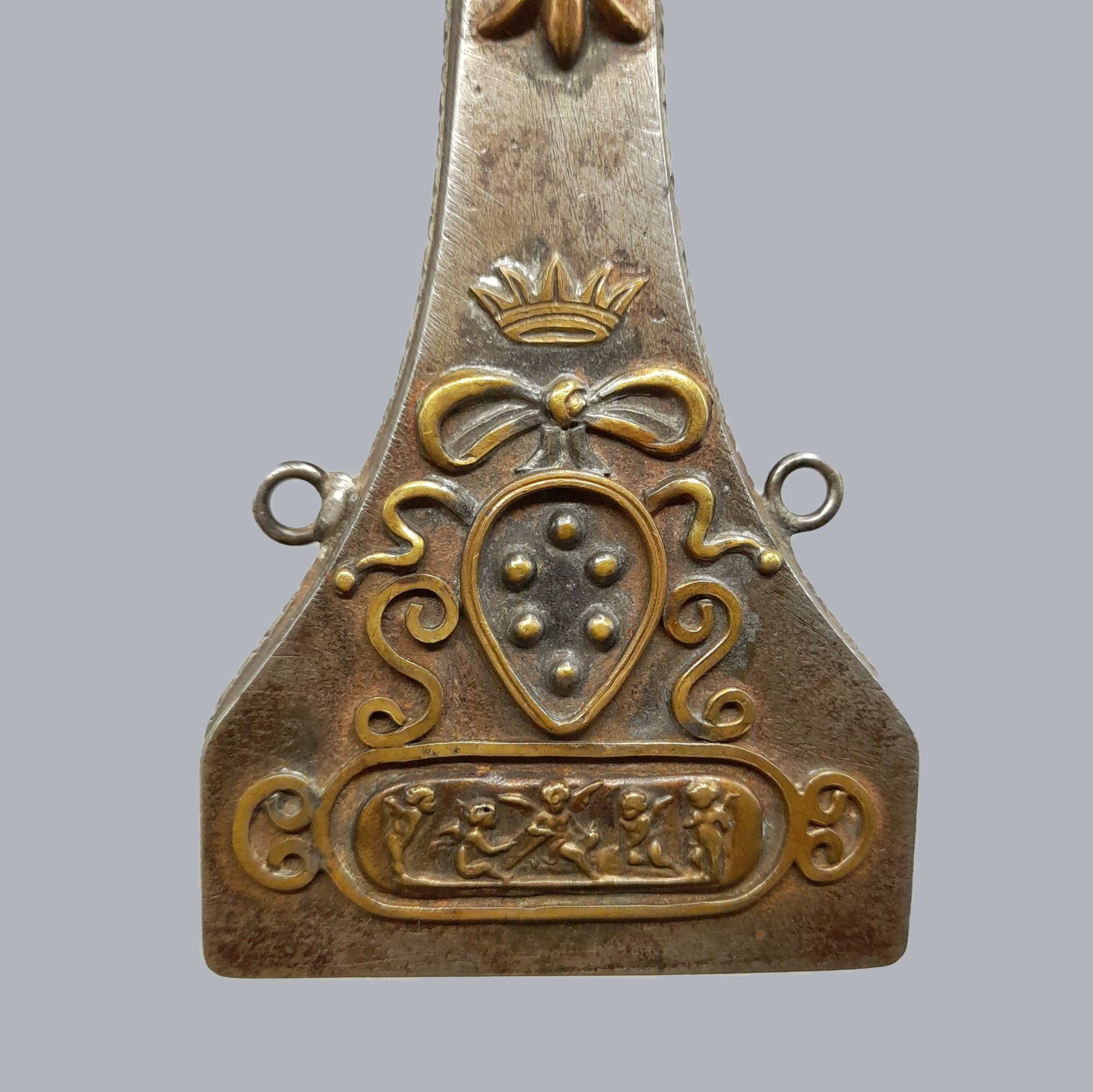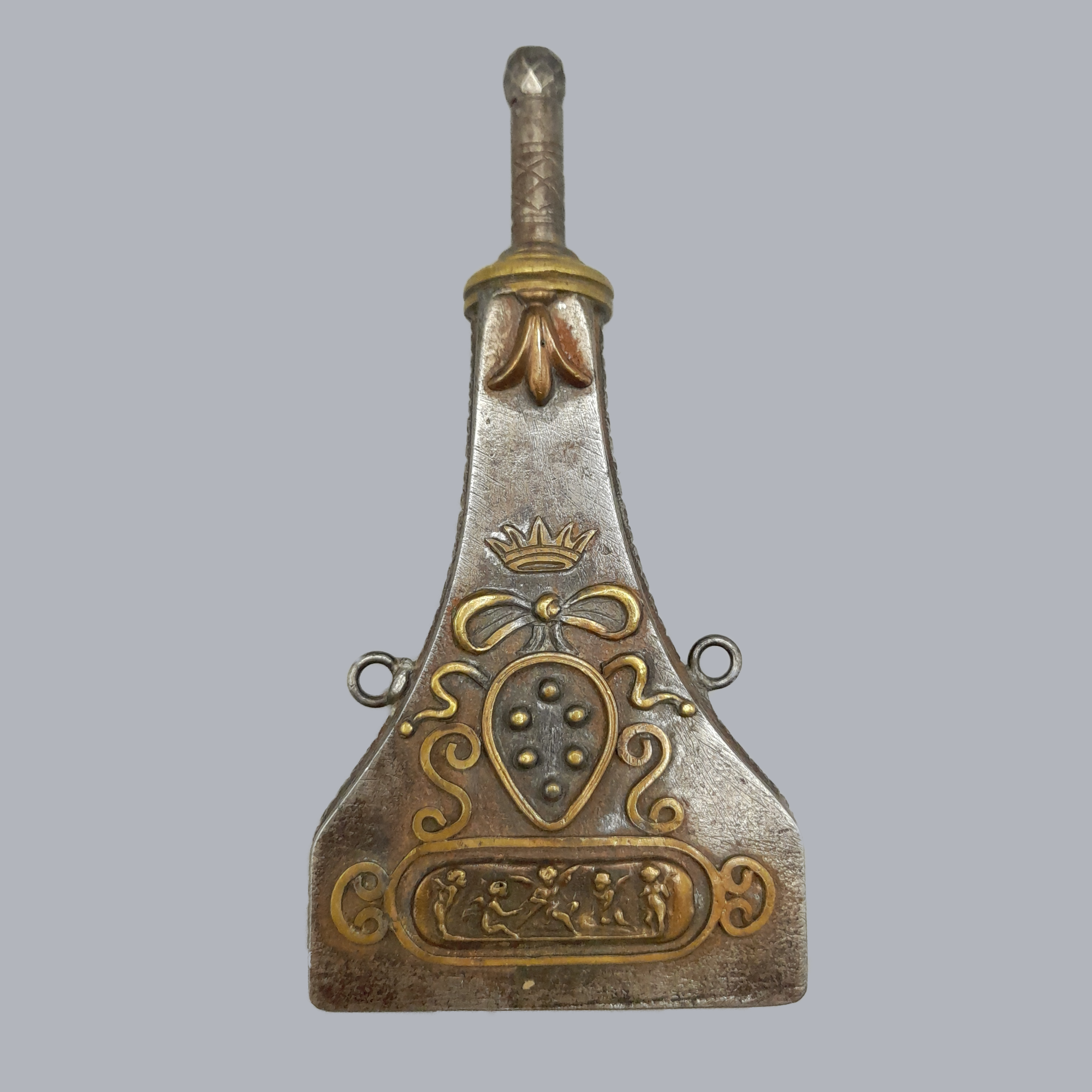 A bottle-shaped flask made of iron and decorated with applied brass fittings. The frontpiece is a depiction of what we believe to be Minerva (?) surrounded with leaves. On the backside is the coat of arms of the Medici family with puttis (cherubs) on the bottom.