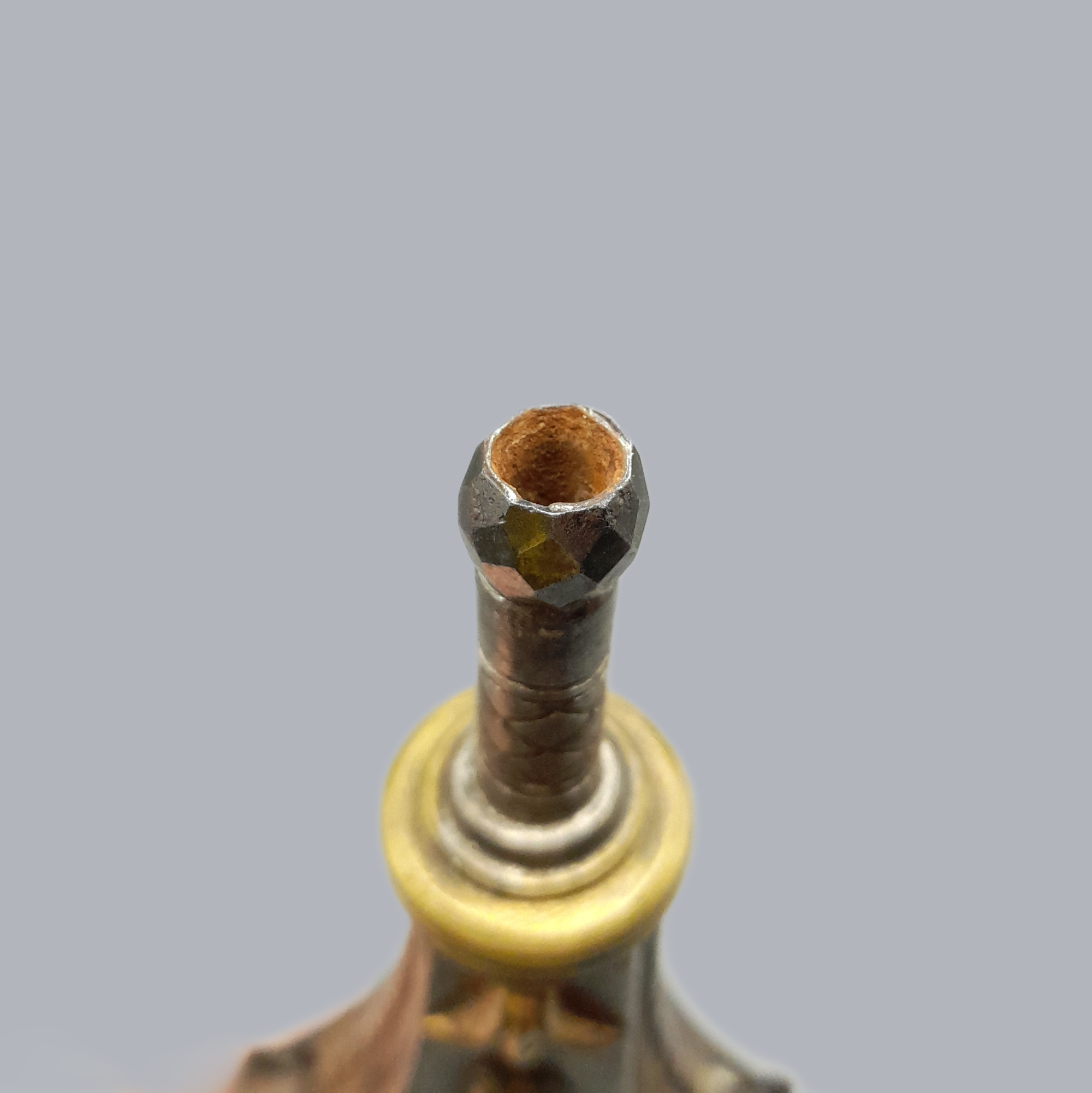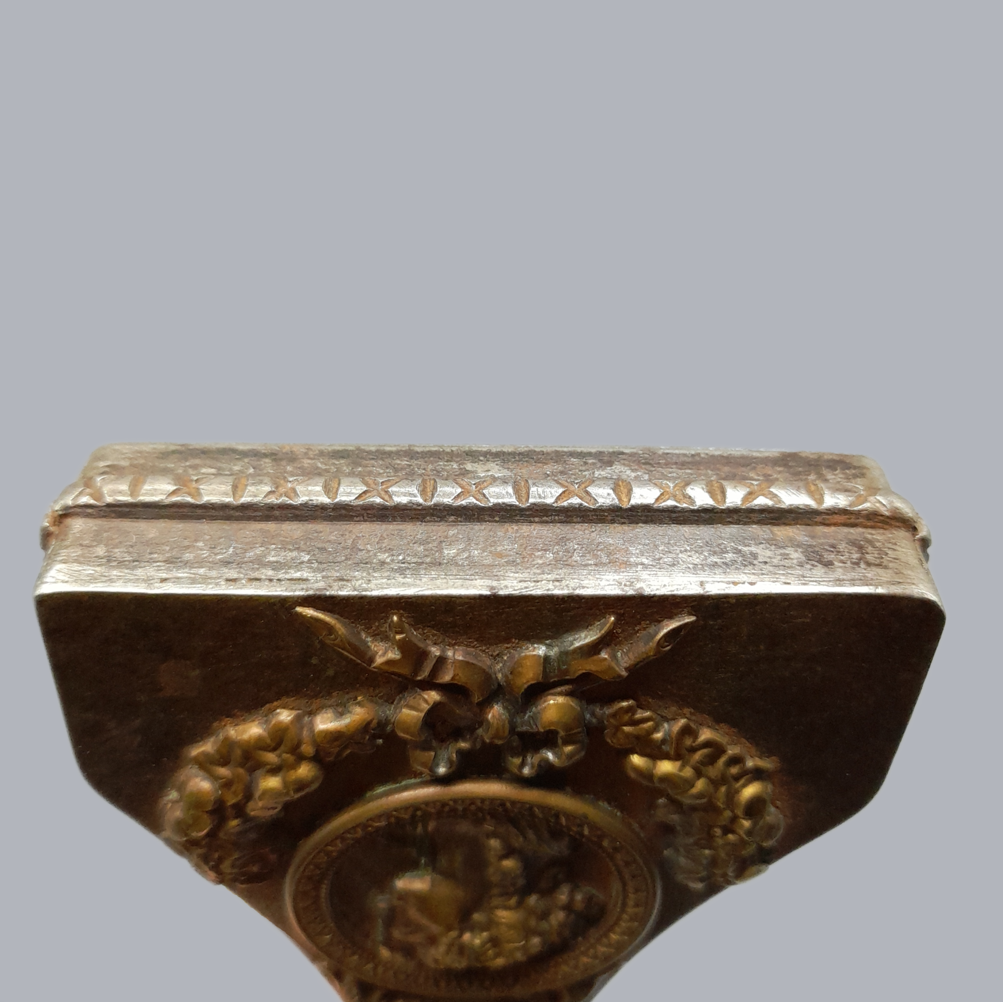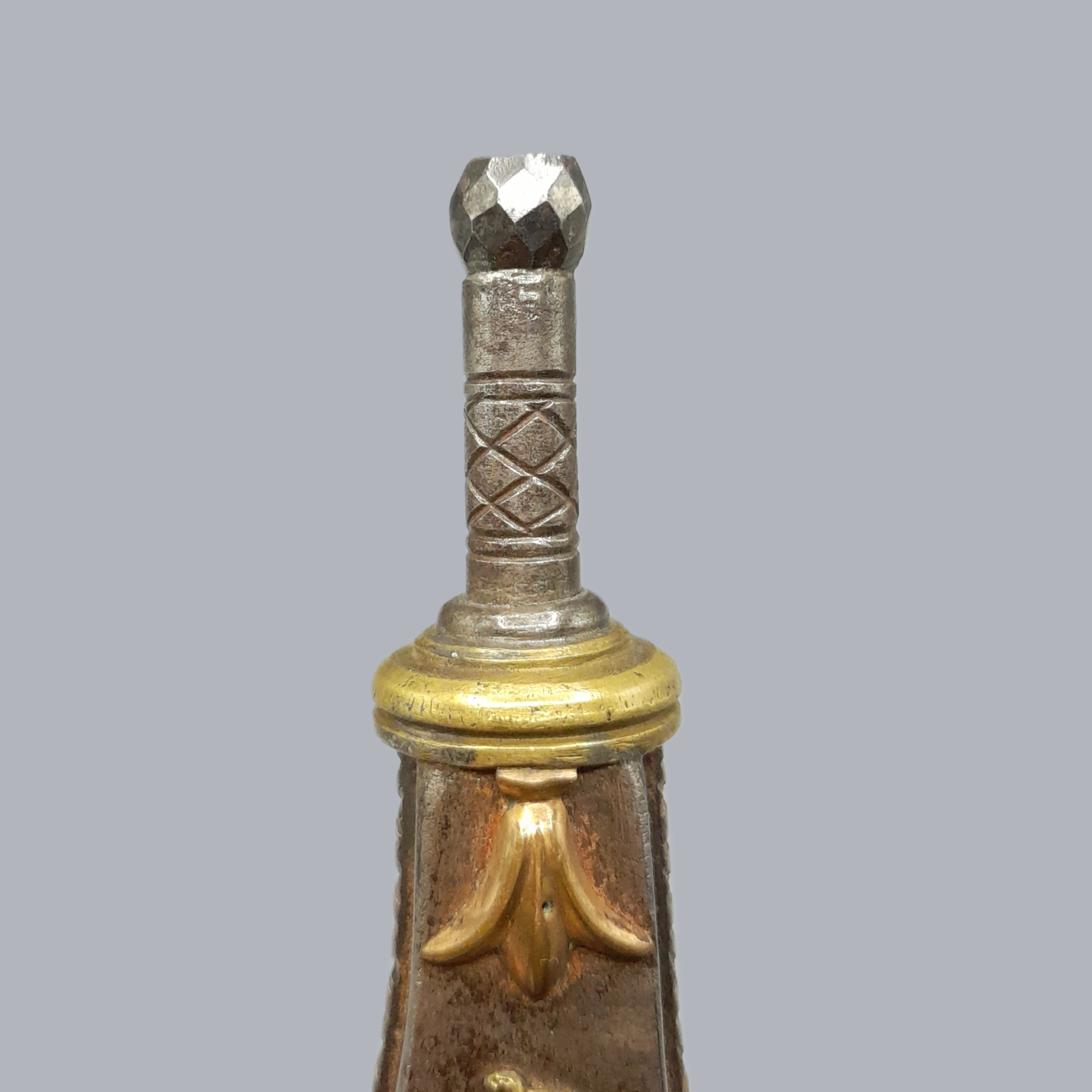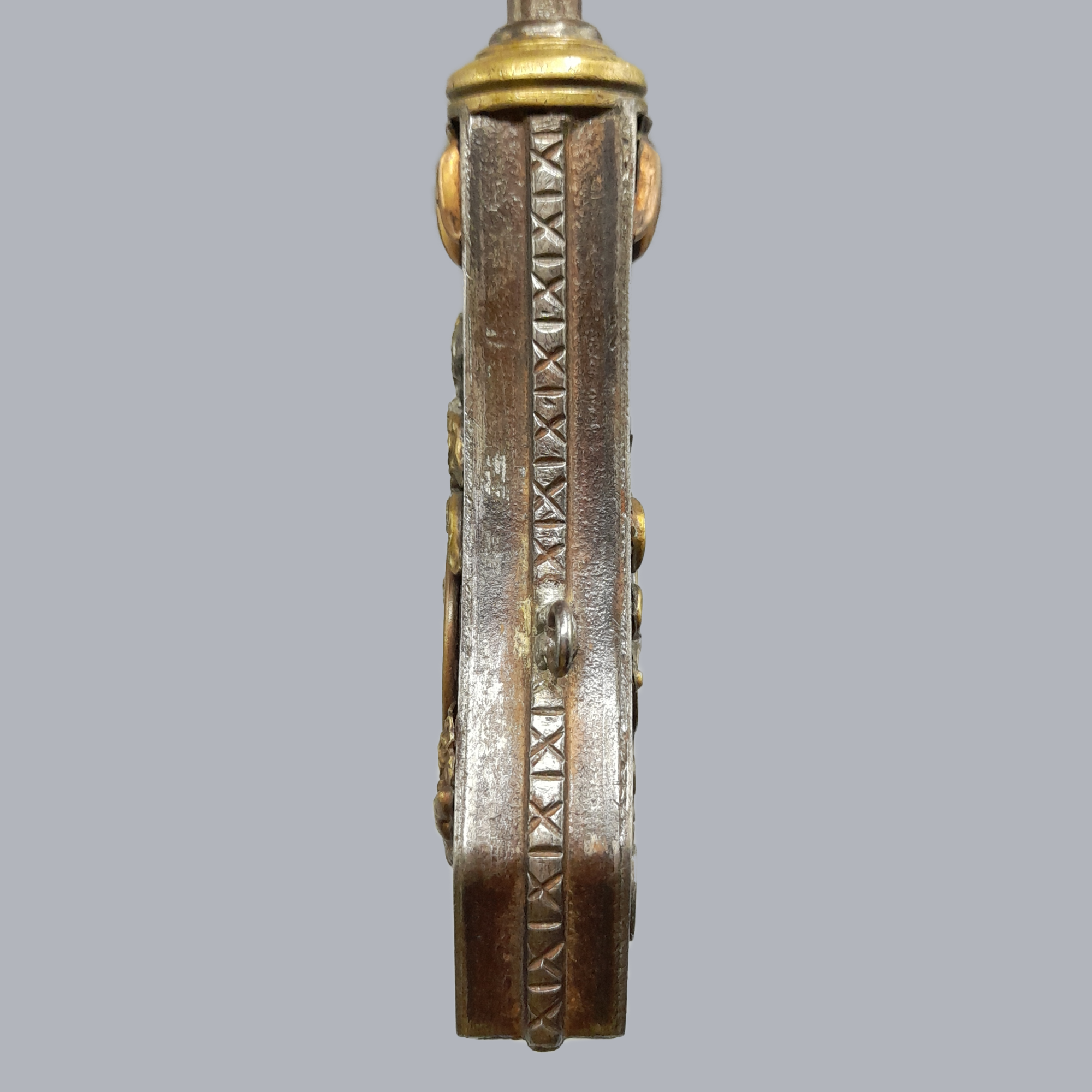 A bottle-shaped flask made of iron and decorated with applied brass fittings. The frontpiece is a depiction of what we believe to be Minerva (?) surrounded with leaves. On the backside is the coat of arms of the Medici family with puttis (cherubs) on the bottom.