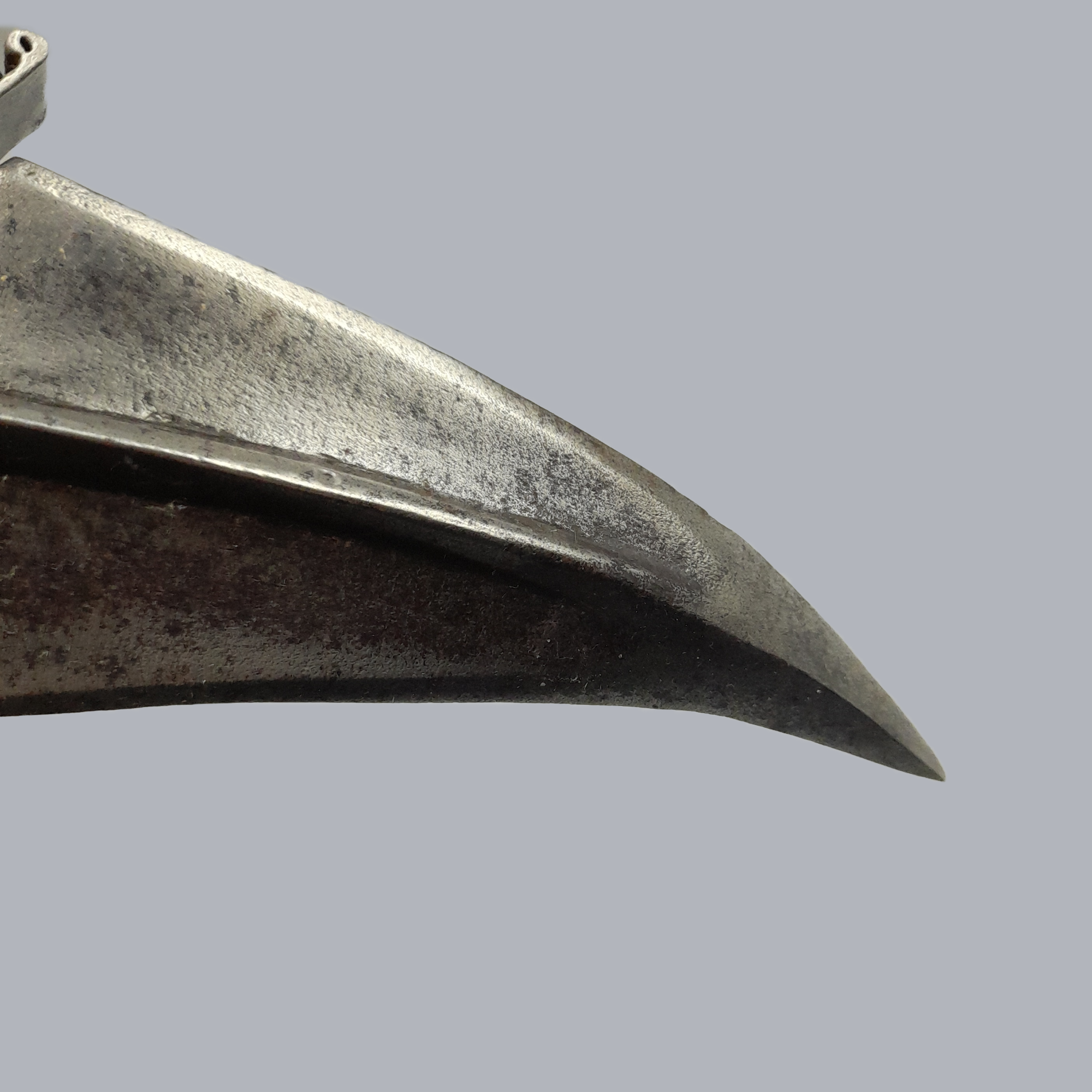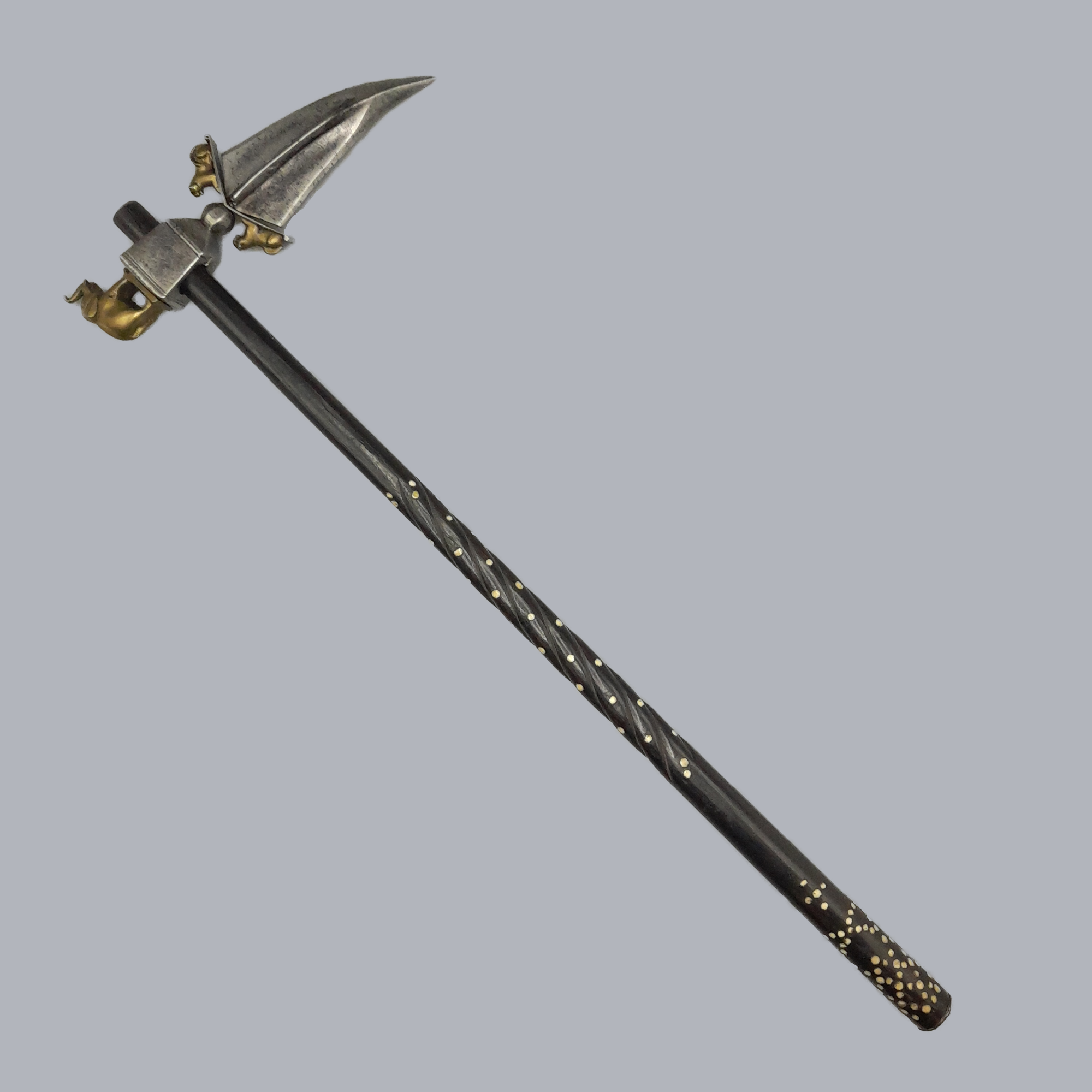 A 19th Century Indian Zaghnal Warhammer/War axe originating from India. A strong, steel axe head fitted onto a wooden rod. Axe head is decorated with brass lions and an elephant, which works as both counterbalance weight for the head as well as bearing religious and spiritual symbolism, relating to the Hindu deity Ganesh. Handle made of painted and carved wood with bone inlays in the form of little dots running down the rod.
