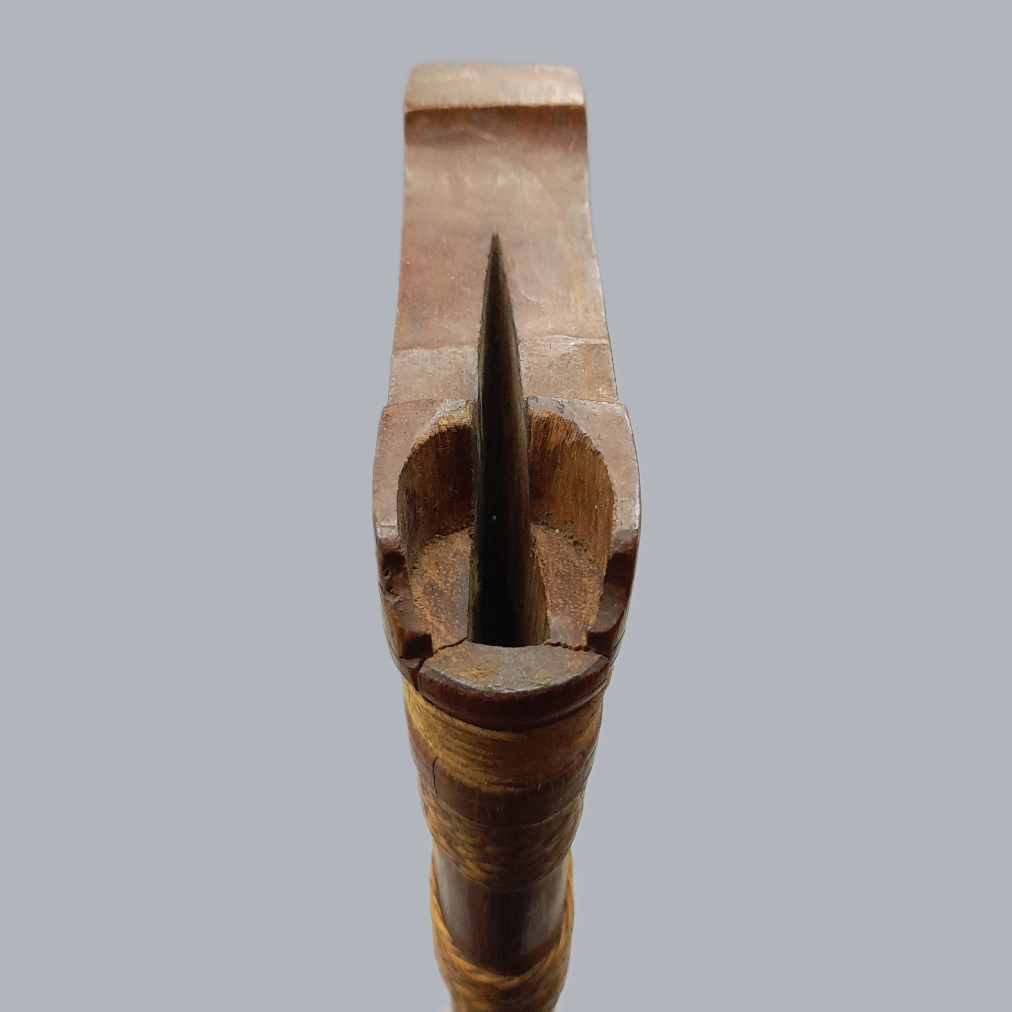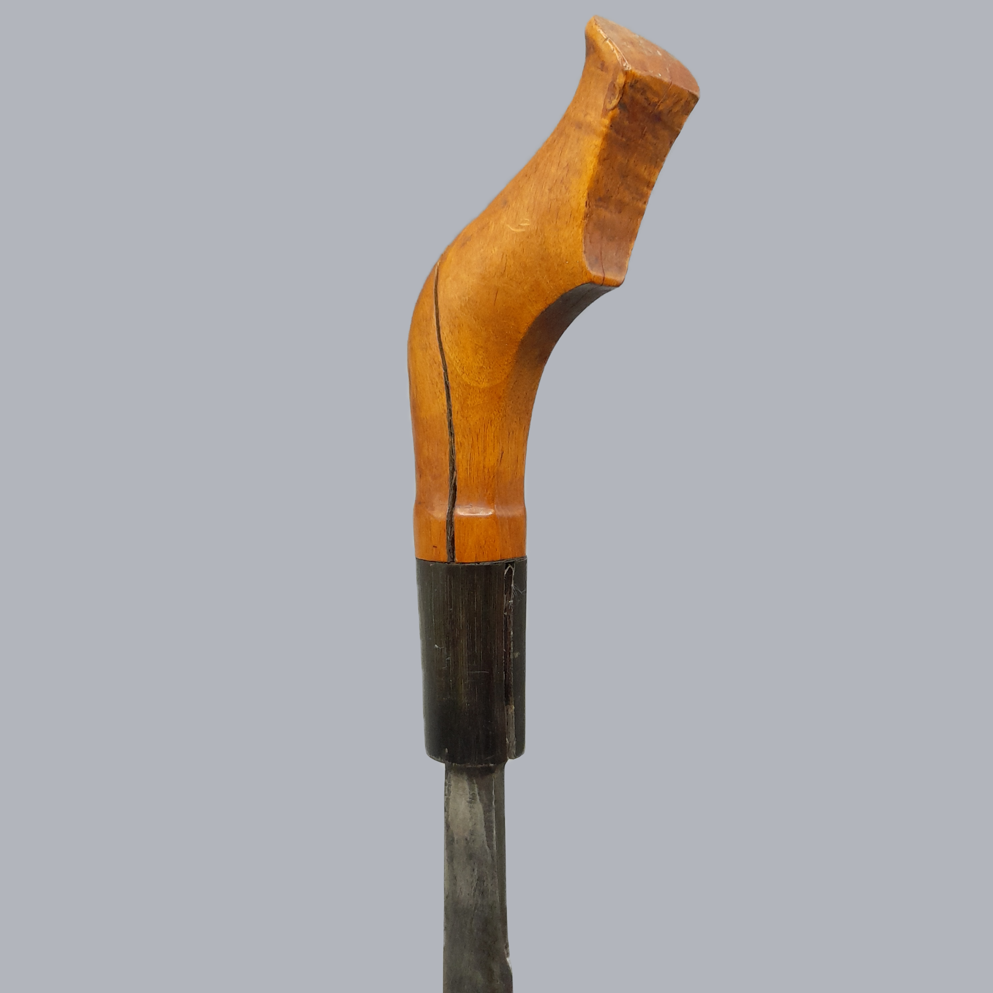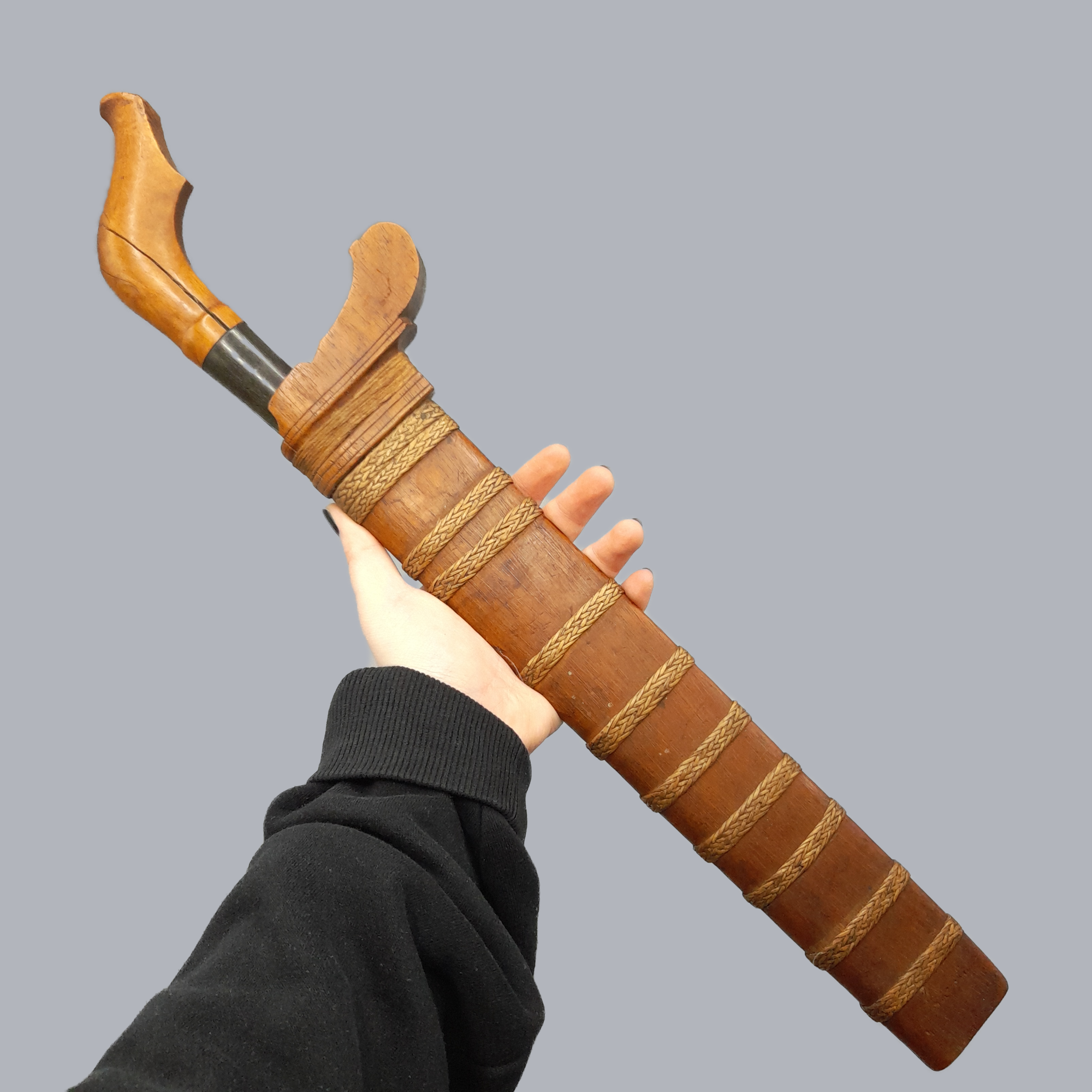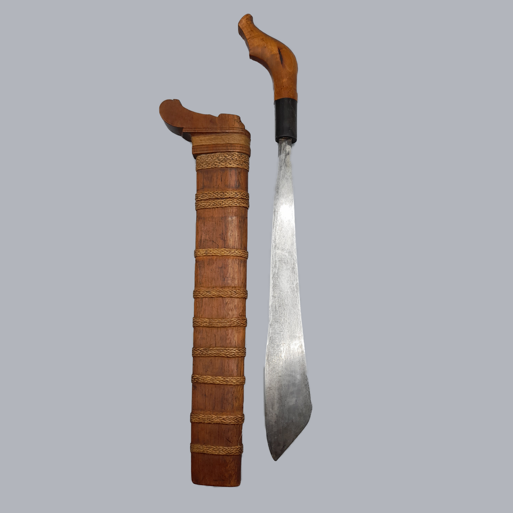 A sumatran pedang dagger originating from Indonesia, c. 19th century. A wide, unfullered and single-edged steel blade. A hardwood scabbard with woven reed decorations around it. Handle is made of carved hardwood as well.