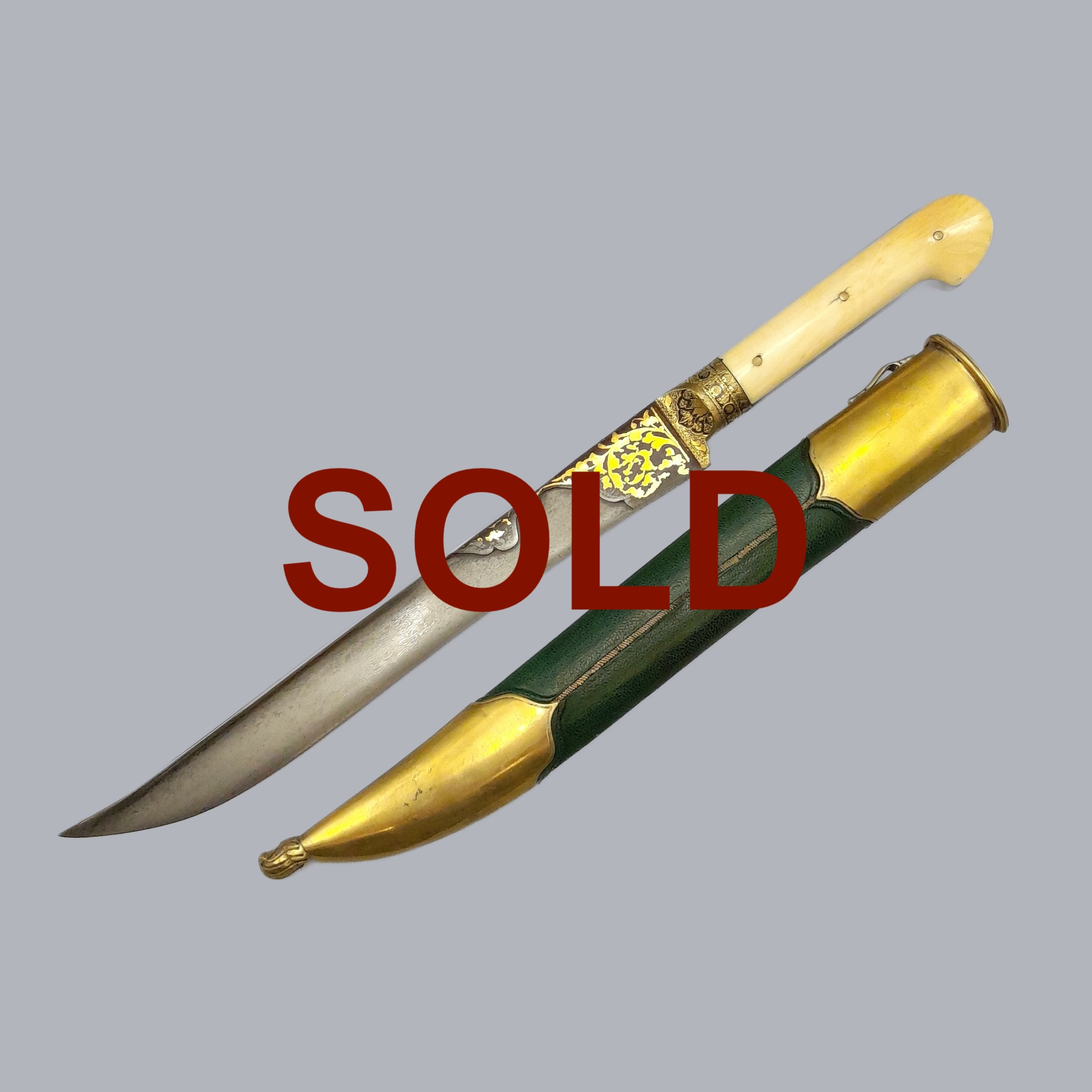 This is a typical yataghan style dagger with a recurved blade and a bone hilt. Brass parts of the handle are finely engraved with floral patterns. The blade is fine and unfullered with a separate chiseled area inlaid with gold patterns on one side. The other side is non-decorated. The scabbard is in great condition: it’s made of wood and covered in green moroccan leather and decorated with brass mounts.