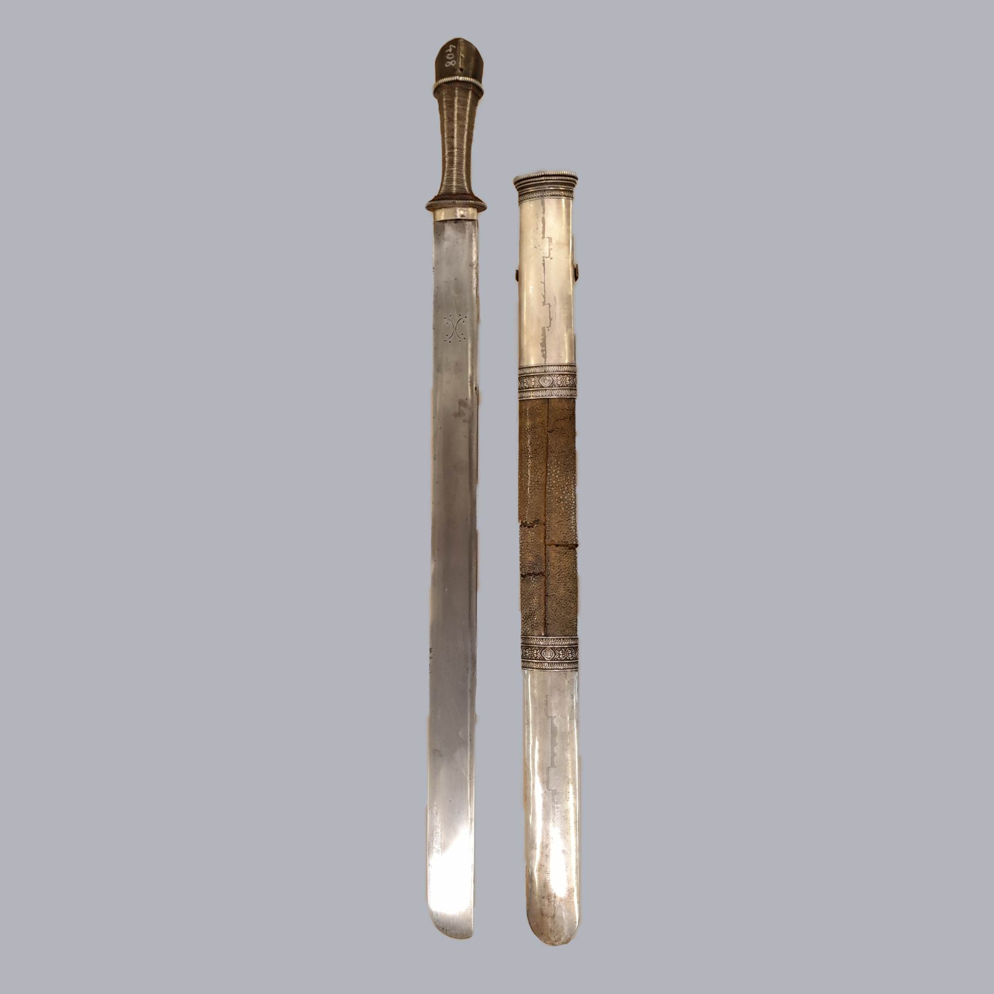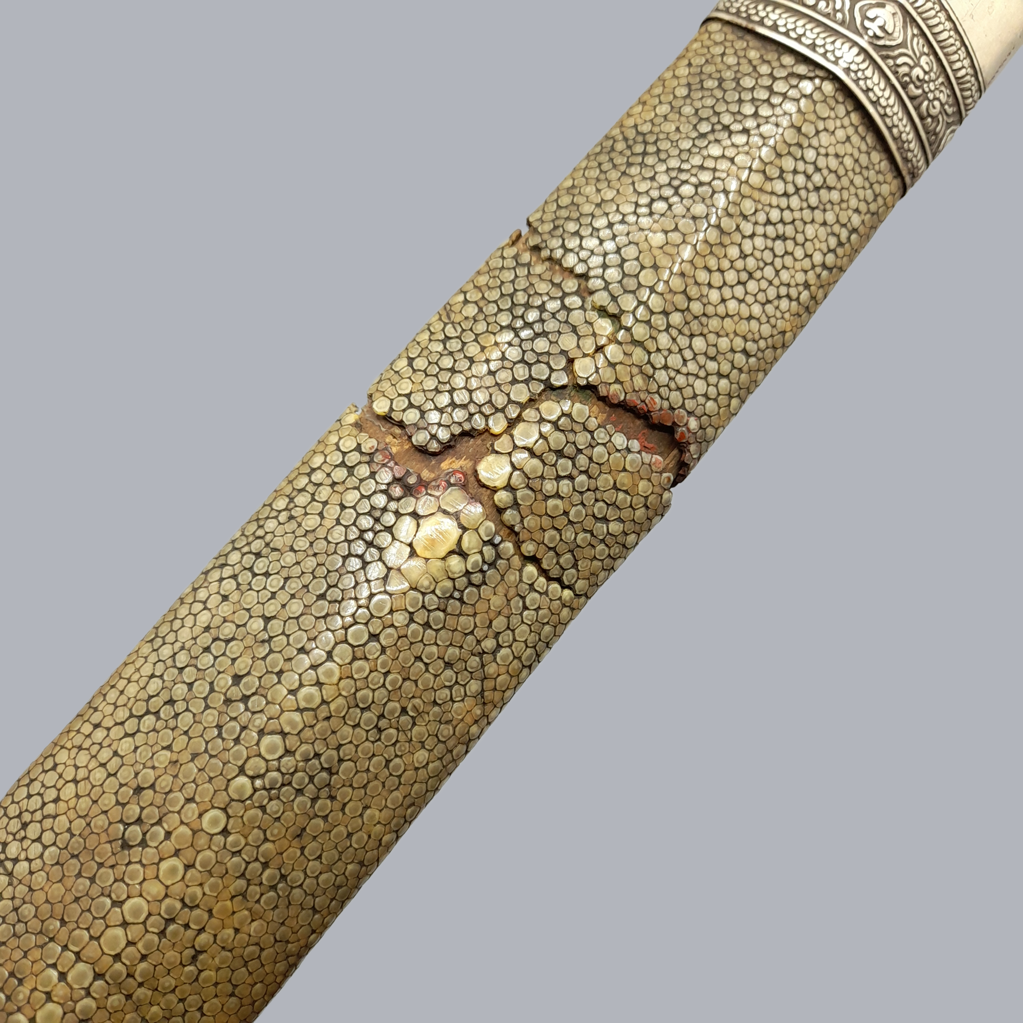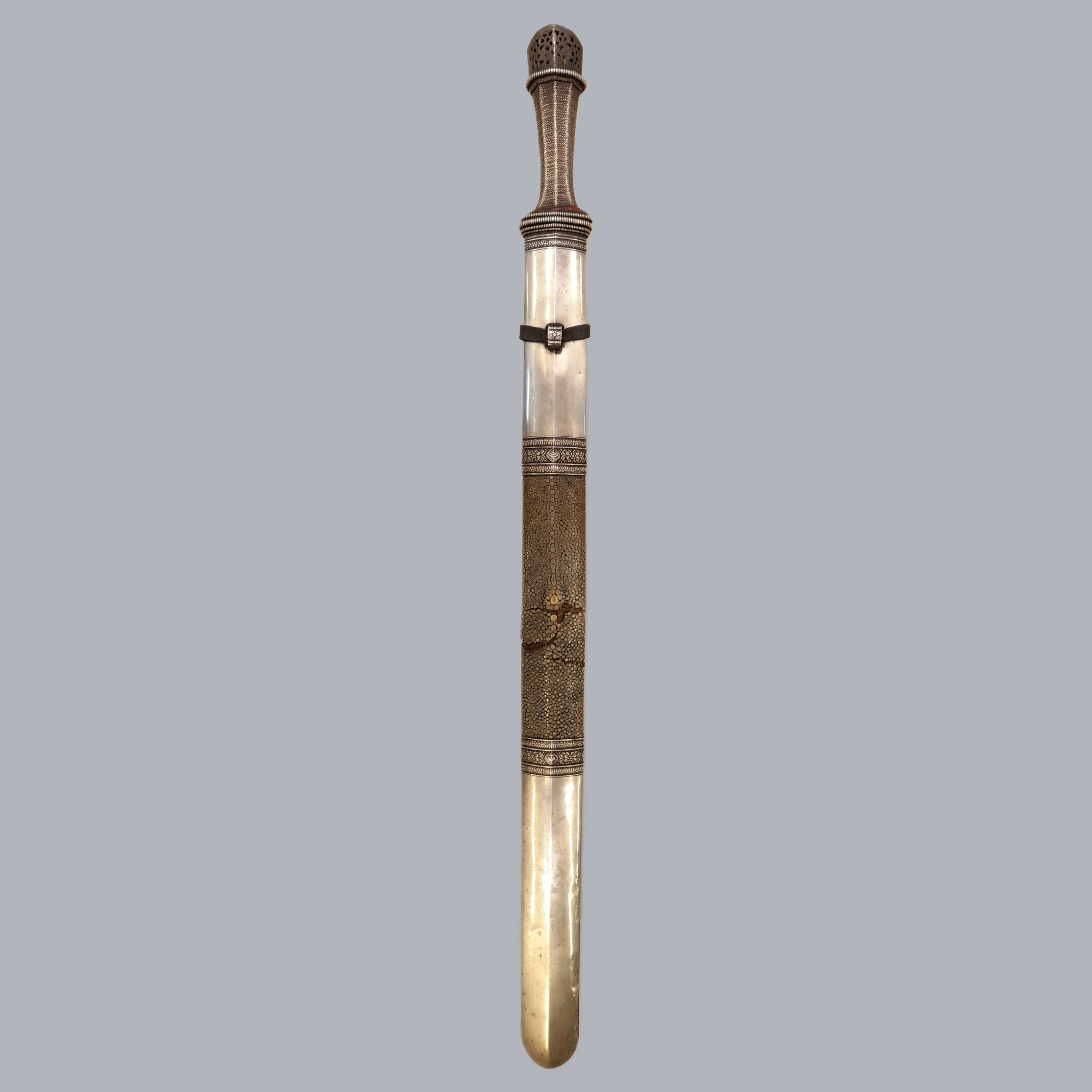 A fine and heavy bhutanese straight sword with low-grade silver mounts. Grip with a finely pierced pommel cap and is totally covered in thin silver wire. A wide single-fullered blade with an italian style sickle marking. A wooden scabbard with floral decorated white metal mounts. The middle part of the scabbard is covered in manta ray skin.
