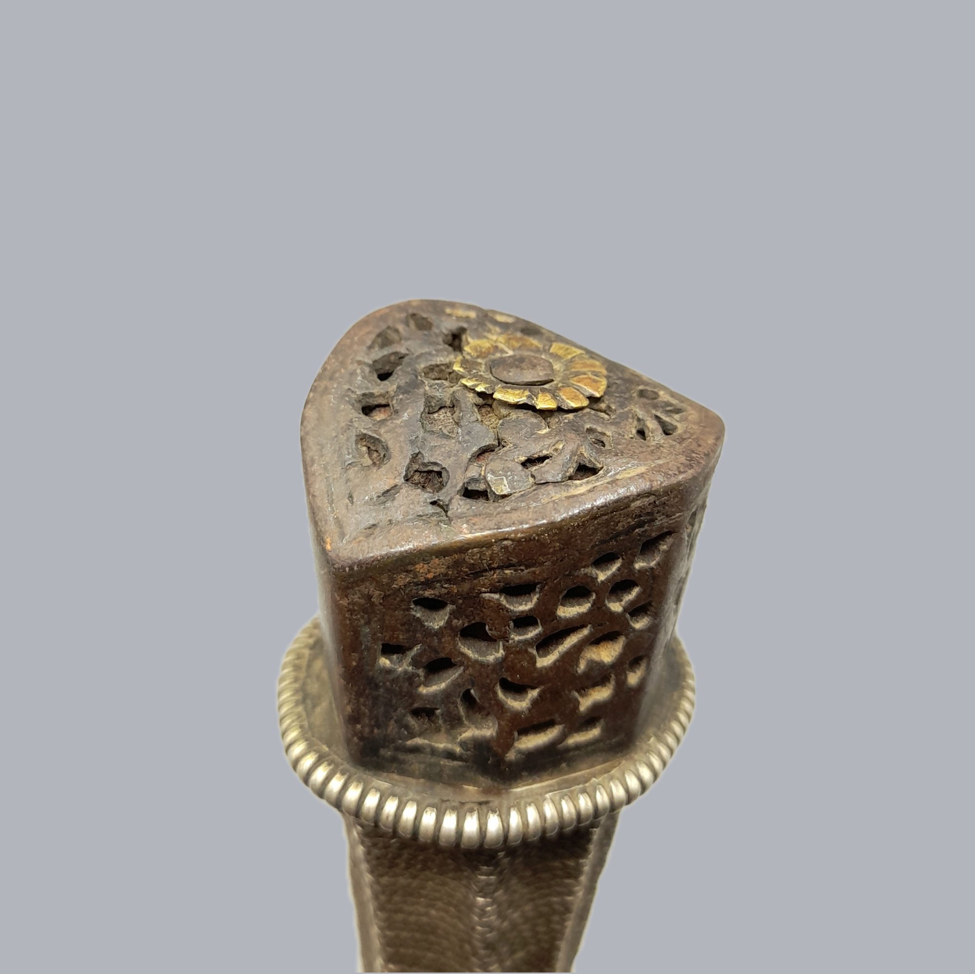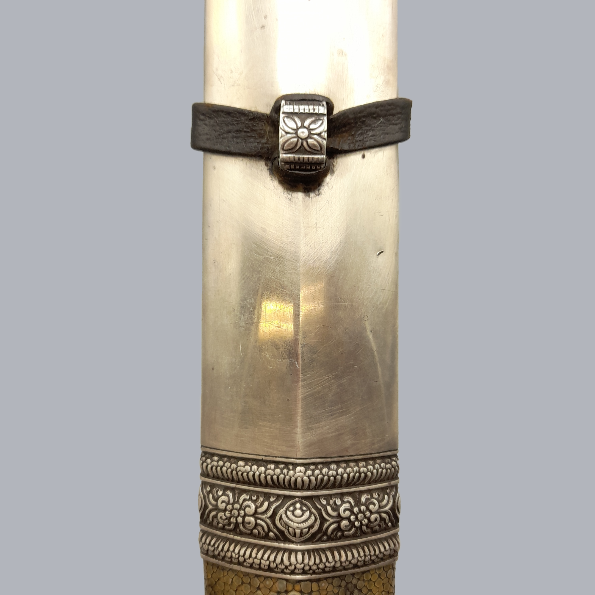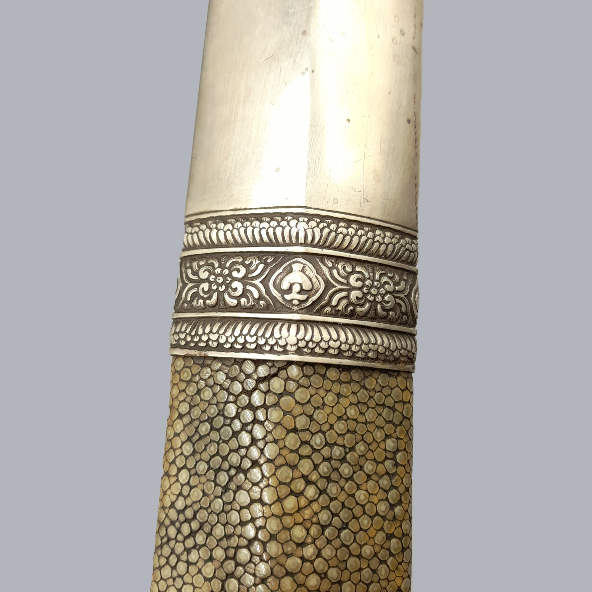 A fine and heavy bhutanese straight sword with low-grade silver mounts. Grip with a finely pierced pommel cap and is totally covered in thin silver wire. A wide single-fullered blade with an italian style sickle marking. A wooden scabbard with floral decorated white metal mounts. The middle part of the scabbard is covered in manta ray skin.