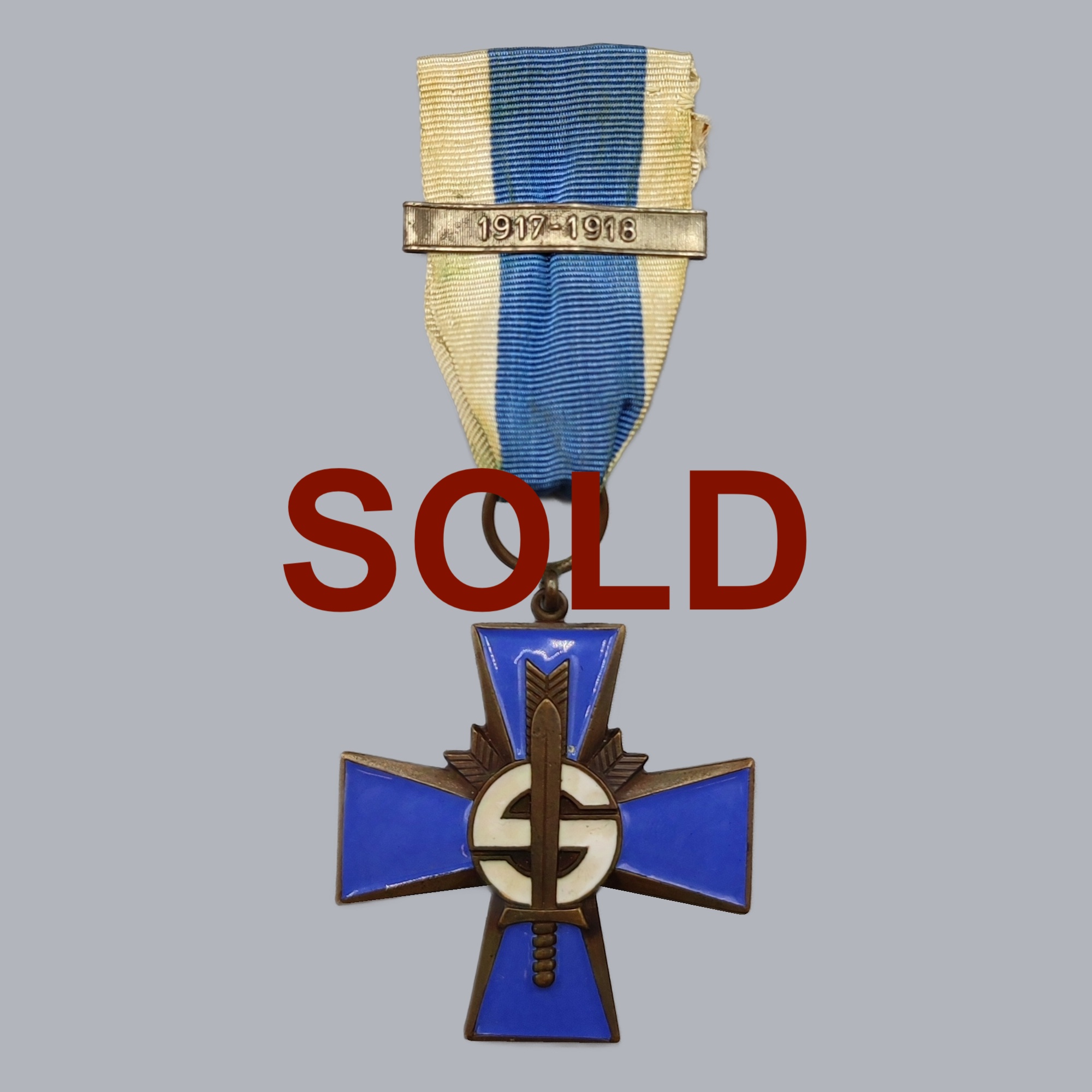 An original military commemorative cross ‘Blue Cross’ (Sininen risti) with the 1917-1918 bar awarded to the Finnish Civil Guard soldiers (Suojeluskunta) participated in the Finnish Liberation war 1917-1918. The blue-and-white-enameled tombac cross has its original blue-and-white ribbon attached. No manufacturer markings.