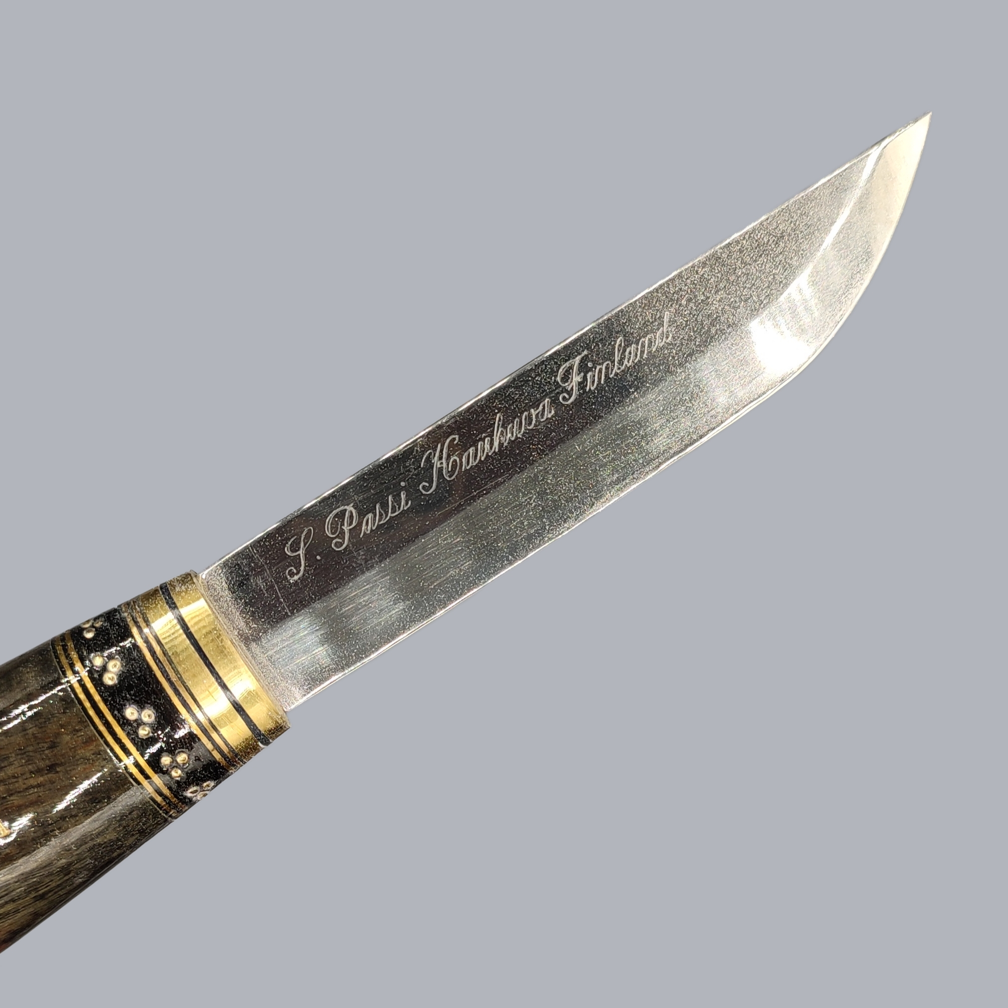 A tributal Finnish puukko knife with the emblems of the Carelian Civil Guard (Karjalan Suojeluskunta) made by the famous knifemaster Simo Passi in Kauhava, Finland, approximately in the early 2000s. The steel blade is marked by the manufacturer and numbered (325). The knife is in very good, unused condition.