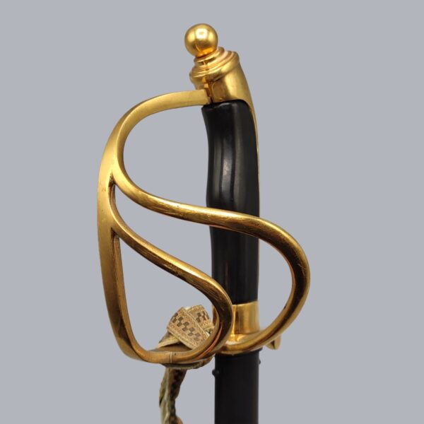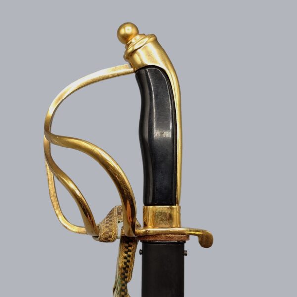A vintage Finnish M/1922 NCO officer sword with bakelite-gripped brass hilt and black-painted steel scabbard. The pattern was designed by Akseli Gallen-Kallela. An original portepe is attached. The steel blade is marked by the Solingen manufacturer F.W. Höller on the ricassso. The leather washer is intact. The sword is in good vintage condition with minor signs of wear. The scabbard has a few (glue?) stains which didn’t not come off with conventional cleaning.