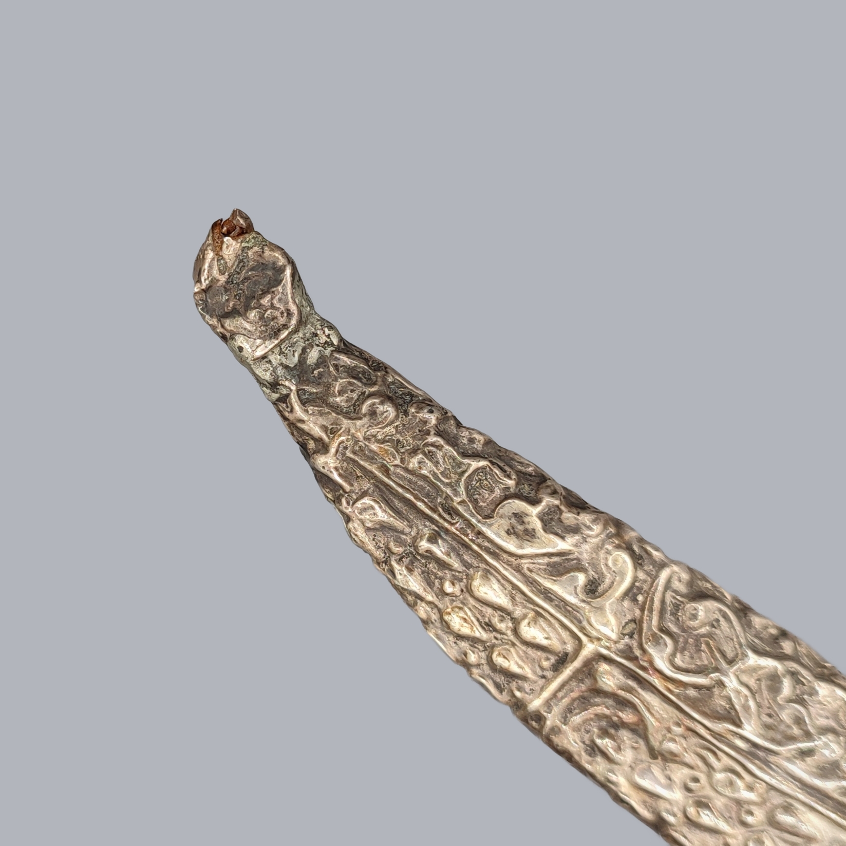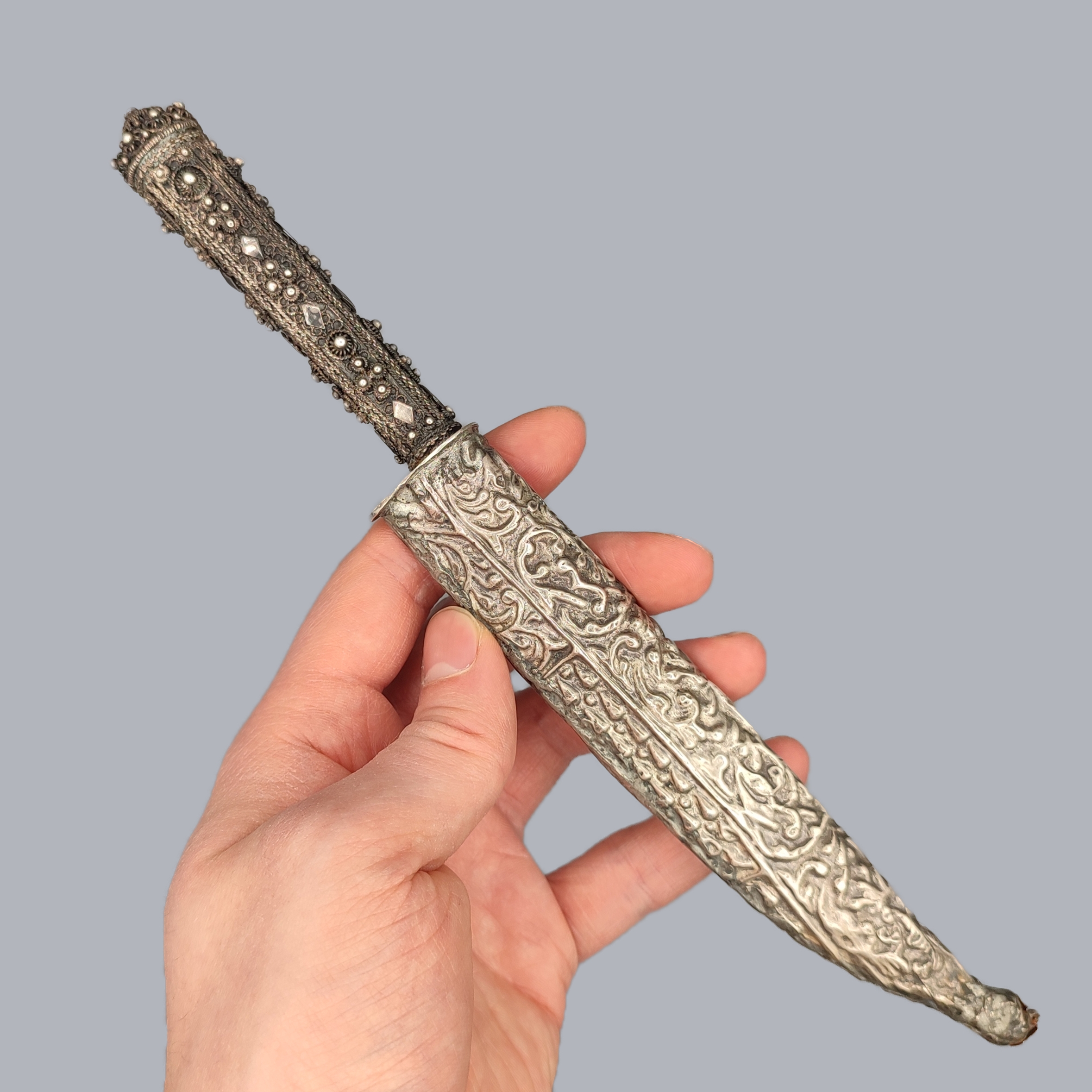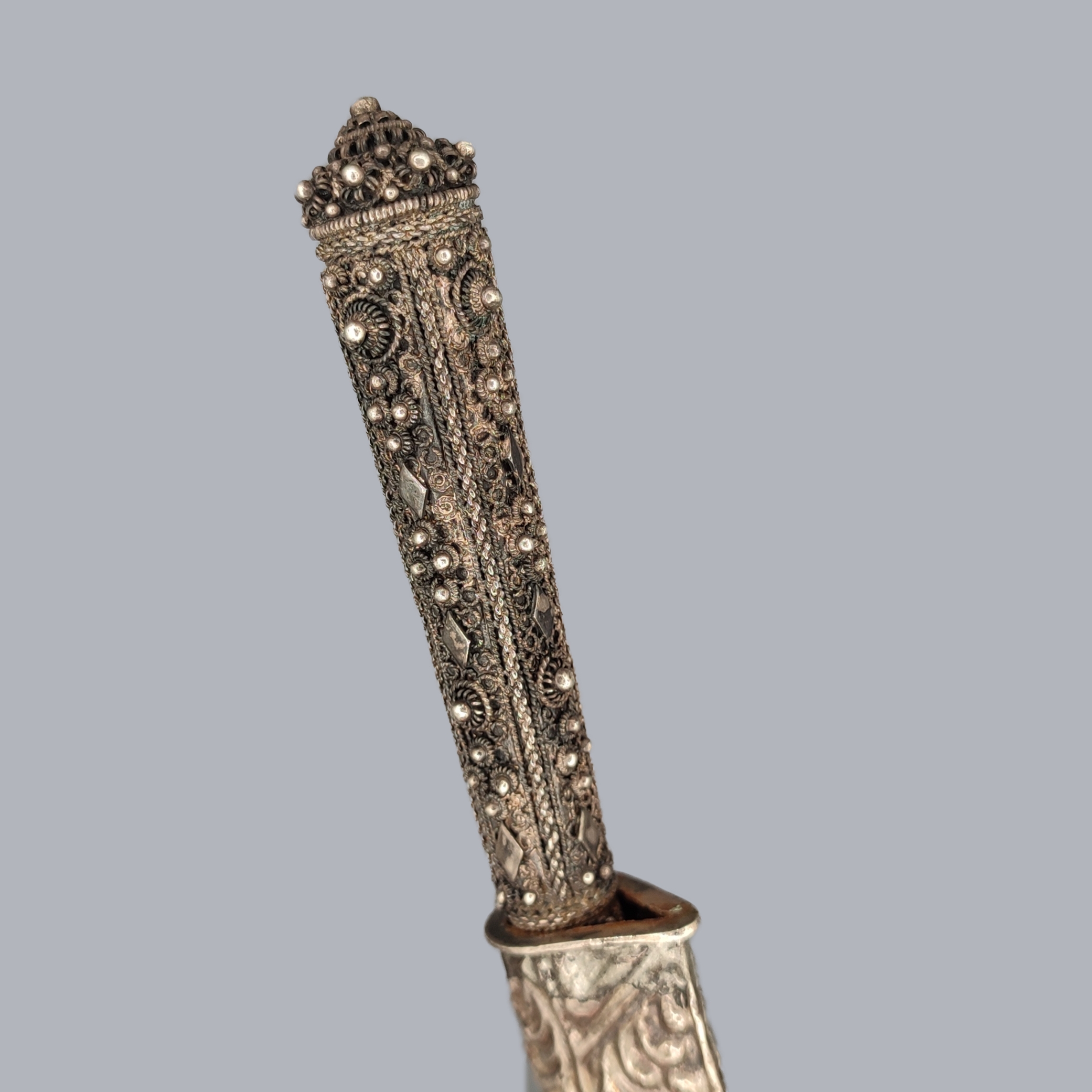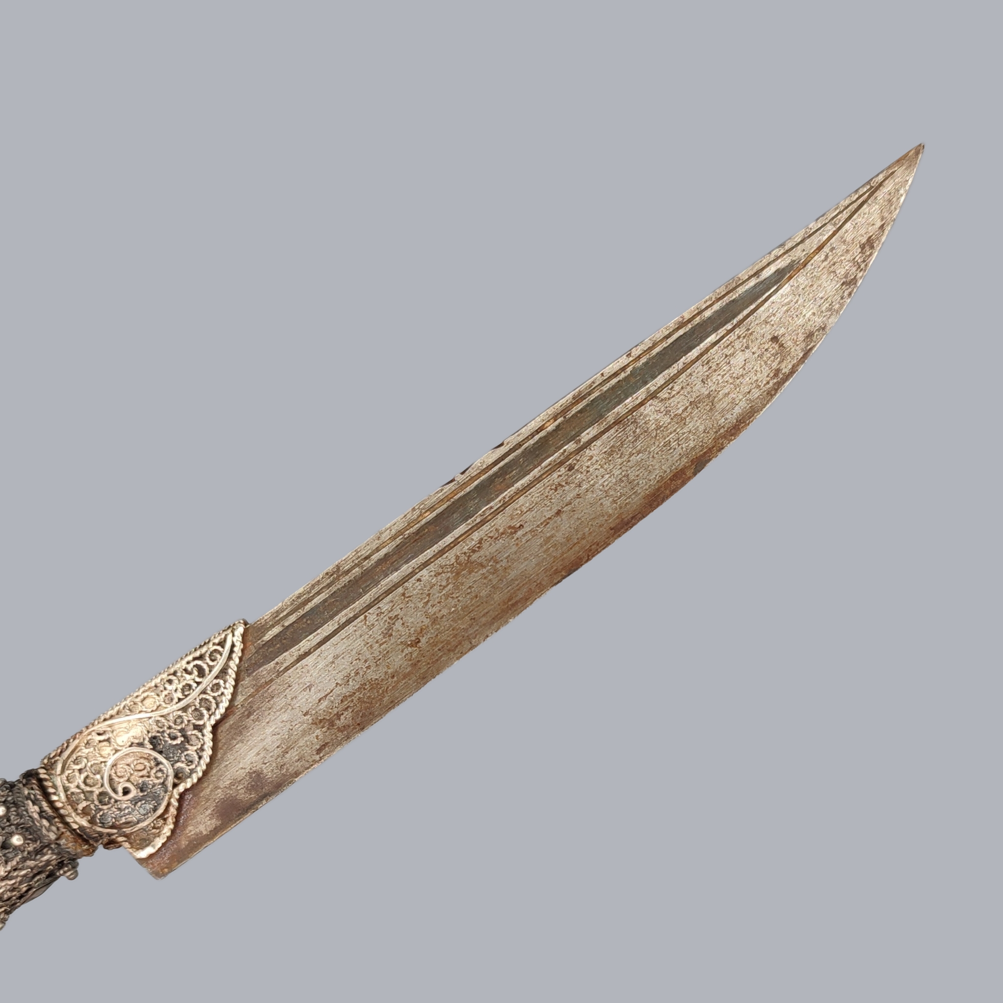 The knife is in good antique condition with minor signs of age and wear. The filigree mount between the handle and the blade is slightly loose. The tip of the scabbard is slightly damaged.