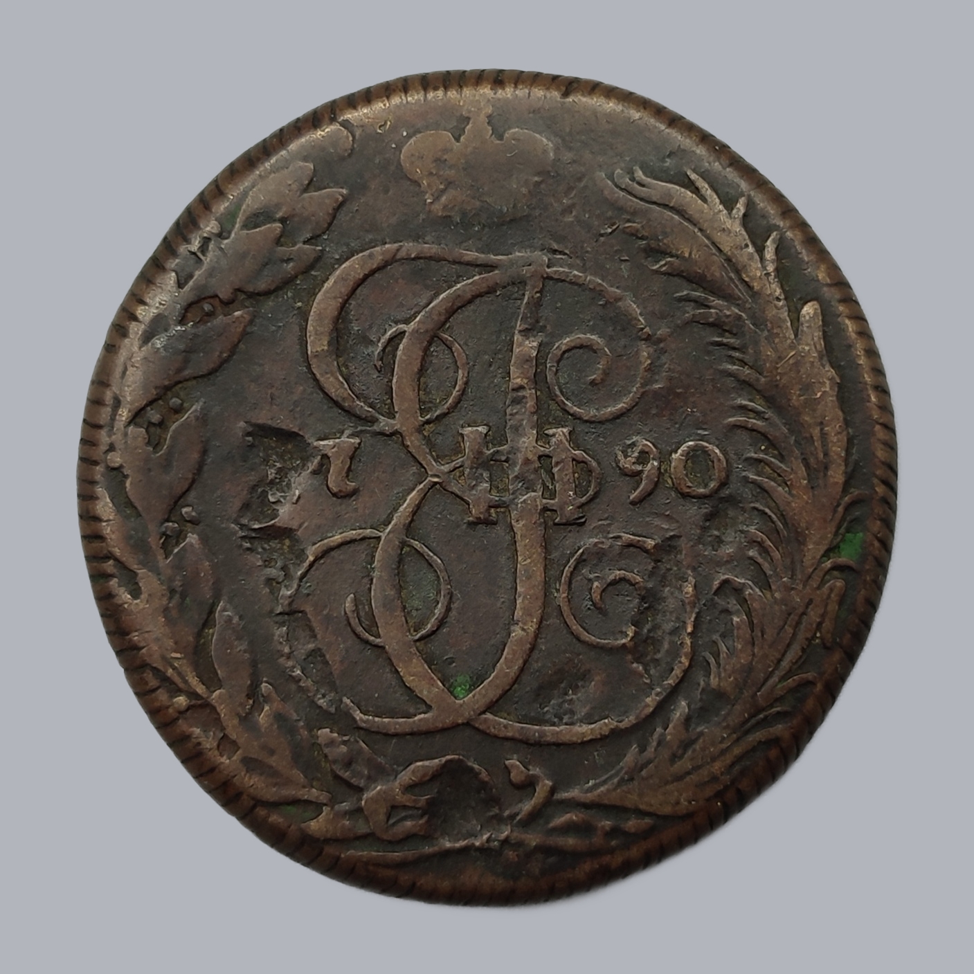 An original 5 kopecks copper coin from the era of Catherine the Great (Ekaterina II), minted in Suzun Mint (KM) in 1790. Condition as pictured.