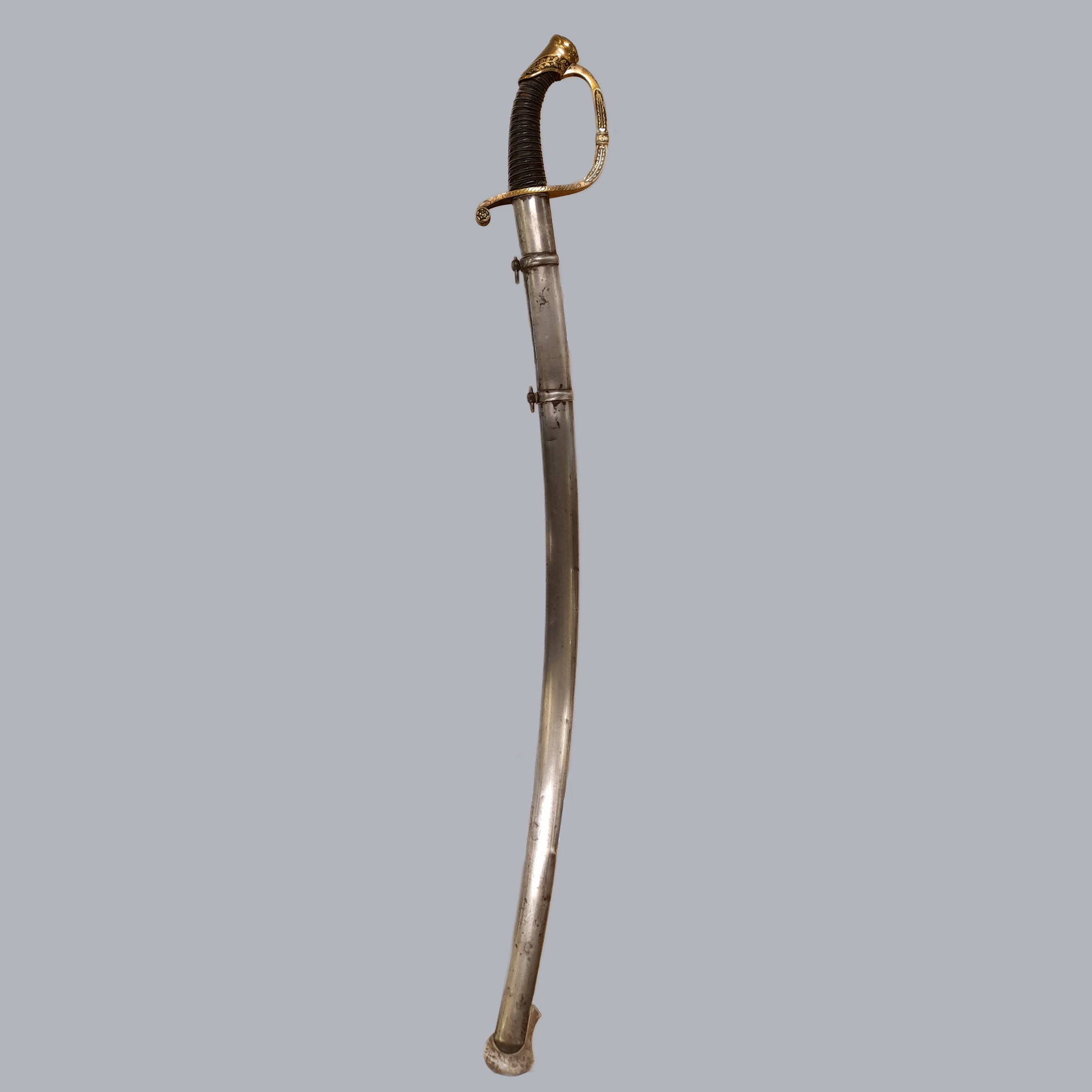 An imperial russian dragoon honor sabre for St. Anna, M1865. The sabre is of regulation pattern with “for bravery” engraved on both sides of the crossguard. St. Anna’s badge is attached on the pommel. This sabre has a german manufactured blade by G. Grah and a steel scabbard. This sabre model was officially patterned in 1849 and a new regulation came up in 1865 to change the wood-leather scabbard for a steel one.