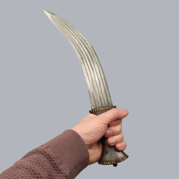 A fine all-steel antique khanjar dagger made in pattern-welded steel. The five-fullered steel blade has fine pattern-welded damascus visible. The handle is decorated with gold koftgari flowers around the edges. This fine dagger is forming a pair with our all steel damascus tulwar with beautiful patterns throughout the handle and blade. The item is in good antique condition.
