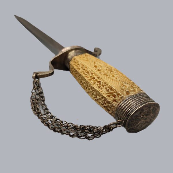A high-quality and unique Javanese spearhead dagger with deeply engraved bone hilt with floral patterns and crossguard with cross chain of a European naval style from the first part of the 19th century. The wooden scabbard is covered with black leather and fitted with large silver mounts. The triangular steel blade has a strong pattern typical for the Javanese region. The dagger is in good antique condition with minor signs of wear. The item seems to be a quite unique object of the style and it has probably been made for an officer serving under the European rule in Java.