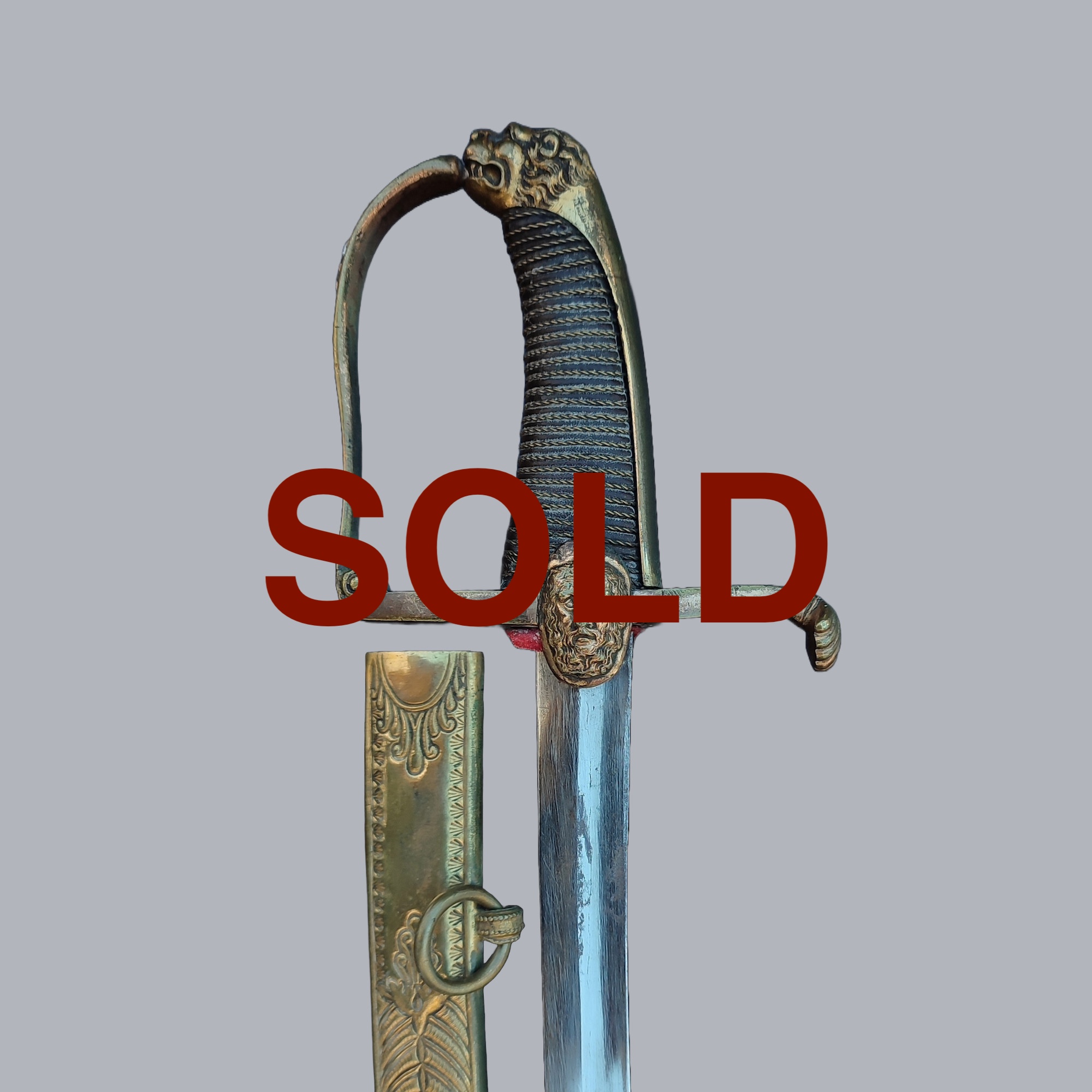 Gilded brass mounts, no markings. Leather scabbard with gilded floral-decorated brass mounts. Handle depicting a medusa head and a sculptural lion. Leather scabbard with a defect but still in one part.