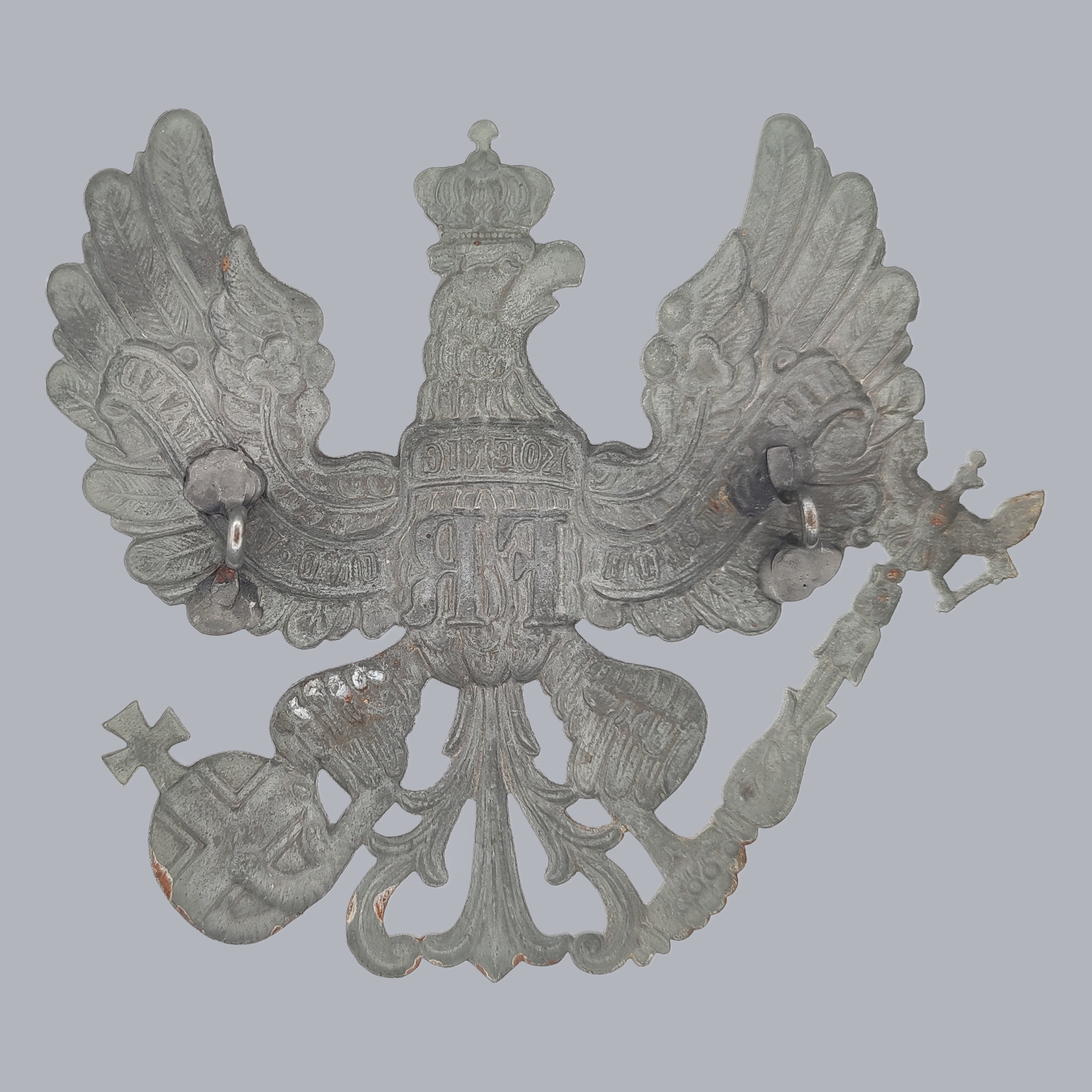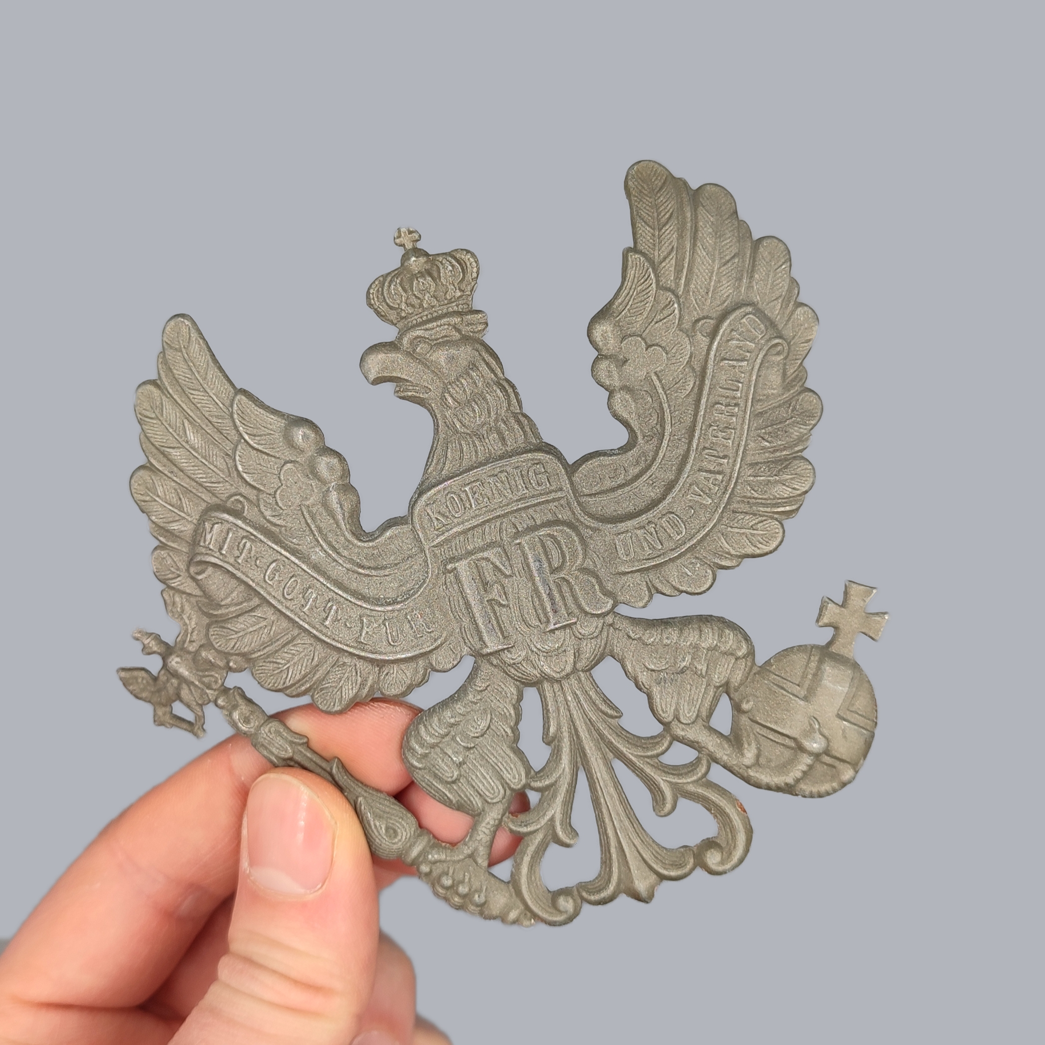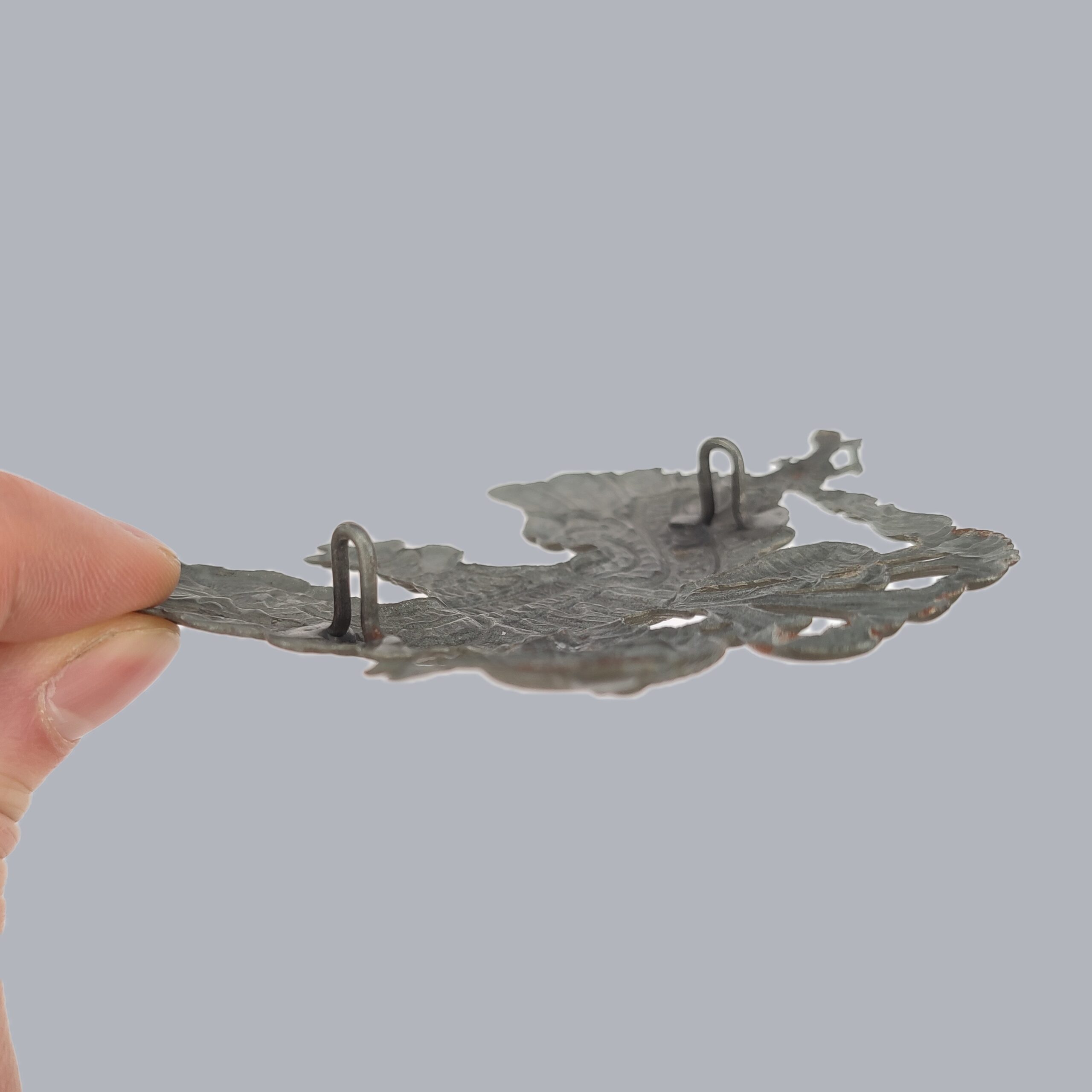 An antique WWI shako helmet eagle manufactured in Prussia, approximately in the 1910s. The eagle is made of field-grey painted iron. The reverse side is with two attachment loops.