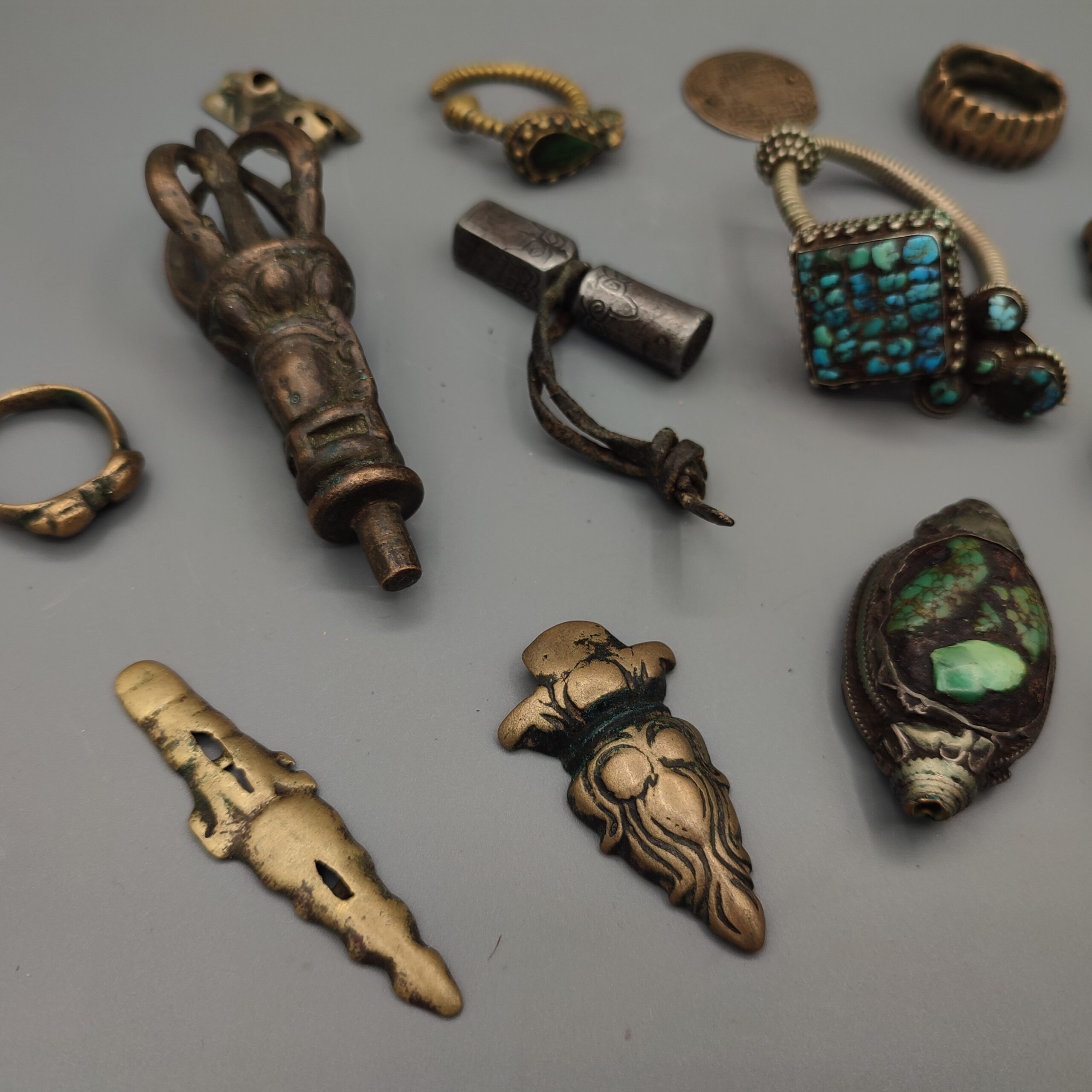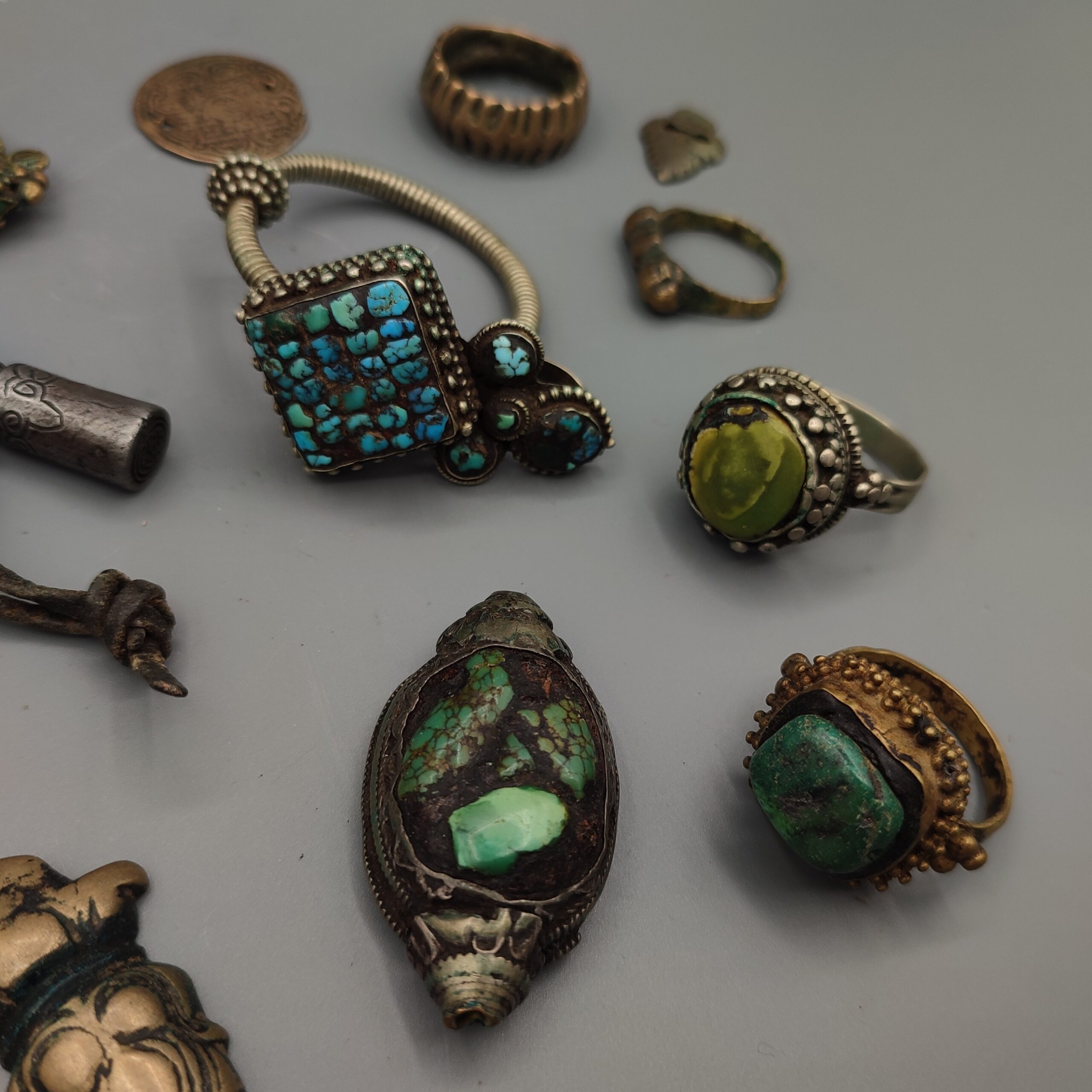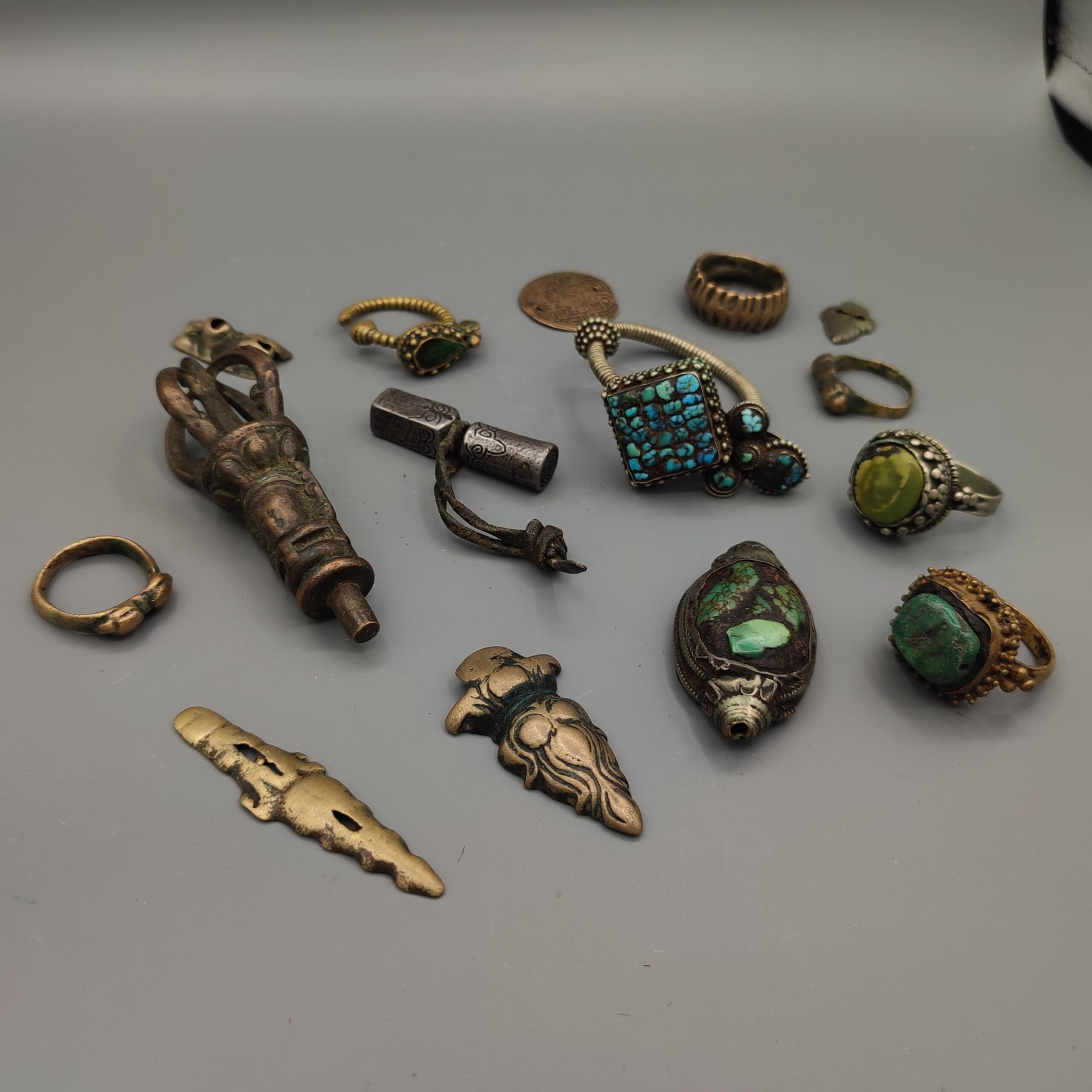 Set of 15 antique jewelry pieces from the 19th century Tibet made of silver, brass and semi-precious stones containing several rings, earrings and some religious pieces.