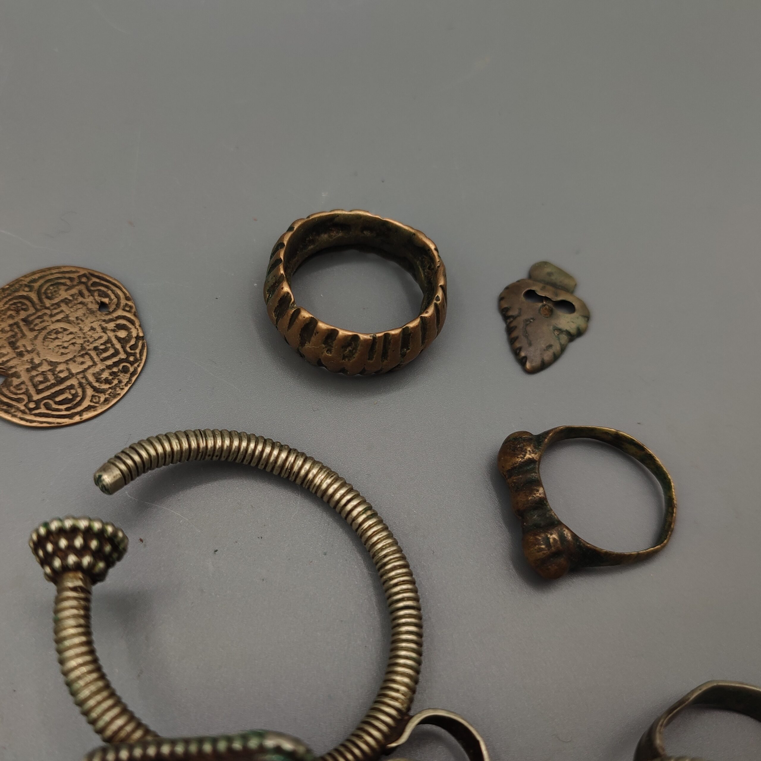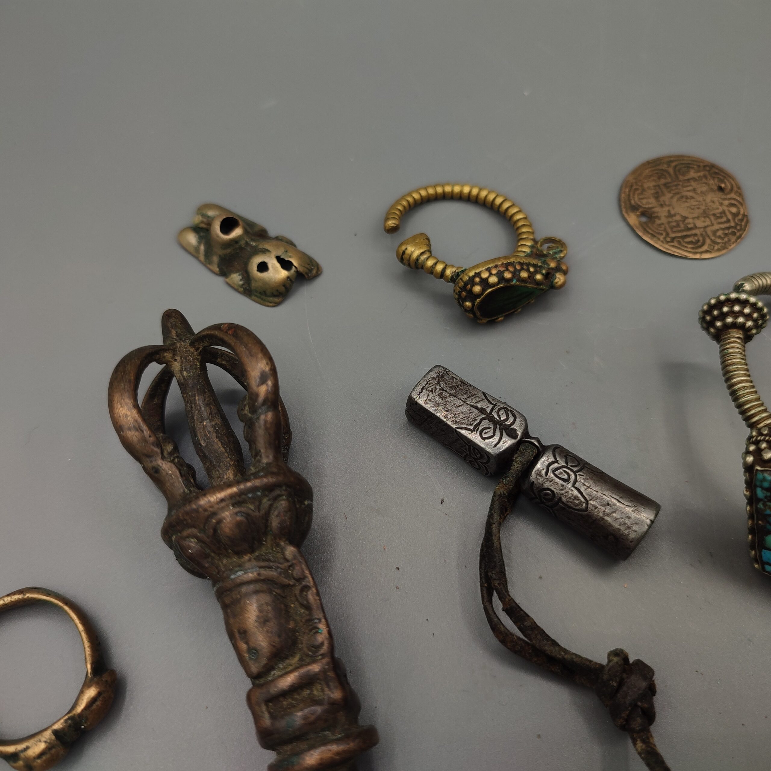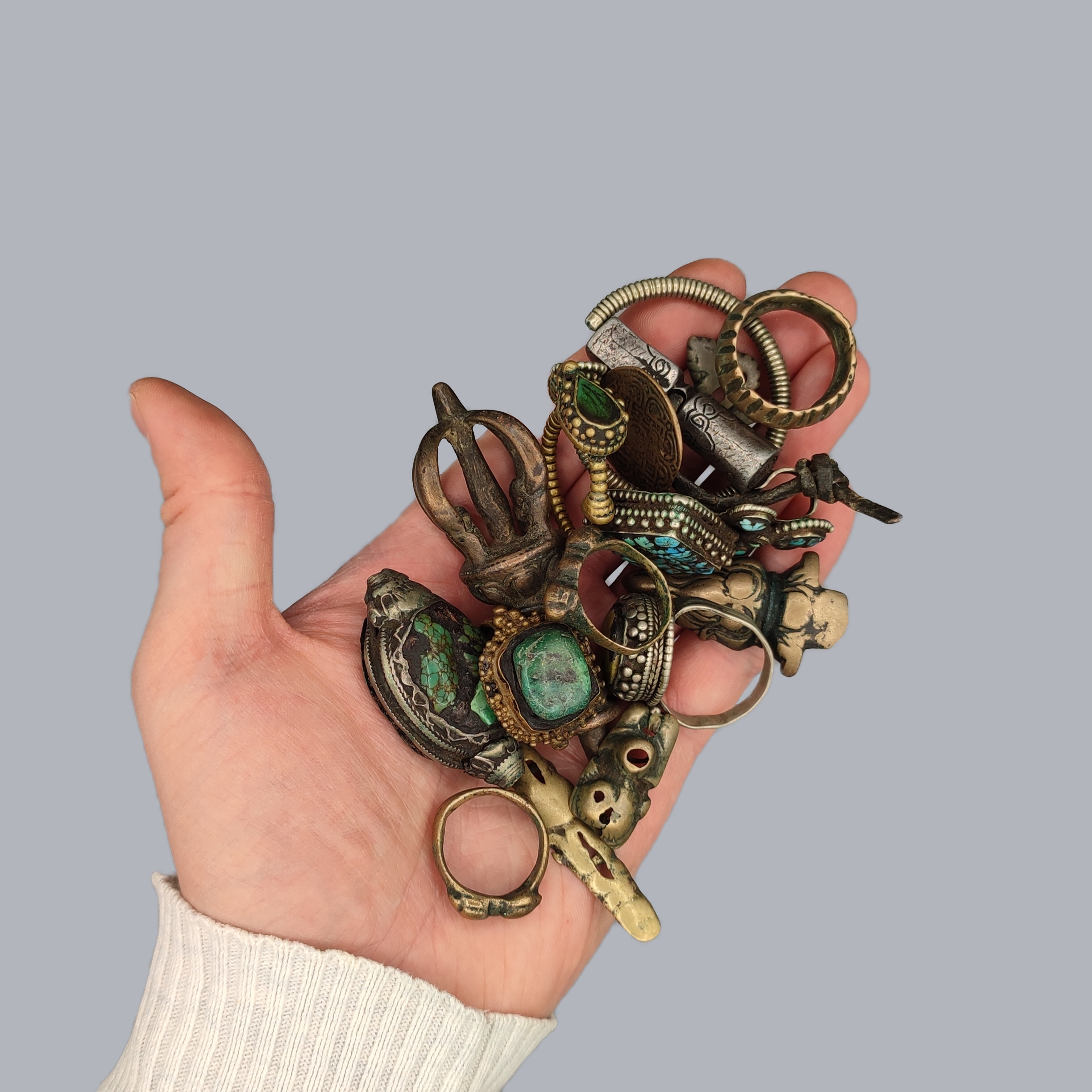 Set of 15 antique jewelry pieces from the 19th century Tibet made of silver, brass and semi-precious stones containing several rings, earrings and some religious pieces.